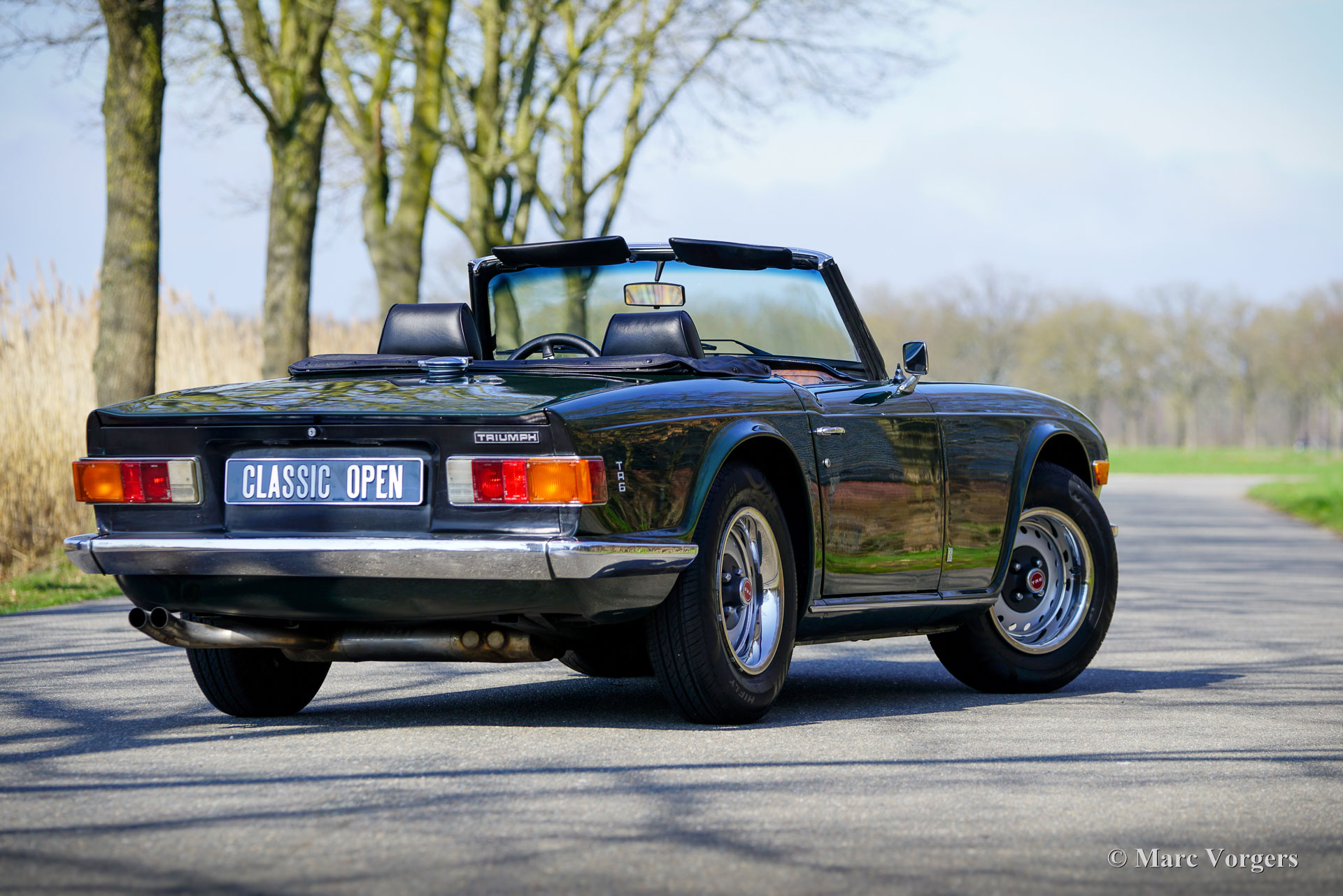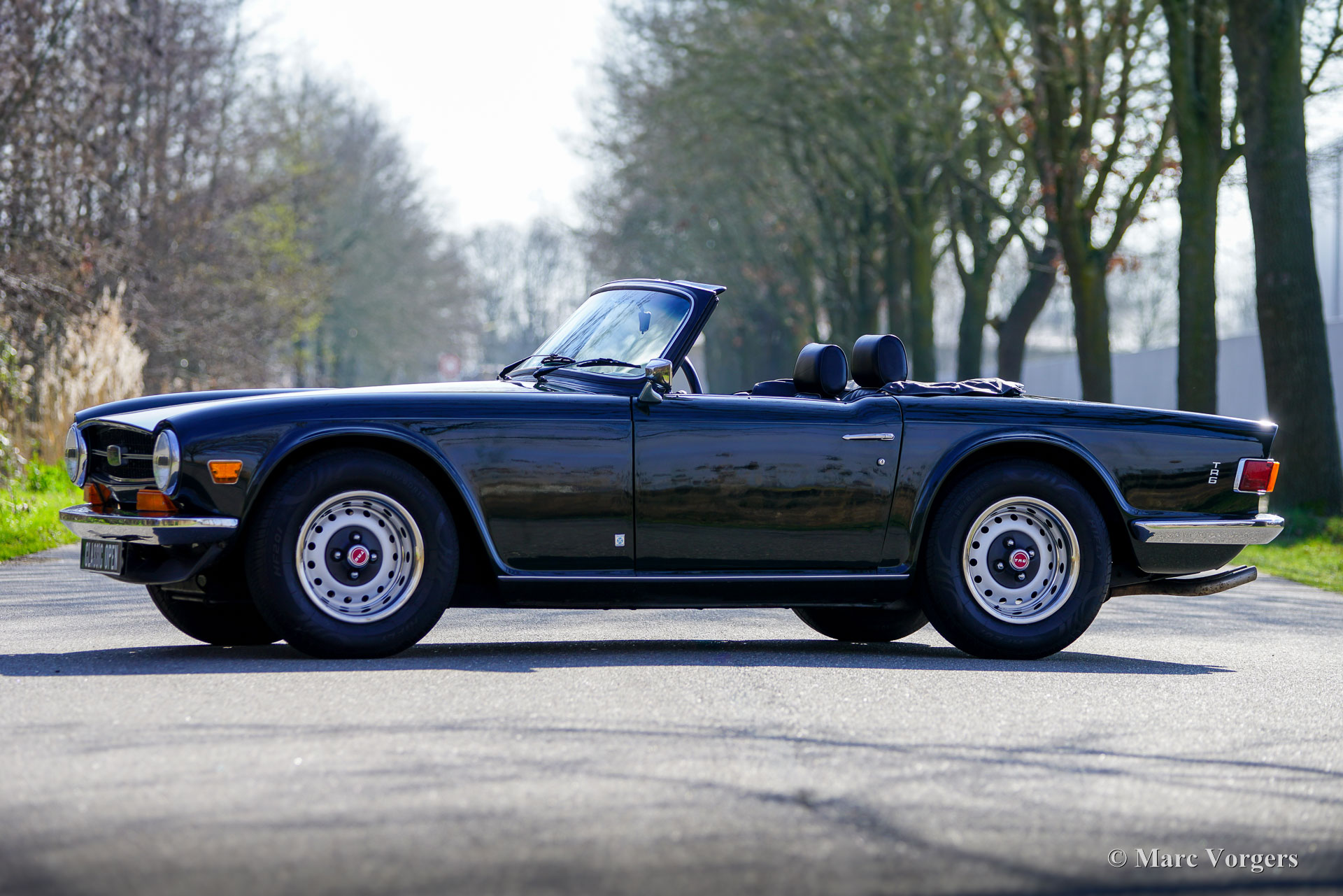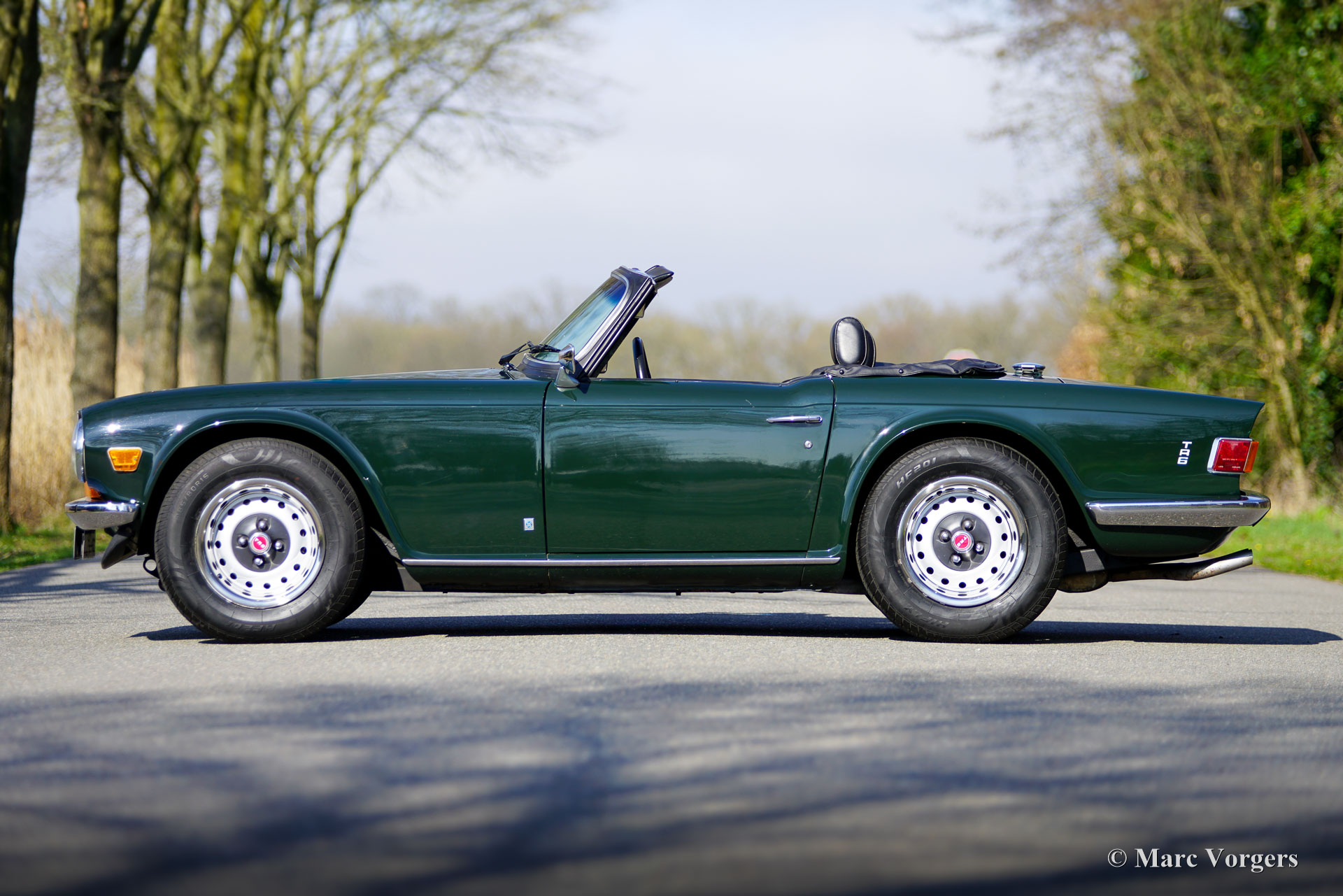 Triumph TR6, Jahr 1974. Dieser fantastische Triumph Roadster ist in British Racing Green lackiert und verfügt über eine schwarze Innenausstattung mit passendem schwarzem Teppichboden, einem schwarzen Vinyl-Verdeck und einer schwarzen Vinyl-Verdeck Abdeckung. Der Wagen wurde neu in den USA ausgeliefert und später in die Niederlande importiert. Über zwanzig Jahre lang wurde er von seinem Vorbesitzer gehegt und gepflegt. Der Zustand ist durchweg sehr gut, und er fährt sich hervorragend. Der 104 PS starke Sechszylinder-Motor läuft einwandfrei, und das Getriebe schaltet knackig und präzise. Der Overdrive rundet das Gesamtpaket ab und bietet effektiv einen fünften Gang sowie eine Zwischenübersetzung zwischen dem dritten und vierten Gang. Der Wagen wurde regelmäßig gewartet. Vor einigen Jahren wurde eine elektrische Servolenkung (EZ) eingebaut, und vor Kurzem wurden neue Antriebswellen verbaut. Der Innenraum ist mit speziellen schwarzen Leder-Komfort-/Sicherheitssitzen mit höheren Rückenlehnen und Kopfstützen, Dreipunkt-Sicherheitsgurten, einem wunderschönen Armaturenbrett aus Walnussholz, einem Schaltknauf aus Holz und einem Moto-Lita-Sportlenkrad mit schwarzem Lederkranz ausgestattet. Ein bemerkenswertes Detail ist das seltene originale British Leyland AM/FM-Radio mit 108 MHz, das damals als Händleroption erhältlich war. Zu den weiteren Originalmerkmalen gehören die robusten und sportlichen Stahlfelgen mit schwarzen Radkappen und der schwarze Spoiler unter der Frontstoßstange, die beide zur maskulinen Präsenz des TR6 beitragen. Der Triumph TR6 war das beliebteste Modell der gesamten TR2-TR8-Reihe und der letzte der traditionellen Triumph-Roadster. Er war besonders in den sonnigeren Bundesstaaten der USA beliebt und erwies sich als starker Konkurrent im amerikanischen Tourenwagenrennsport. Der größte Erfolg war der Gewinn der SCCA National C-Production (Group 44) Meisterschaft 1969 durch Bob Tullius. Dieser TR6 bietet ein wunderbares, klassisches Open-Air-Fahrerlebnis, untermalt vom unverwechselbaren Klang eines kraftvollen Sechszylindermotors.