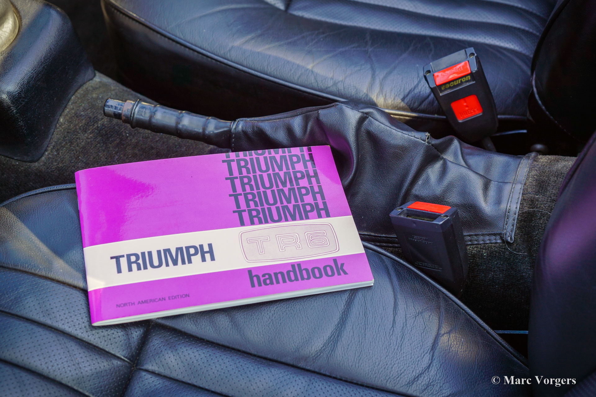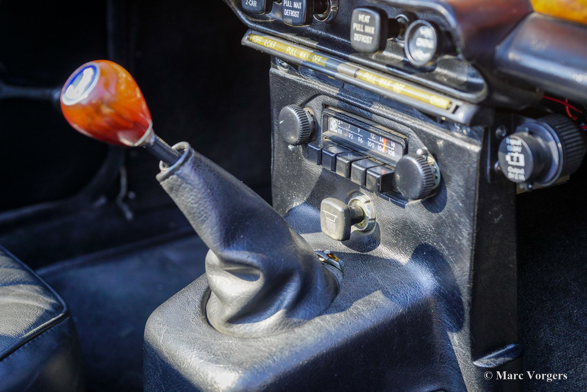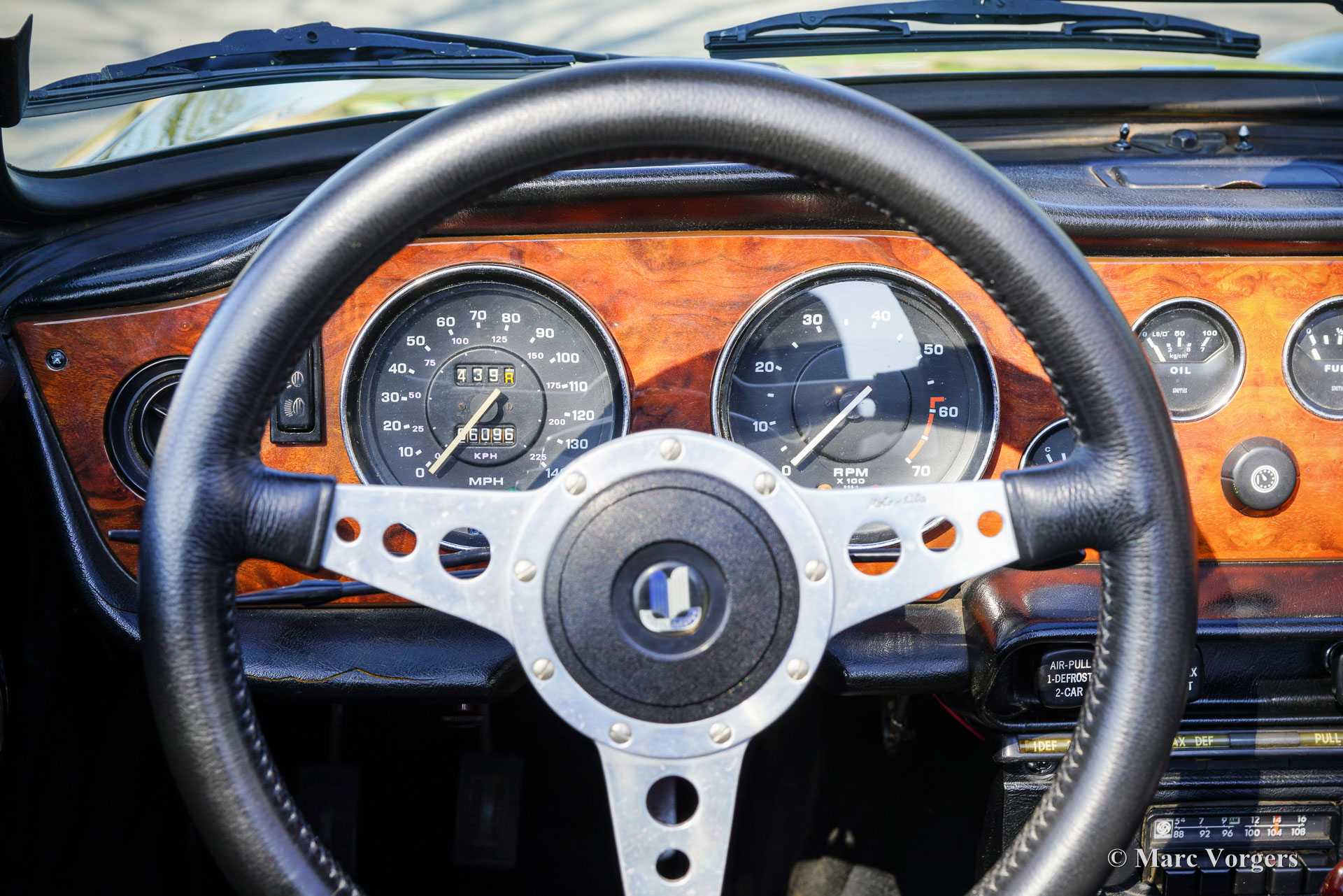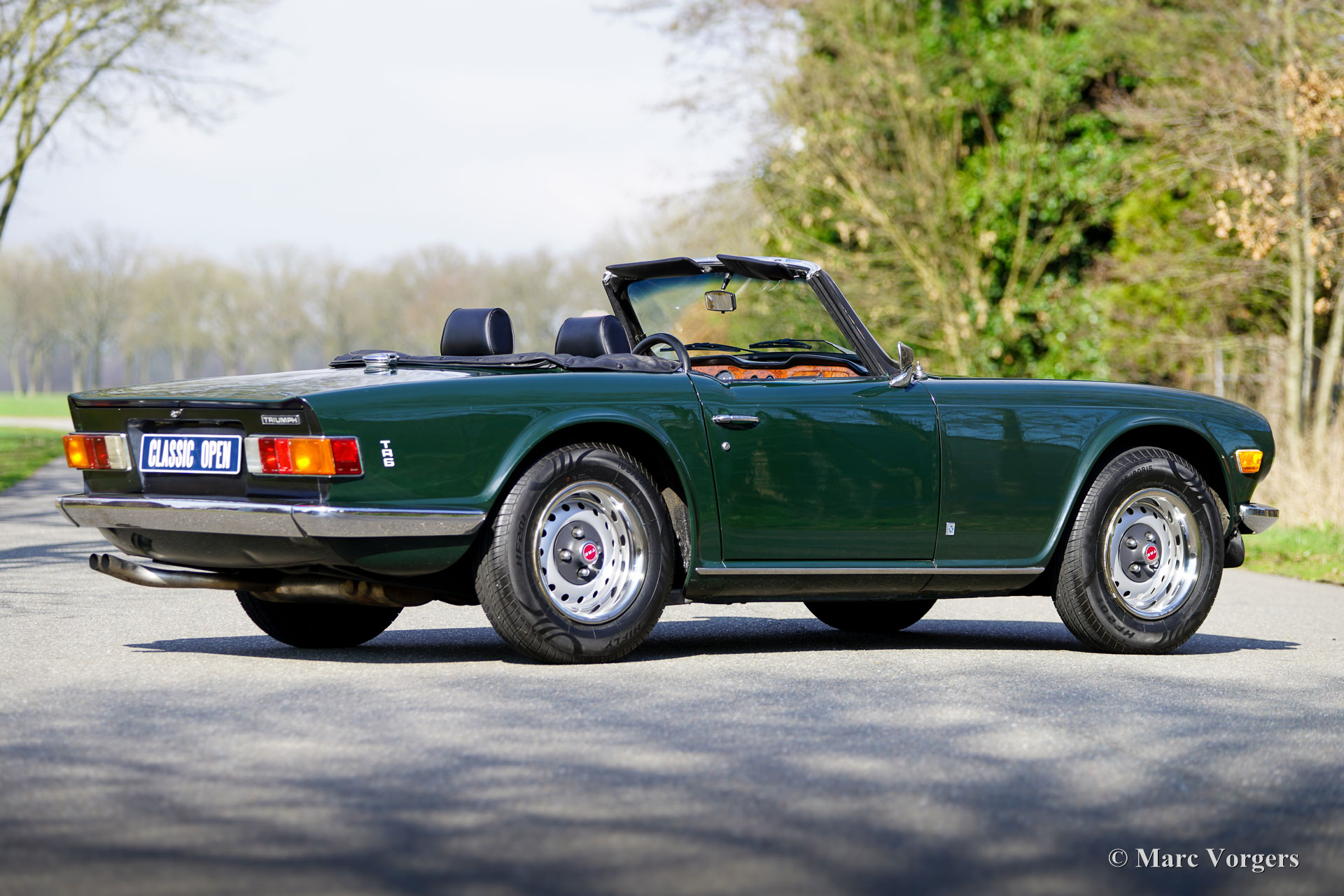 Triumph TR6, Jahr 1974. Dieser fantastische Triumph Roadster ist in British Racing Green lackiert und verfügt über eine schwarze Innenausstattung mit passendem schwarzem Teppichboden, einem schwarzen Vinyl-Verdeck und einer schwarzen Vinyl-Verdeck Abdeckung. Der Wagen wurde neu in den USA ausgeliefert und später in die Niederlande importiert. Über zwanzig Jahre lang wurde er von seinem Vorbesitzer gehegt und gepflegt. Der Zustand ist durchweg sehr gut, und er fährt sich hervorragend. Der 104 PS starke Sechszylinder-Motor läuft einwandfrei, und das Getriebe schaltet knackig und präzise. Der Overdrive rundet das Gesamtpaket ab und bietet effektiv einen fünften Gang sowie eine Zwischenübersetzung zwischen dem dritten und vierten Gang. Der Wagen wurde regelmäßig gewartet. Vor einigen Jahren wurde eine elektrische Servolenkung (EZ) eingebaut, und vor Kurzem wurden neue Antriebswellen verbaut. Der Innenraum ist mit speziellen schwarzen Leder-Komfort-/Sicherheitssitzen mit höheren Rückenlehnen und Kopfstützen, Dreipunkt-Sicherheitsgurten, einem wunderschönen Armaturenbrett aus Walnussholz, einem Schaltknauf aus Holz und einem Moto-Lita-Sportlenkrad mit schwarzem Lederkranz ausgestattet. Ein bemerkenswertes Detail ist das seltene originale British Leyland AM/FM-Radio mit 108 MHz, das damals als Händleroption erhältlich war. Zu den weiteren Originalmerkmalen gehören die robusten und sportlichen Stahlfelgen mit schwarzen Radkappen und der schwarze Spoiler unter der Frontstoßstange, die beide zur maskulinen Präsenz des TR6 beitragen. Der Triumph TR6 war das beliebteste Modell der gesamten TR2-TR8-Reihe und der letzte der traditionellen Triumph-Roadster. Er war besonders in den sonnigeren Bundesstaaten der USA beliebt und erwies sich als starker Konkurrent im amerikanischen Tourenwagenrennsport. Der größte Erfolg war der Gewinn der SCCA National C-Production (Group 44) Meisterschaft 1969 durch Bob Tullius. Dieser TR6 bietet ein wunderbares, klassisches Open-Air-Fahrerlebnis, untermalt vom unverwechselbaren Klang eines kraftvollen Sechszylindermotors.