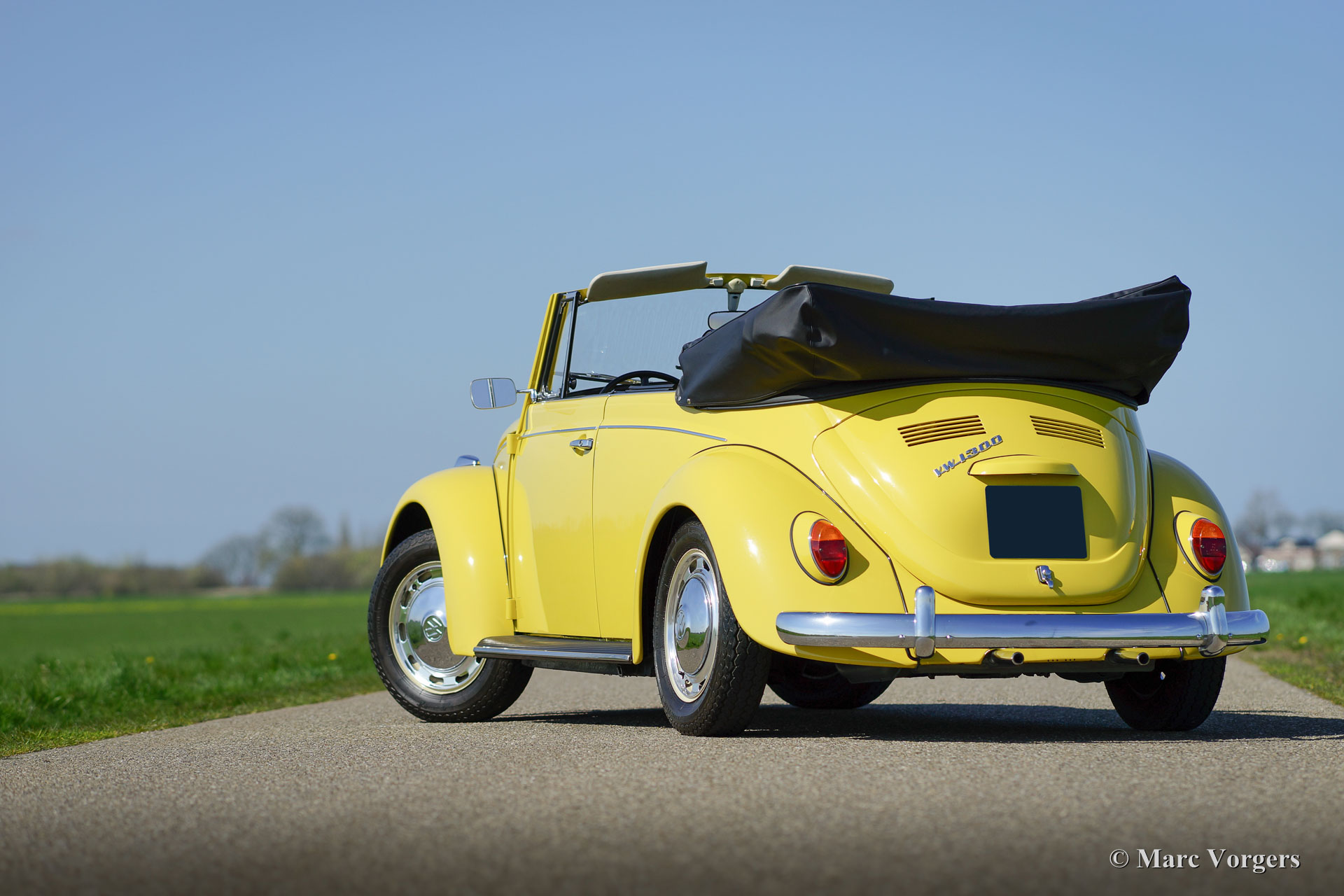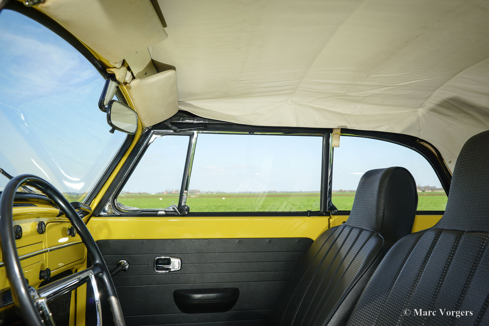 Volkswagen 'Käfer' (Beetle) 1300 Cabrio, Jahr 1971, Farbe Gelb mit einem schwarzen Vinyl Interieur. Schwarz Verdeck und schwarze Verdeck Abdeckung. Dieser schöne VW 'Käfer' Cabrio wurde vor ein paar Jahren aufwendig restauriert von einem niederländischen VW-Spezialist. Das Auto ist in einem hervorragenden Zustand und das Auto fährt herrlich! Der Innenraumverkleidung ist komplett original und in einem einwandfreien Zustand! Bereiten Sie sich vor auf einen schönen Sommer mit diesem großartigen VW 'Käfer' Cabrio!