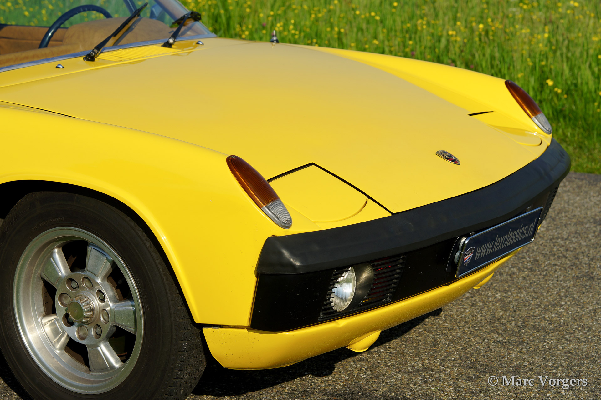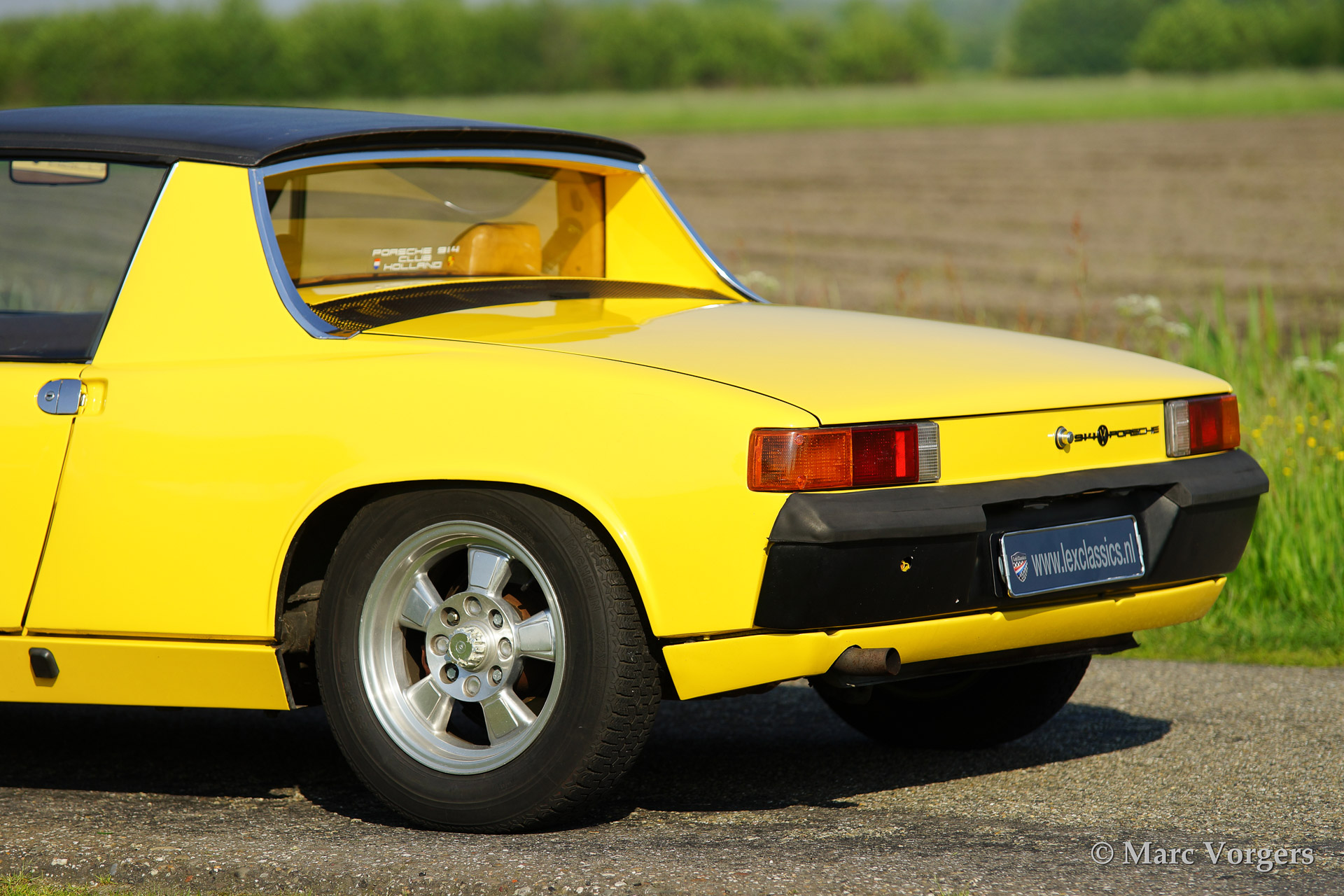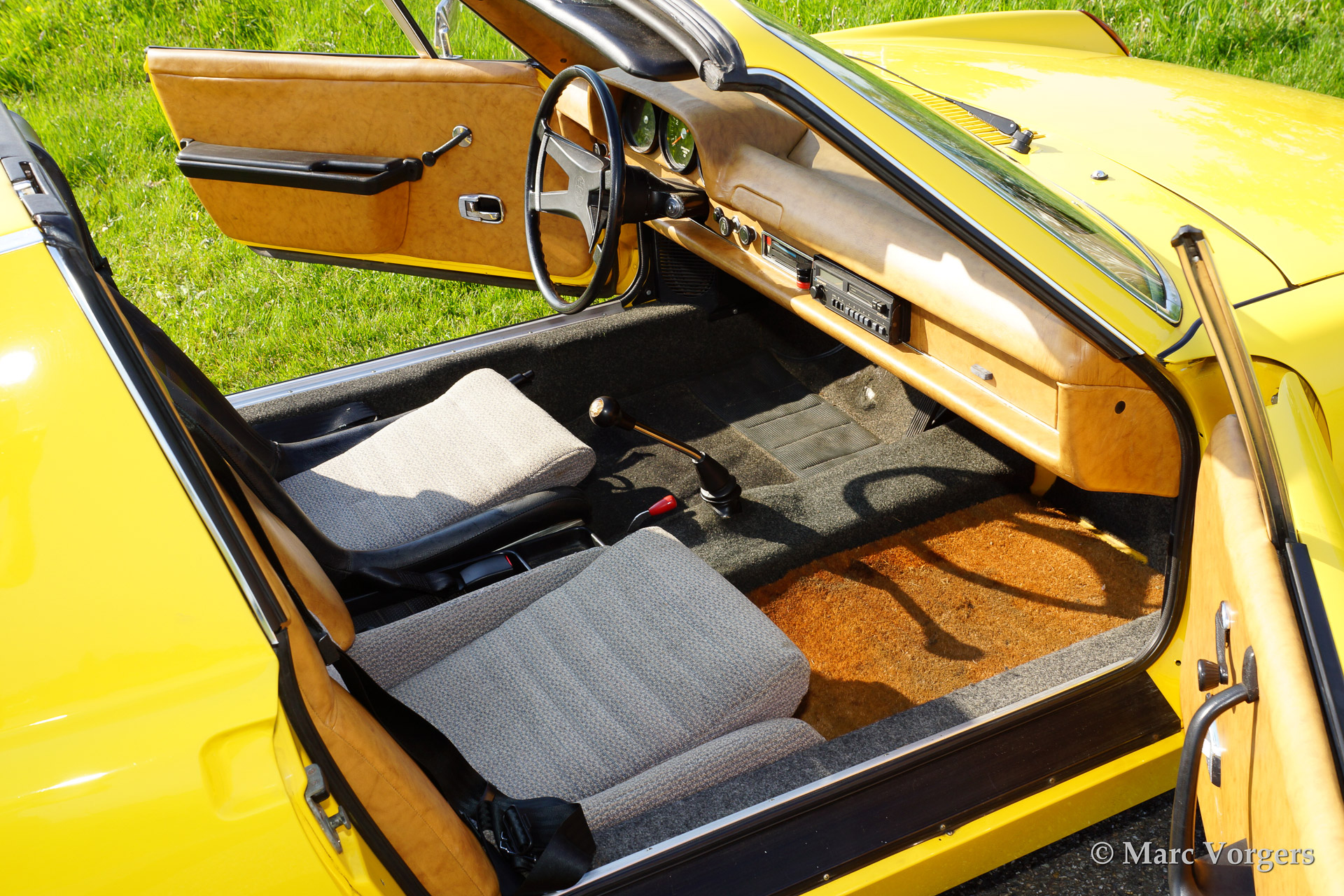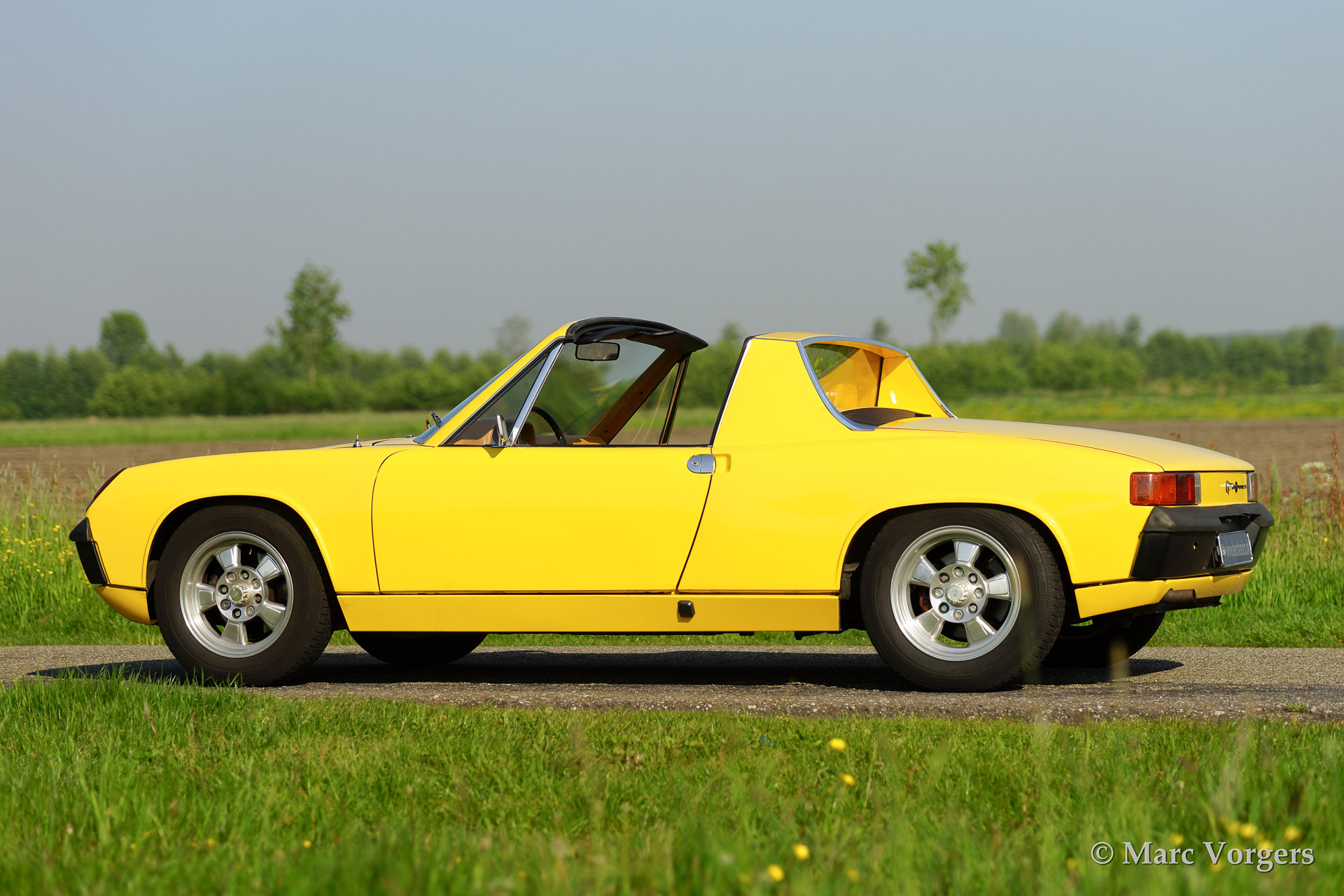 VW-Porsche 914 1.7L, year 1970. Colour yellow with a beige/black/grey interior. This VW-Porsche 914 was extensively restored. The originally black interior has been given a more luxurious appearance with beige leatherette covering the dashboard and the door panels. Special feature on the 914 is the detachable roof panel which can be stored in the rear compartment! With the roof panel in place luggage space is available in the front and the rear! This VW-Porsche 914 features alloy wheels, fog lamps at front and a car radio.