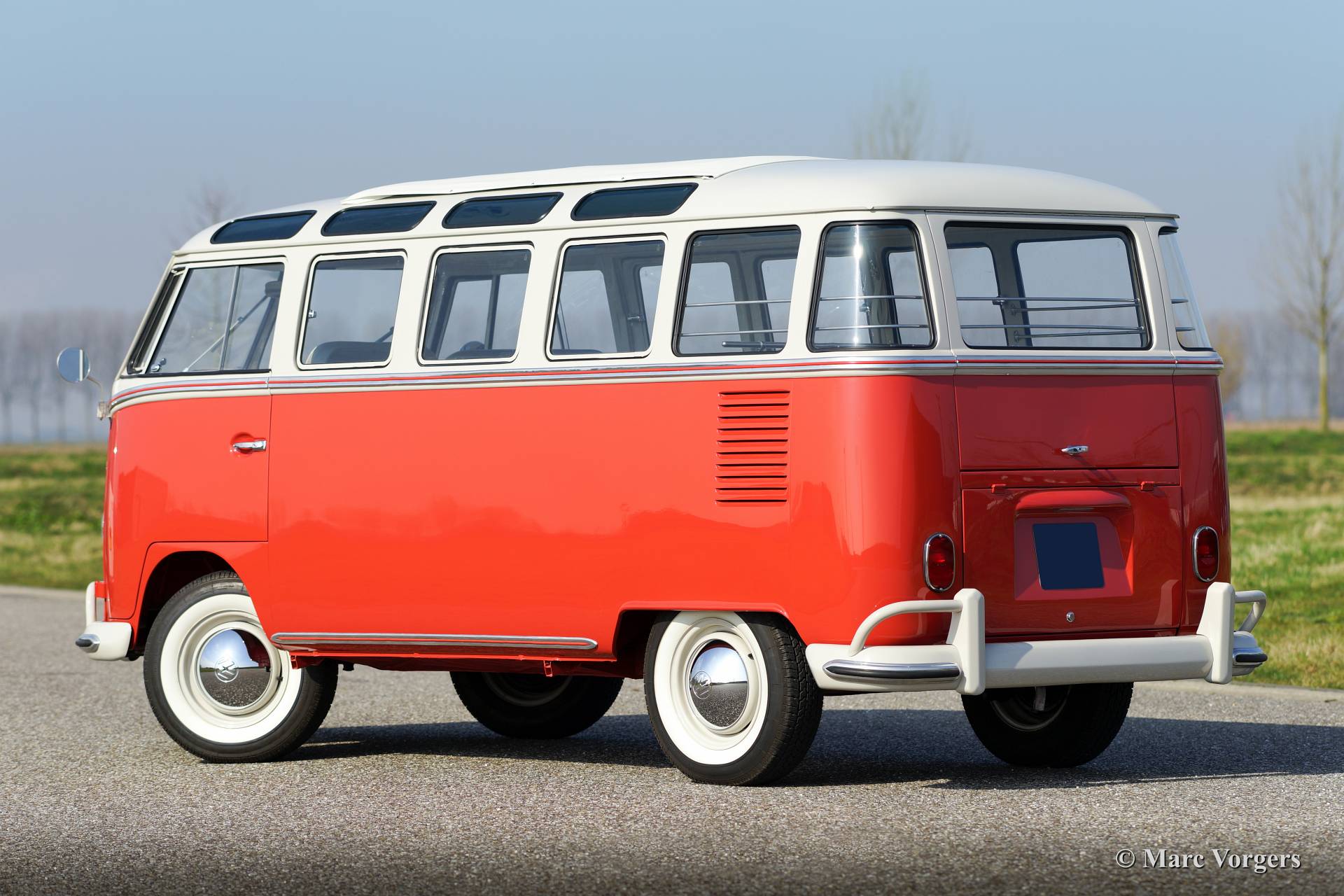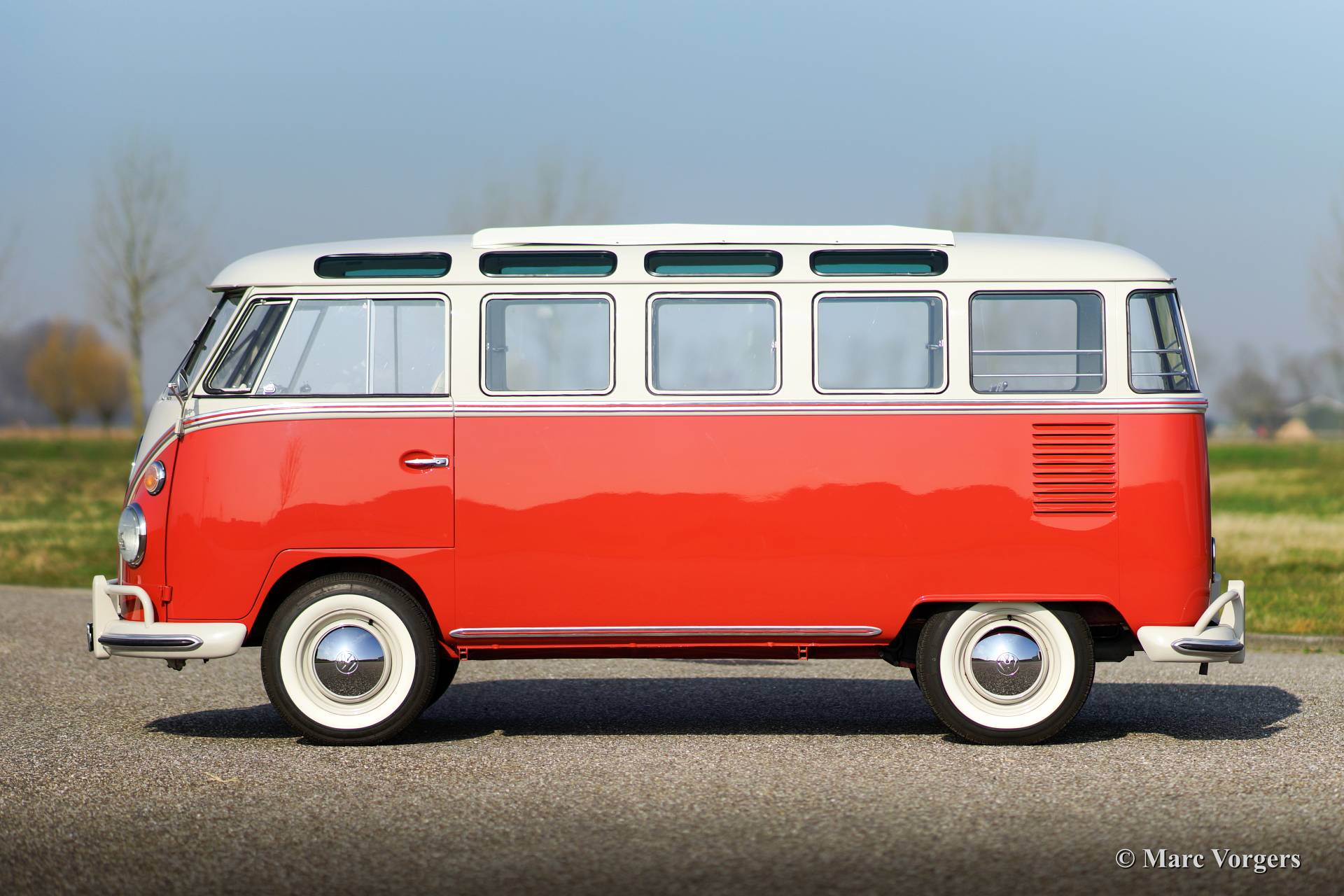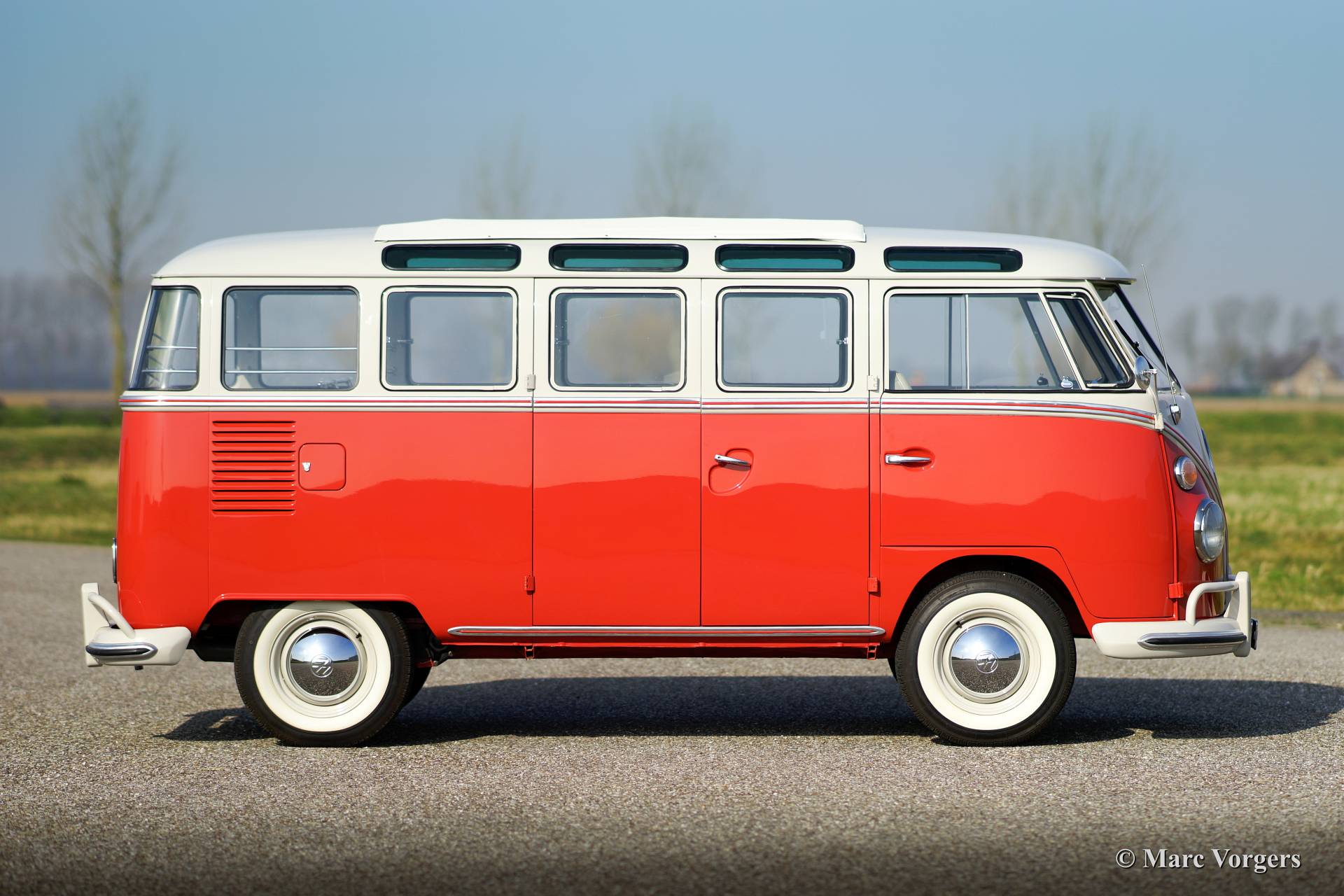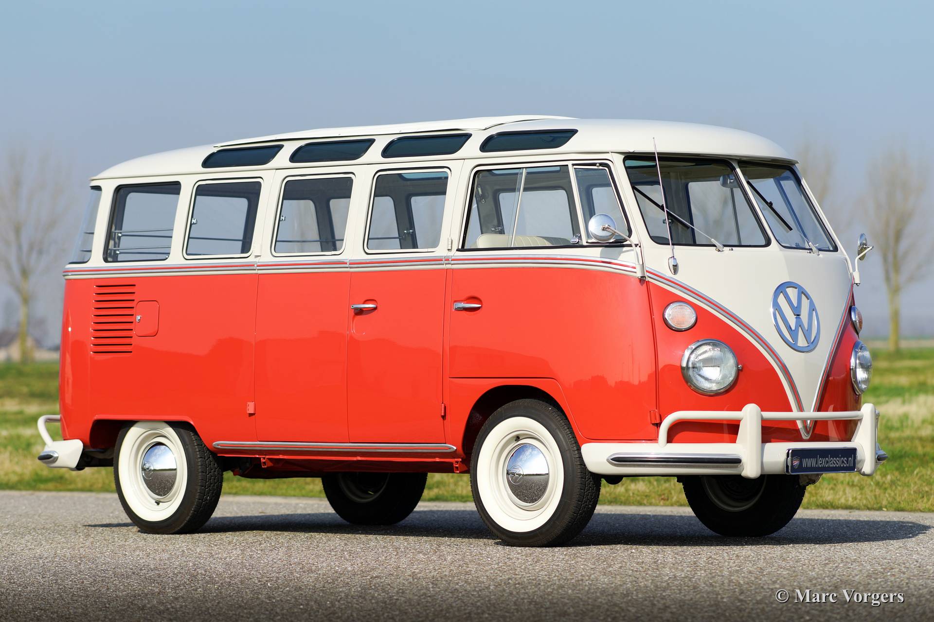 Volkswagen T1 Samba Bus, Jahr 1963. Fahrgestellnummer 1082XXX. Farbe Siegellack Rot mit Perl Weißem Dach und ein Basaltgrau farbiges Vinyl Interieur. Dieser wunderschöner VW Samba Bus ist ein gesuchtes 23 Fenster T1 Samba 'Deluxe' Modell. Die "Deluxe" bietet einen sehr großen Schiebe- / Faltdach aus Stoff und Vinyl! Der VW Samba Bus wurde im Jahr 2008 aus den USA in die Niederlande eingeführt. Anschließend wurde eine umfassende Restaurierung begonnen, in dem Kosten noch Mühen gespart wurden, um Perfektion zu erreichen. Die Restaurierung war im Jahr 2013 fertig. Das Automobil hat nur 114 Kilometer gefahren seit Beendung der Restauration. Diese 23 Fenster Samba Bus ist in einem hervorragenden Top-Zustand, concours!