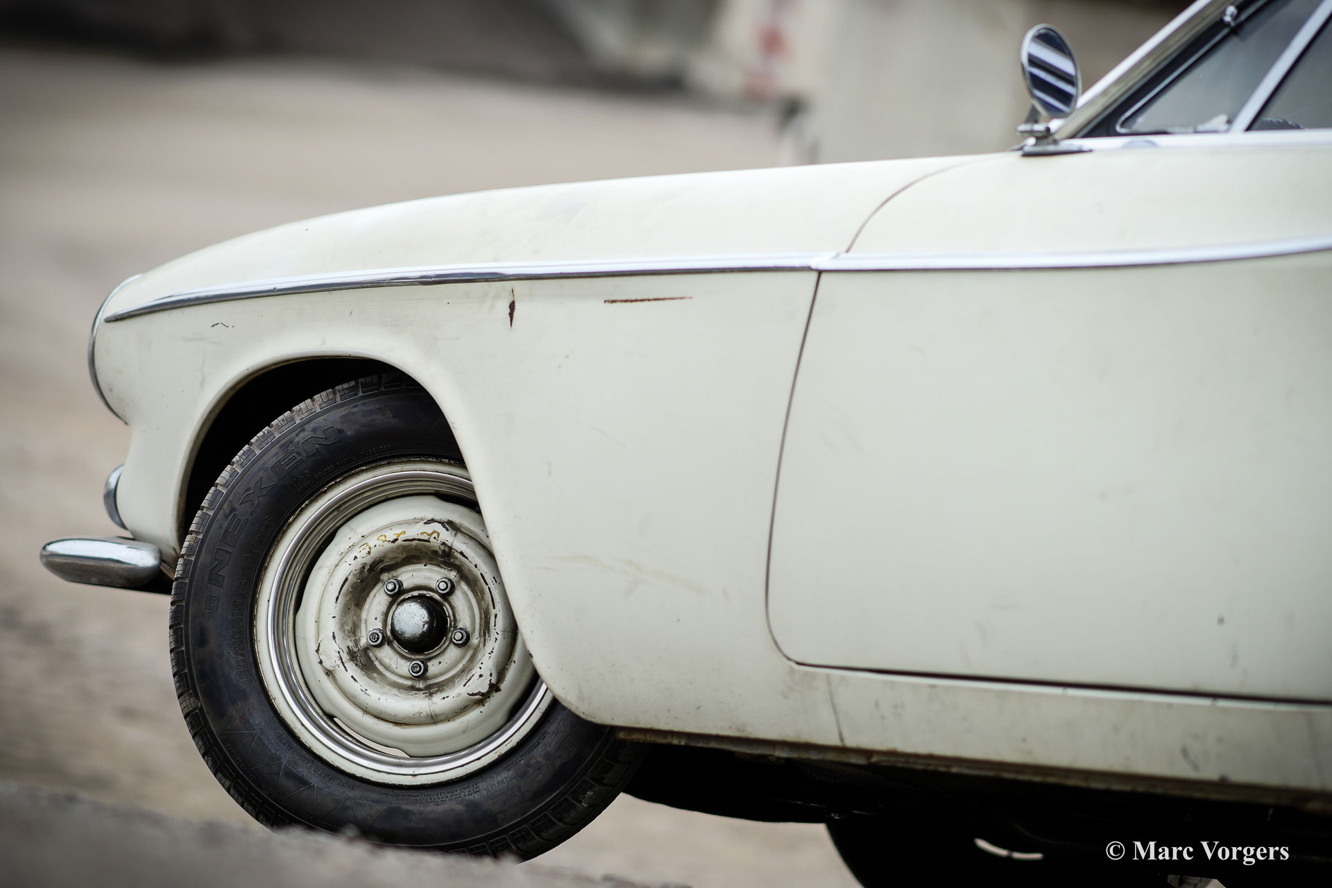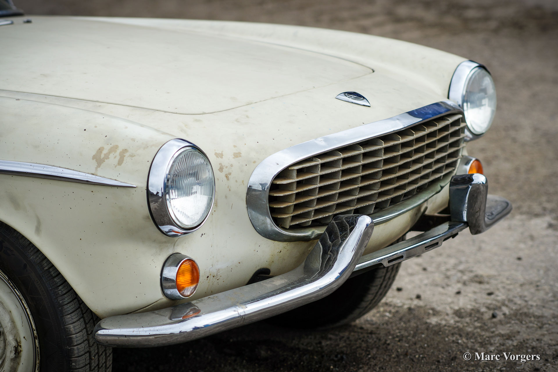 Volvo P1800 S, Baujahr 1964. Farbe Elfenbein weiß mit einer roten Lederausstattung. Dieses 'Scheunenfund' Volvo P1800 S wurde aus Amerika importiert. Das Auto war genau so gefunden, wie man es auf den Bildern sieht! Voll Original und mit einem perfekt rostfreien Karosserie! Das P 1800 zeigt schone Passungen der Blechteile, wurde nie restauriert, und das Auto hatte nie Schaden. Nur der linke Kotflügel weist einen tieferen Kratzer auf. Der Original-Lack zeigt sich stumpfer als taub, etwas Farbverlust zeigt sich auch hin und her auf, und der Innenraum zeigt spuren des Alters und gebrauch die weit "Patina" hinaussteigen. ABER: dieses Volvo P1800 S ist in eine so gute und ehrliche ursprünglichen Zustand, dass wir entschieden, nichts zu berühren!