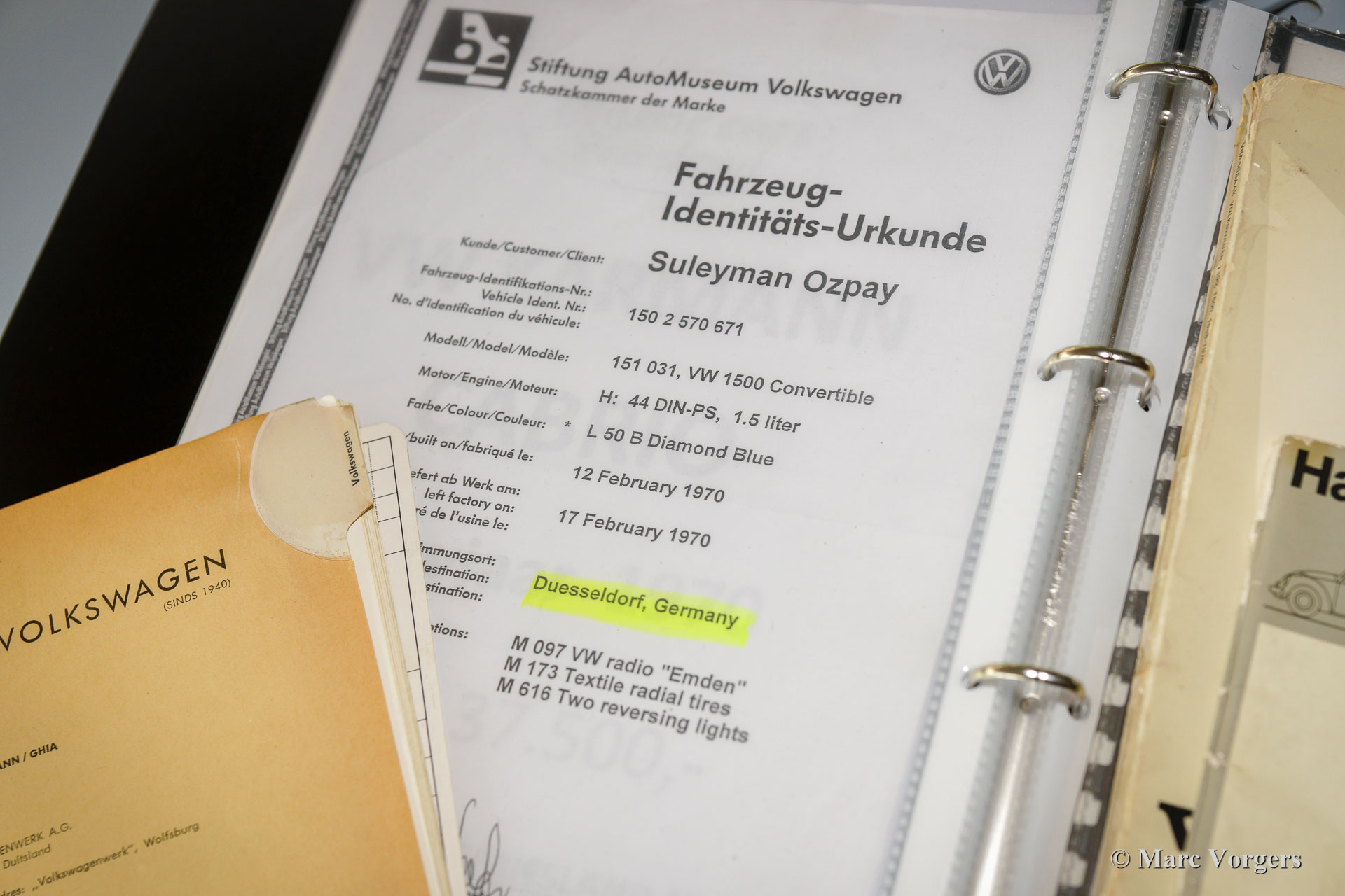VW ‘Käfer‘ 1500 Cabriolet, Jahr 1970. Farbe Diamant Blau (VW Farbcode LB 50) kombiniert mit einer schwarzen Kunstlederausstattung. Schwarzes Vinyl-Sonnenland-Verdeck und schwarze Kapuze. Dieser prächtige VW ‘Käfer‘ ist super originell, das Auto hat ‘matching numbers‘ (Chassis, Motor, Getriebe alle original ab Werk) und die originalen Farben! Dieser wunderschöne Volkswagen ‘Käfer‘ wurde neu in Deutschland verkauft und das Automobil wurde in den letzten Jahren in den Niederlanden aufwendig und sehr schön wiederhergestellt. Das Auto ist in einem ausgezeichneten Zustand (Concours) und das Auto fährt herrlich! Das Auto wird mit niederländischen Originalhandbüchern und einer Kopie des VW Identitäts-Dokuments geliefert. Das Auto ist derzeit in den Niederlanden registriert. Dies ist ein sehr wünschenswertes Exemplar!