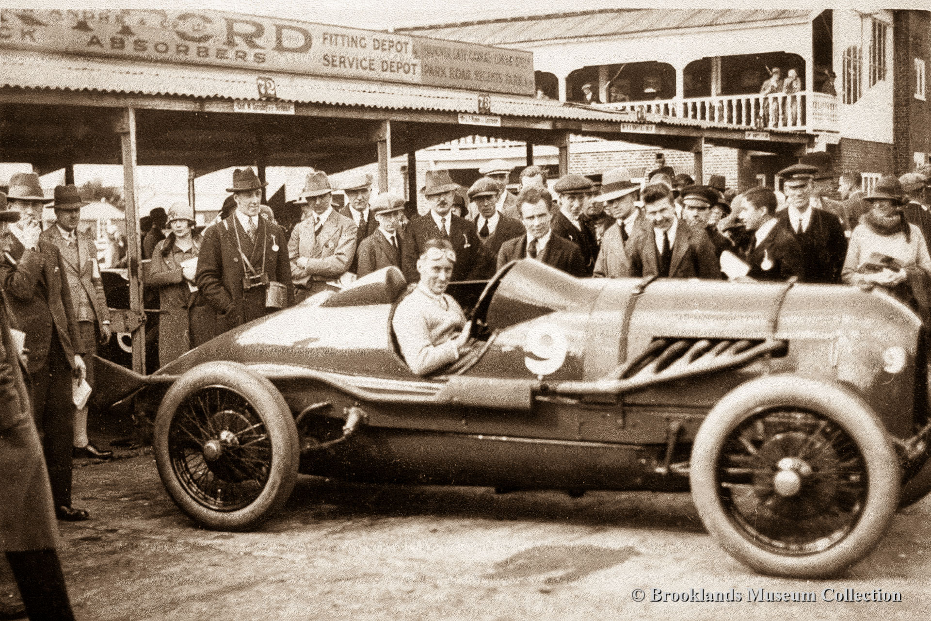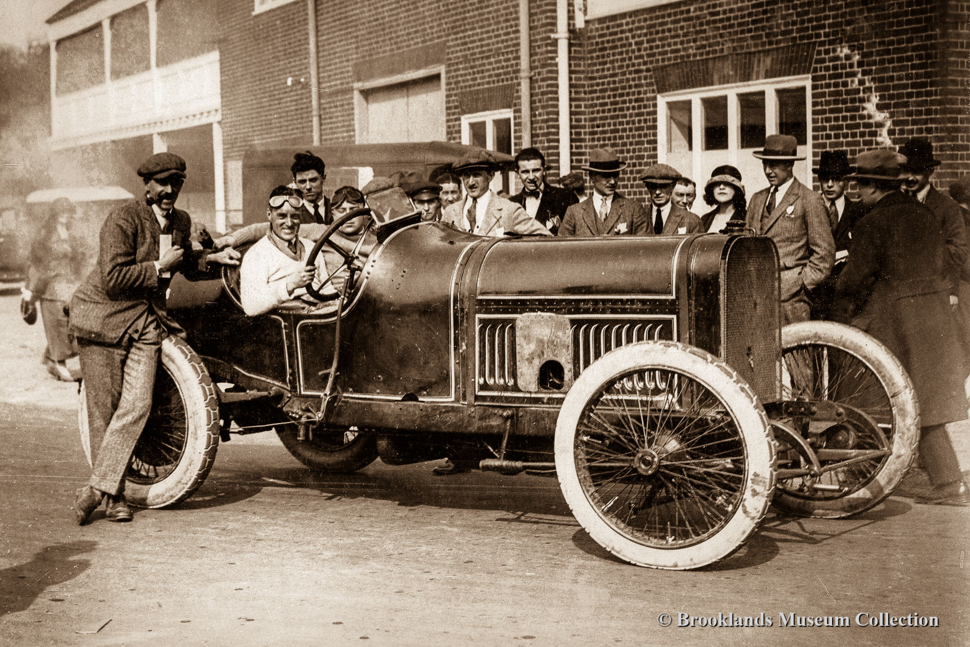 27 6 cylinder 4 Litre Sunbeam with Campbell in front of the Vickers aircraft factory flanking the 'fork' of Brooklands track