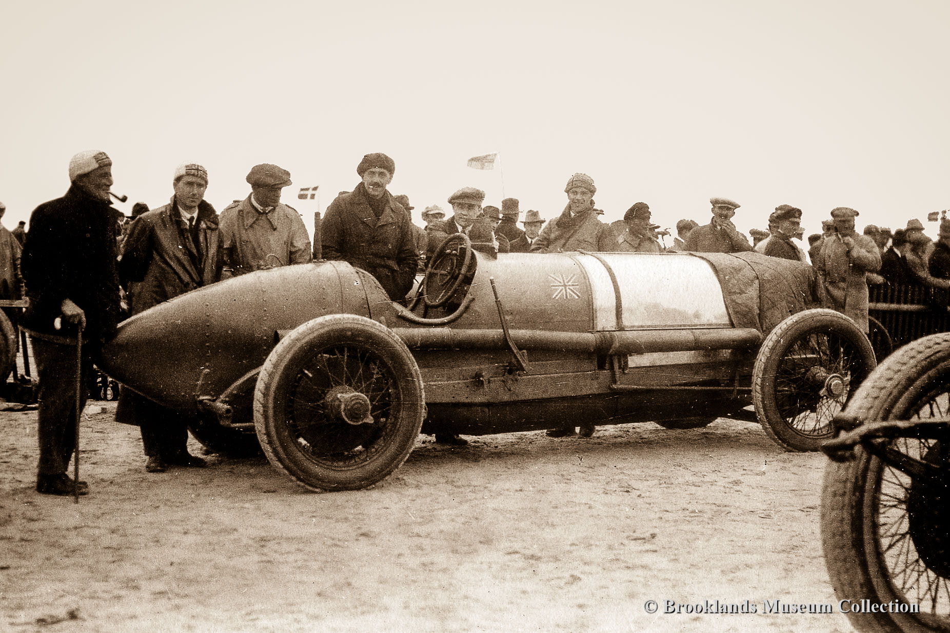 19 Sunbeam 350 HP record car. Designer Coatalen with hat and Sammy Davis behind the wheel. In May 1922 Kenelm Lee Guinnes set three records driving the 350 HP Sunbeam. The Brooklands lap record at 123.30 mph (198.43 km/h), then the world land speed record over a mile at 129.17 mph (207.88 km/h) and over a kilometre at 133.75 mph (215.25 km/h) – this was the last land speed record to be set on the Brooklands track.