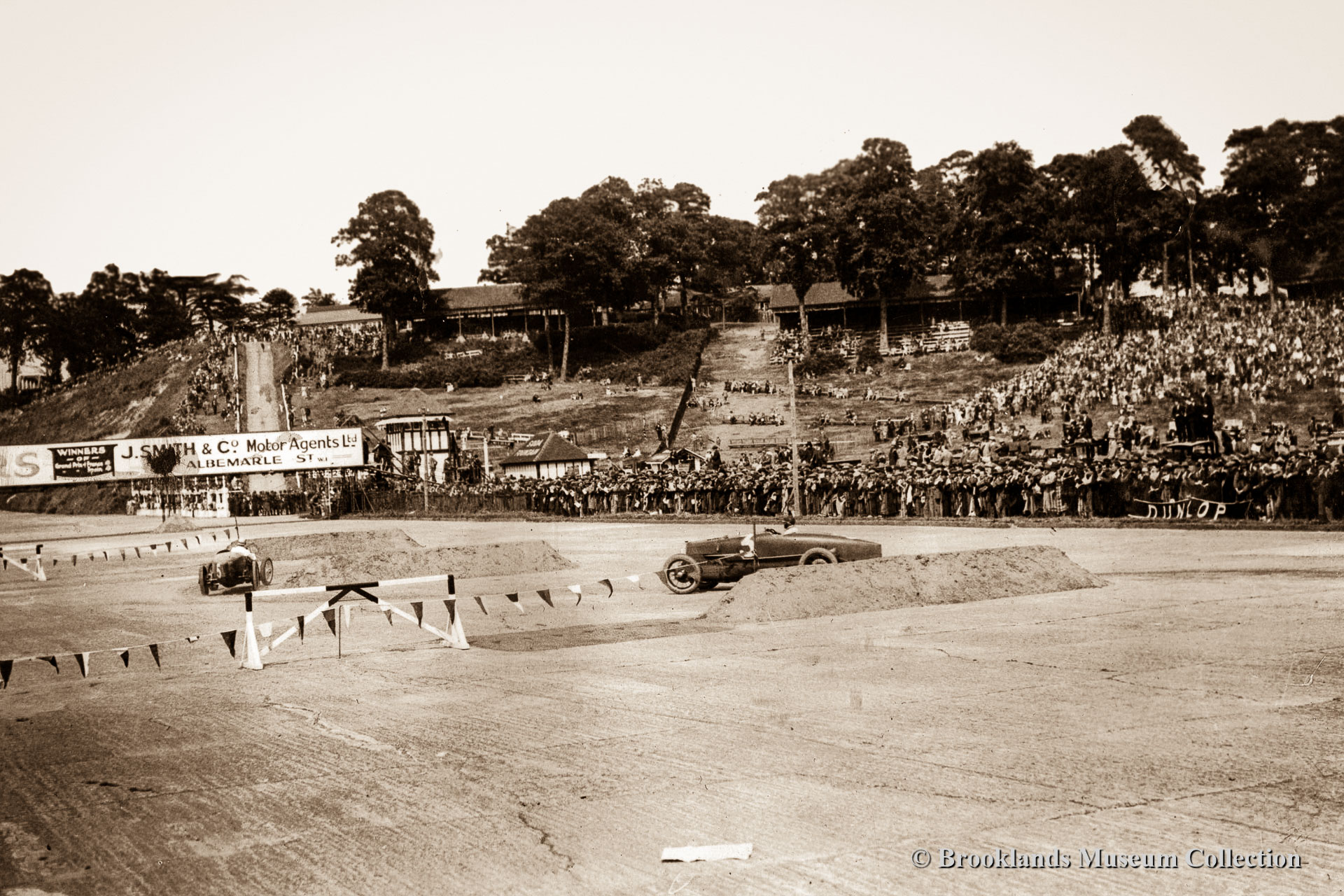 Below the photo descriptions you will find short original Pathe films of the Junior Car Club (JCC) 200 Miles race of 1923, the JCC Double Twelve race of 1930 and a film featuring the winning Napier Railton and John Cobb in the Brooklands Automobile Racing Club (BARC) 500 Miles race of 1935.