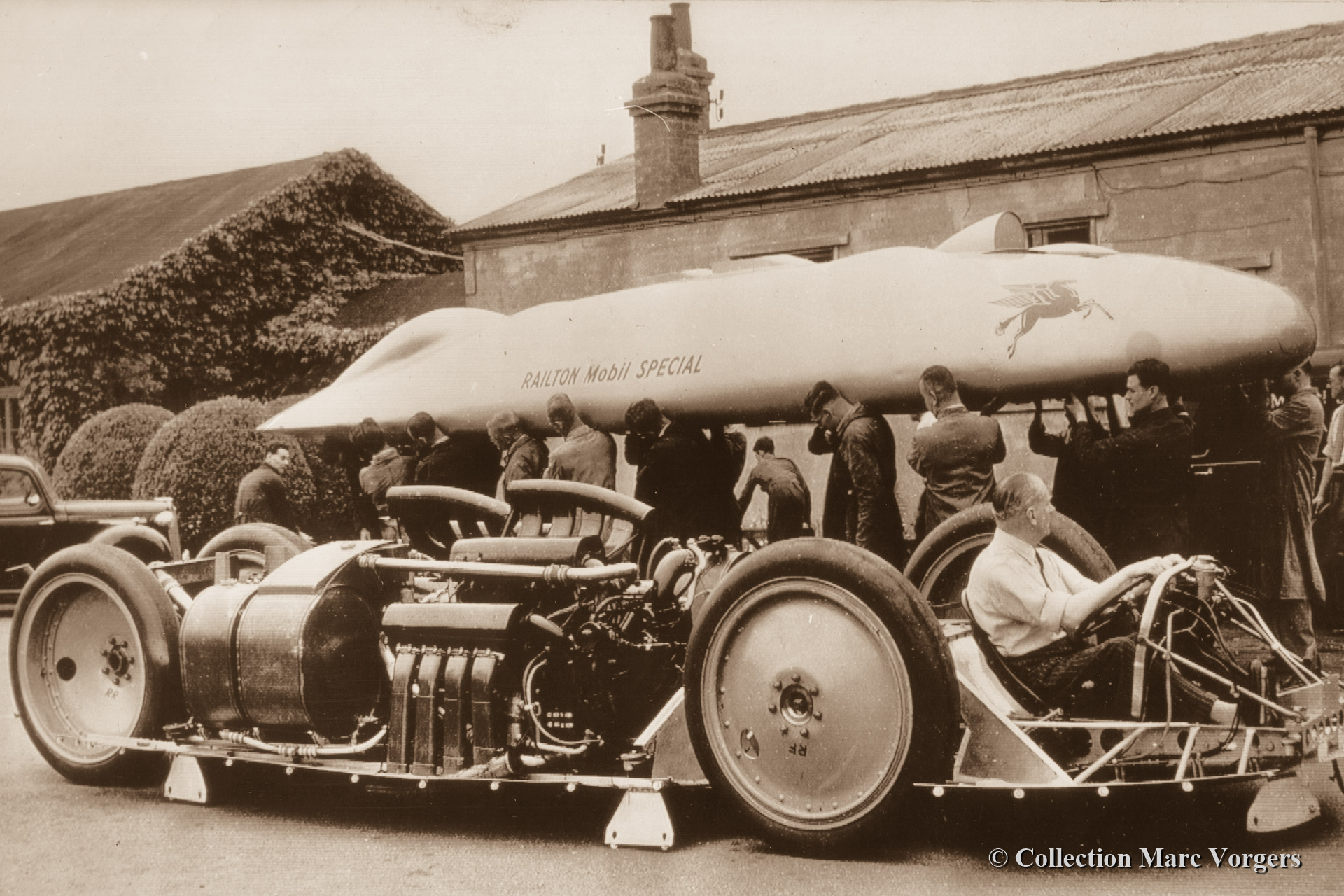 90 A great shot of the Railton Mobil Special showing John Cobb in charge, the big Napier Lion aero engines (driving all four wheels). About 6-8 men were needed to put the bodywork in place. Weight about 200 kg.