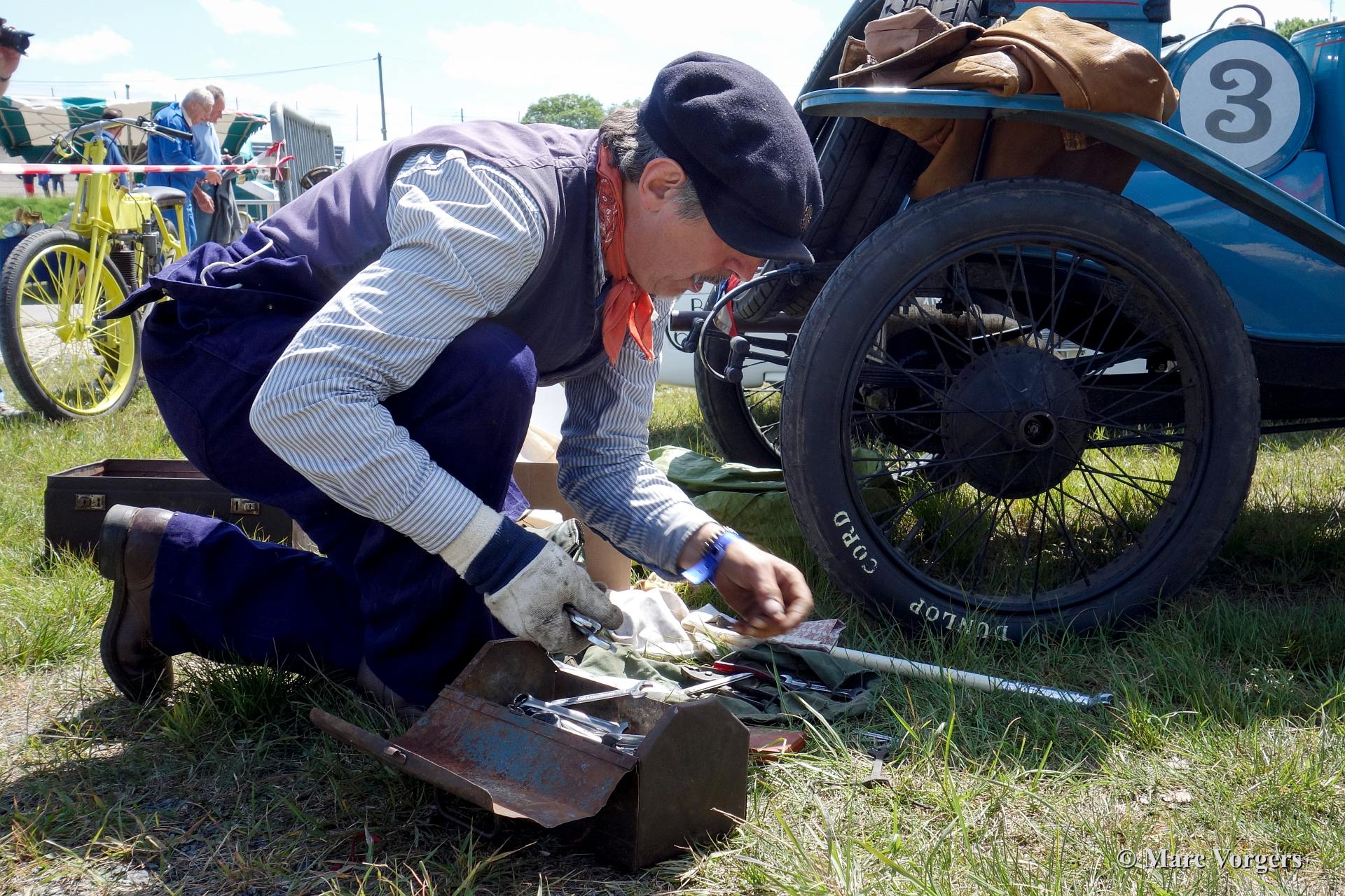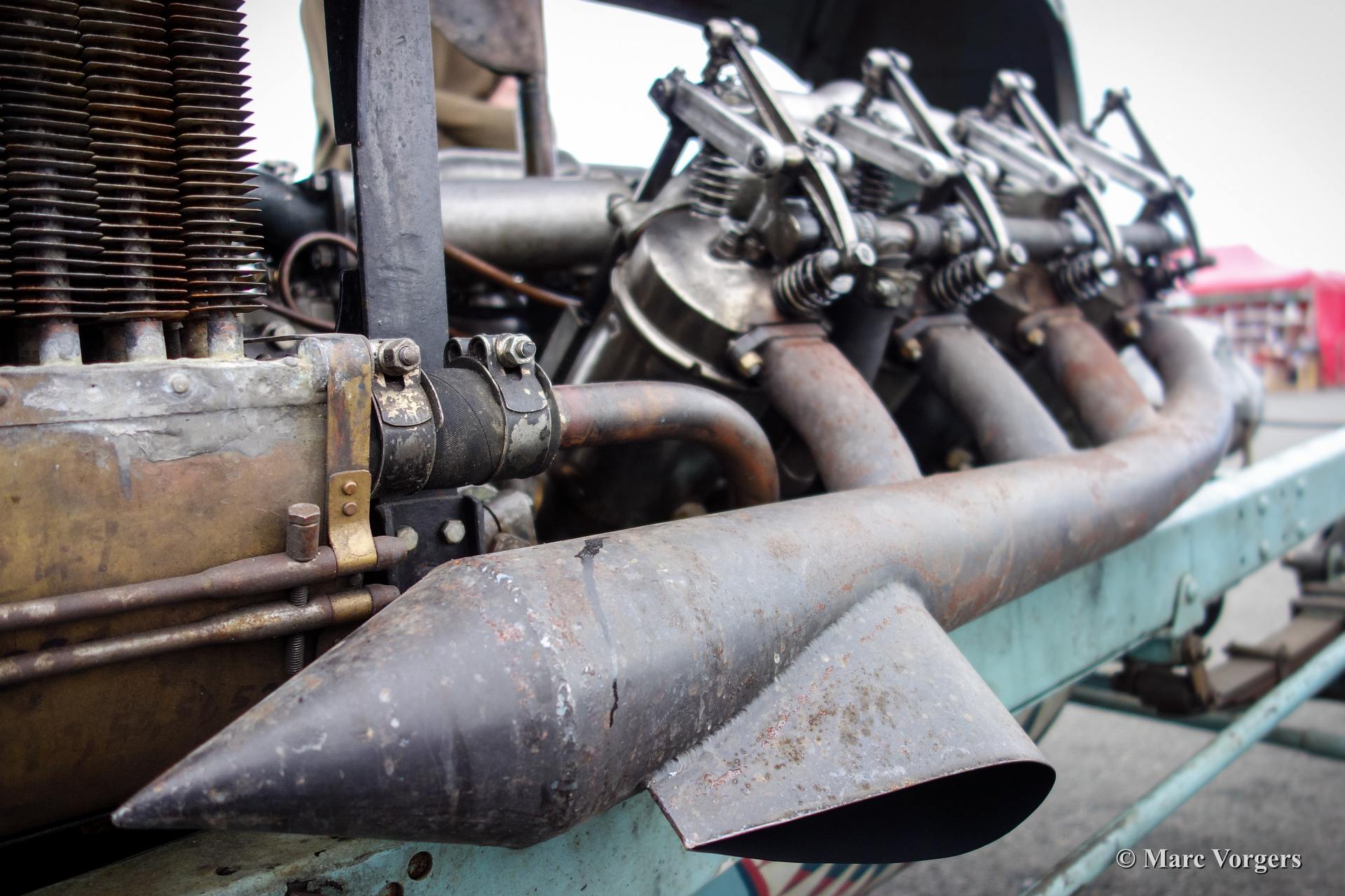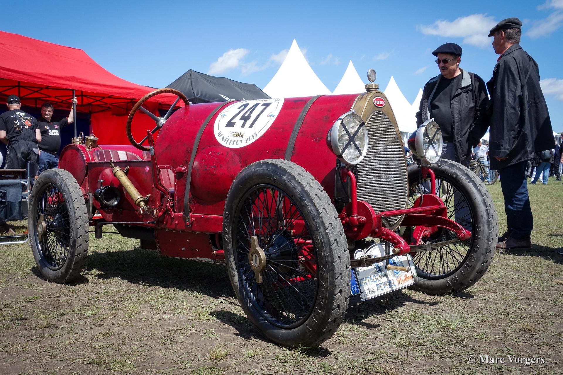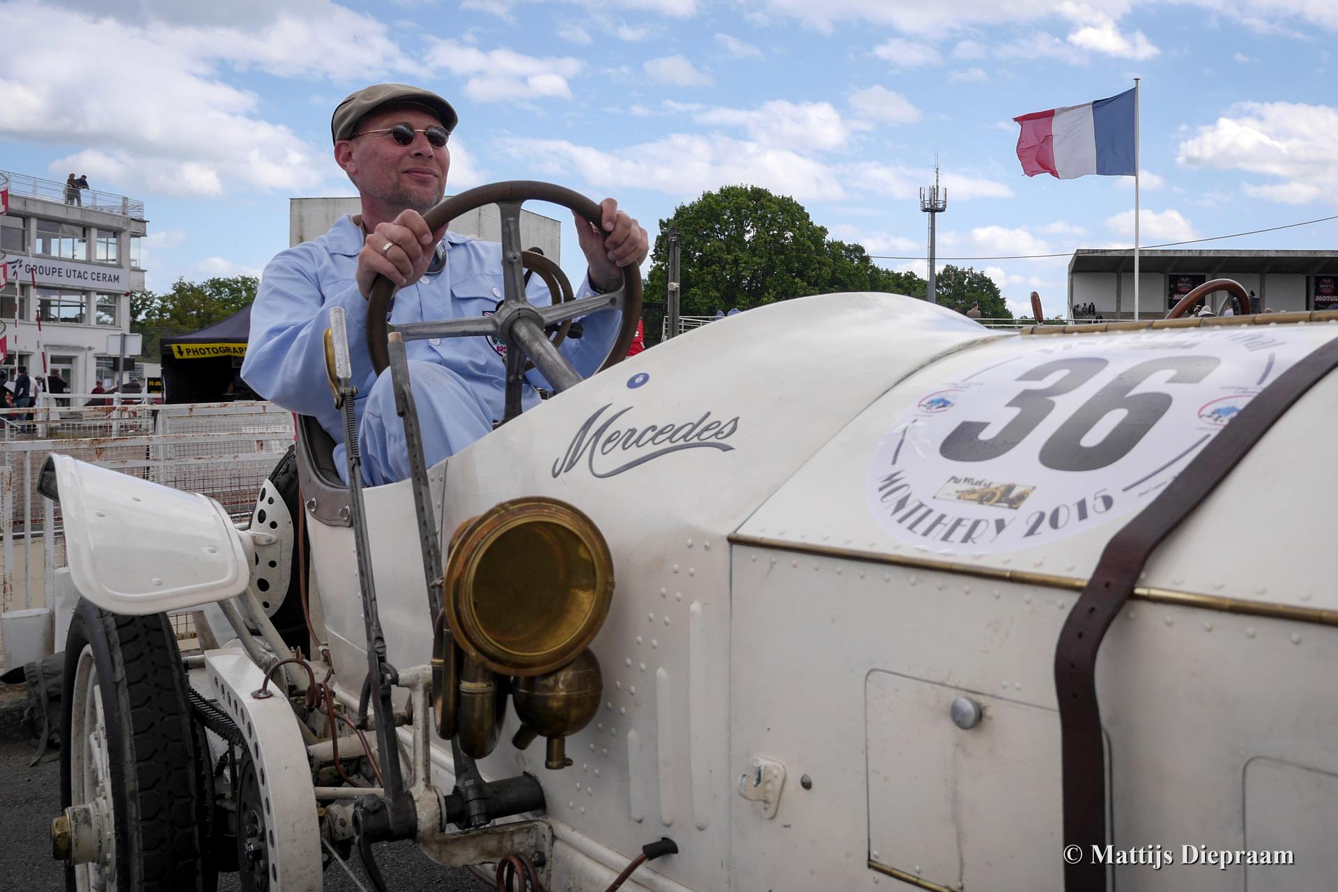 On day three we took the magnificent scenery tour from Mulhouse to Montlhery along Belfort and the N19/E54 from Vesoul to Langres where we found a little piece of England in the village of Cintrey. Here we took photos of our party and the Rover in front of an old garage with great Castrol and Champion advertisements on the wall! The distance of just under 600 kilometres was covered quickly so we arrived at the Montlhery banked circuit in the early afternoon. On the Vintage Revival the clock was turned back several decades… For two days we found ourselves visiting the 1920ies and 1930ies with some added imagination. You only have to suppress out of style details like the modern racing helmets and people clad in too modern overalls and clothes… During this delightful event we witnessed many old Bugatti’s still being driven, raced and cherished by their owners. The other cars and marques where as impressive. Yours truly drooled over the original 1908 Grand Prix Mercedes for a long time… And finally sat down in the seat of the car in which Christian Lautenschlager won the 1908 French Grand Prix in Dieppe.