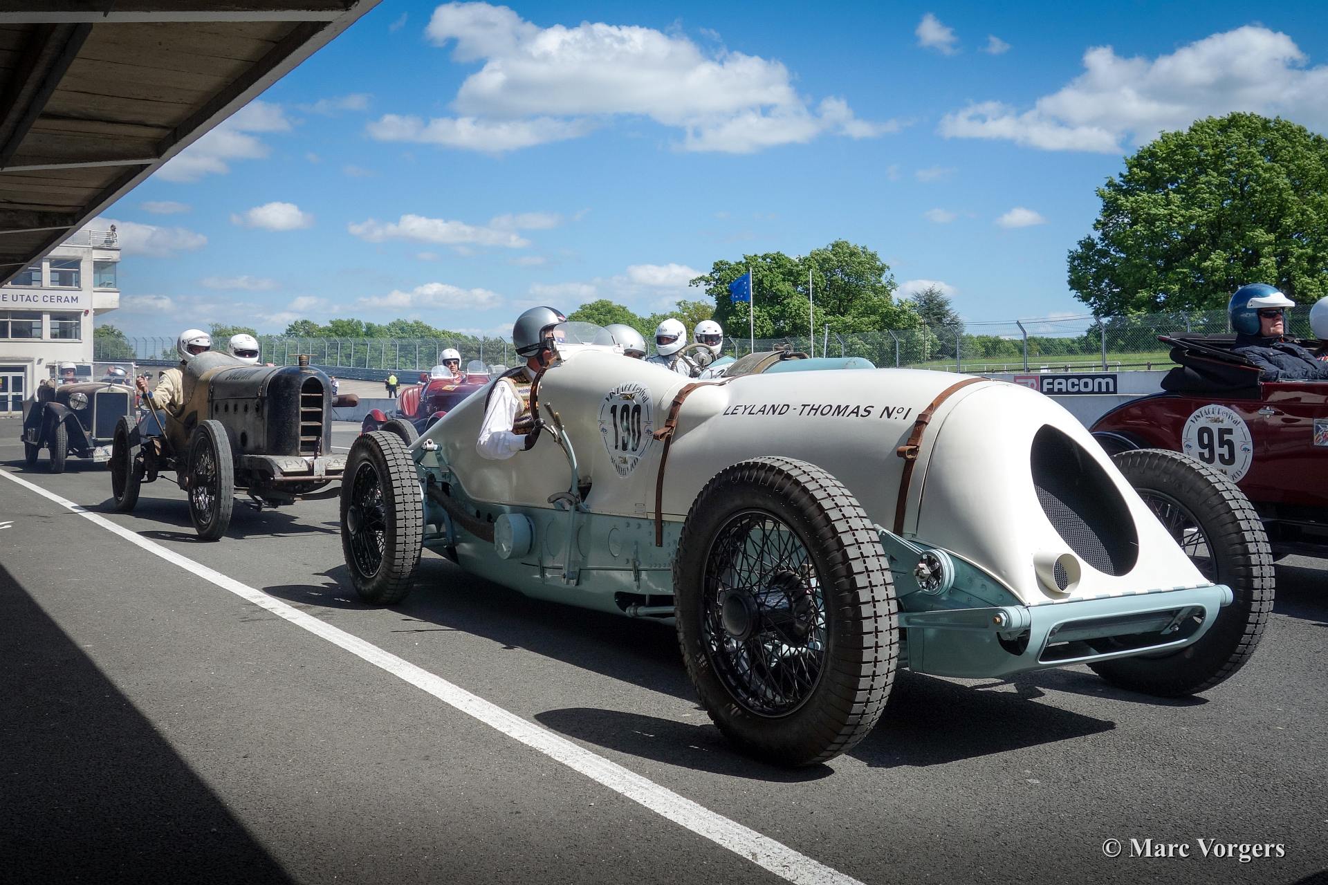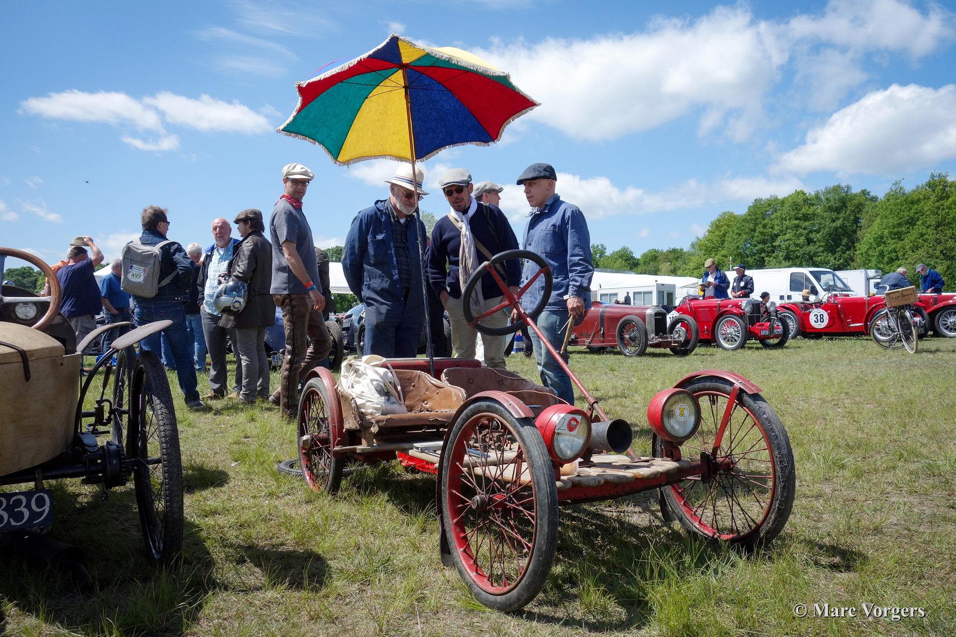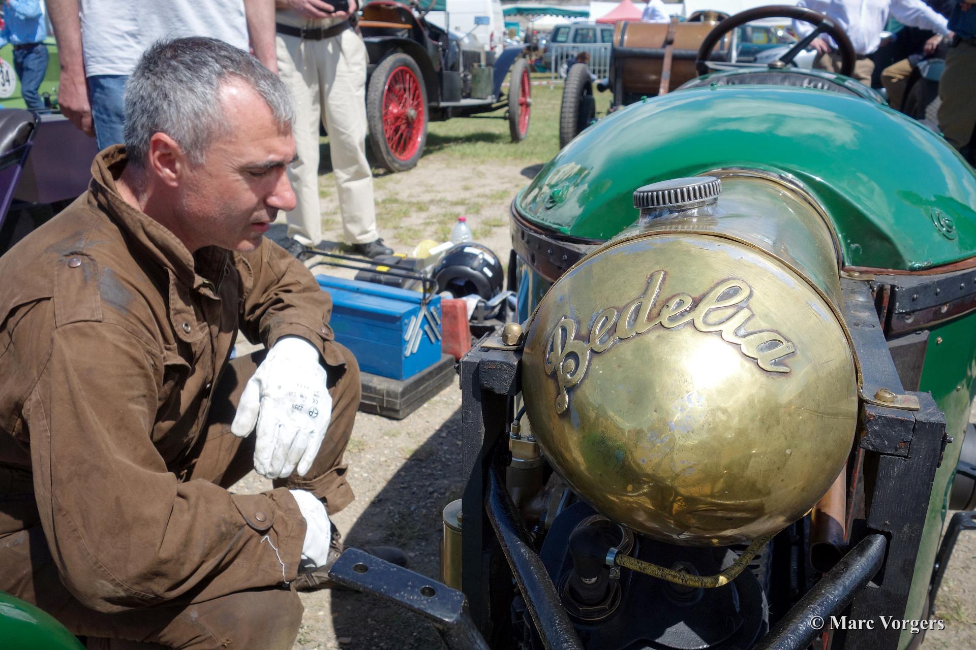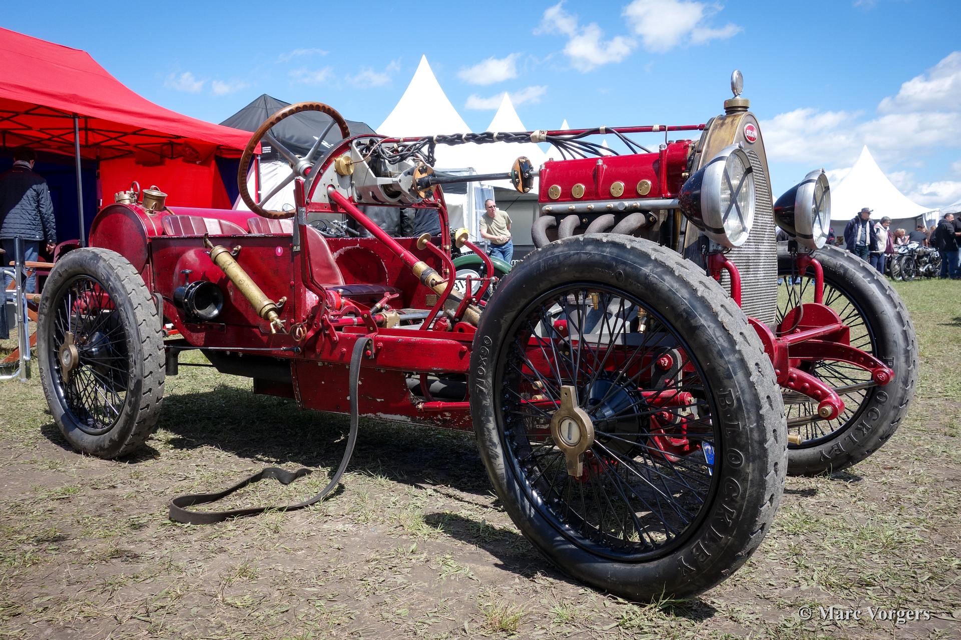 On day three we took the magnificent scenery tour from Mulhouse to Montlhery along Belfort and the N19/E54 from Vesoul to Langres where we found a little piece of England in the village of Cintrey. Here we took photos of our party and the Rover in front of an old garage with great Castrol and Champion advertisements on the wall! The distance of just under 600 kilometres was covered quickly so we arrived at the Montlhery banked circuit in the early afternoon. On the Vintage Revival the clock was turned back several decades… For two days we found ourselves visiting the 1920ies and 1930ies with some added imagination. You only have to suppress out of style details like the modern racing helmets and people clad in too modern overalls and clothes… During this delightful event we witnessed many old Bugatti’s still being driven, raced and cherished by their owners. The other cars and marques where as impressive. Yours truly drooled over the original 1908 Grand Prix Mercedes for a long time… And finally sat down in the seat of the car in which Christian Lautenschlager won the 1908 French Grand Prix in Dieppe.