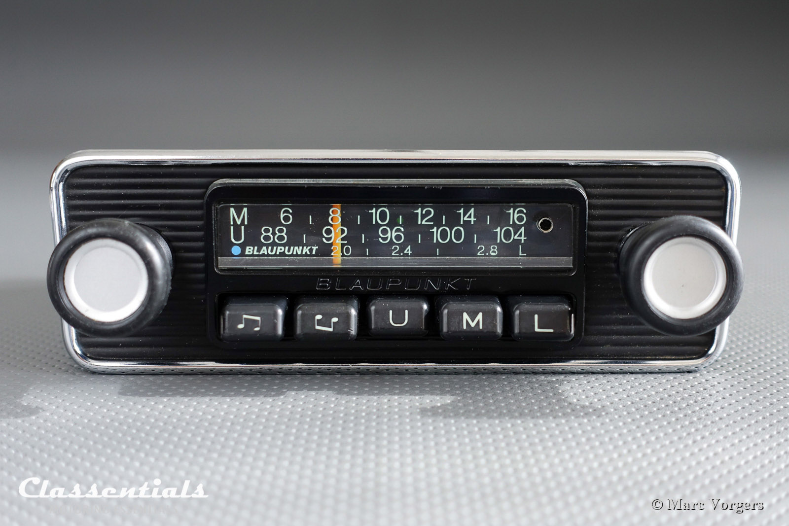 Most vintage radios of the 1950s – 1970s were standard models for any car. The German brand of Blaupunkt however, manufactured radio-units which could be ‘adapted’ to ‘blend-in’ / to stand-out and to fit in any car or model perfectly because of their modular structure. The Blaupunkt radios, being universal units, could (and can) be modified at the front by different face-plates, dial surrounds and knobs, this changing the entire look of the radio. The Blaupunkt Frankfurt model you see pictured above in my 1969 Alfa Romeo GT 1300 Junior is such a modular unit. The radio is a 1970 Frankfurt with a 1965-1969 chrome face-plate and 1970 type black rubber buttons. I could add more chrome by adding earlier buttons but that would be too much for my taste. If I fancy I can always exchange the faceplate for a somewhat slimmer chrome model, also with black inserts under the knobs. This playing around with vintage radios made me a fan of Blaupunkt. It is a great pastime to find the best front / knob combinations, and now I am doing that here, for you, in the Classentials web-shop. In the Vintage Radios chapter you will find a fine selection of refurbished Blaupunkt radios and other fine classic brands. All the Blaupunkt models, exept the basic Solingen model, feature a special DIN socket at the rear through which in the past cassette players were connected. Today in the ‘digital era’ this DIN connection makes possible to connect your smartphone, Ipod or any other ‘playback’ device (featuring a 3,5 mm jack socket) to the vintage radios. This to listen to your own music files or to stream music or play digital radio channels from a phone app.