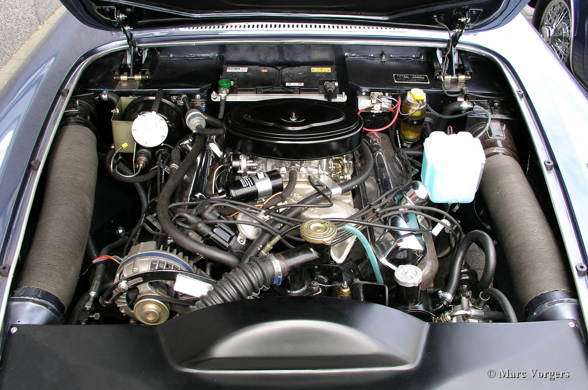 The Facel Vega II is the follow-up to the legendary Facel Vega HK 500. The undercarriage of the Facel II is identical to it’s predecessor i.e. welded steel chassis, independent suspension with coil springs in the front, a live axle leaf spring system at the rear and disc brakes all round. The Facel II, however, is equipped with a more powerful Chrysler V8 motor (either a 6.2 Litre 390 pk or a 6.7 litre 400 pk). The 6.7 Litre motor of the Facel 11 has two four-barrel carburettors.