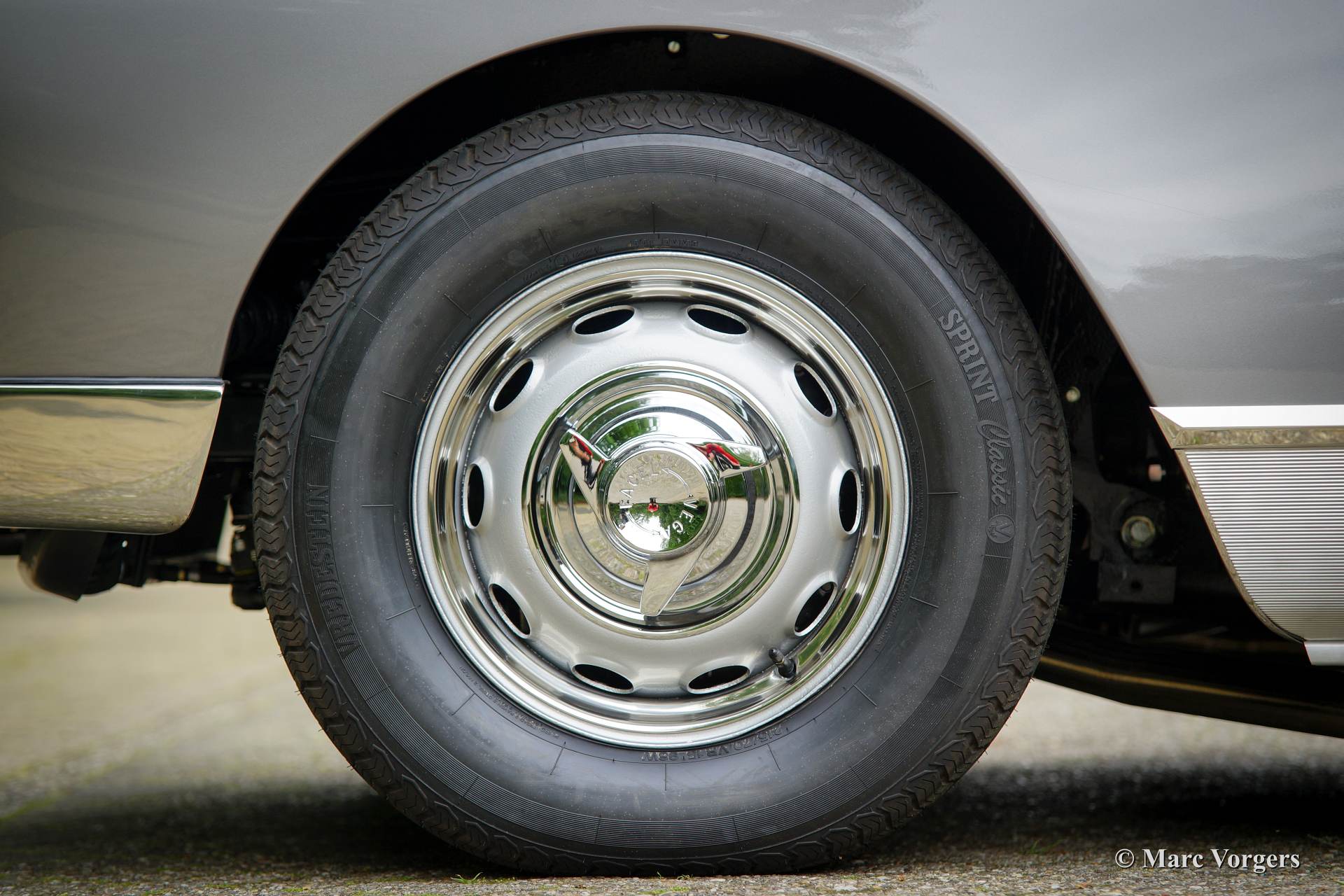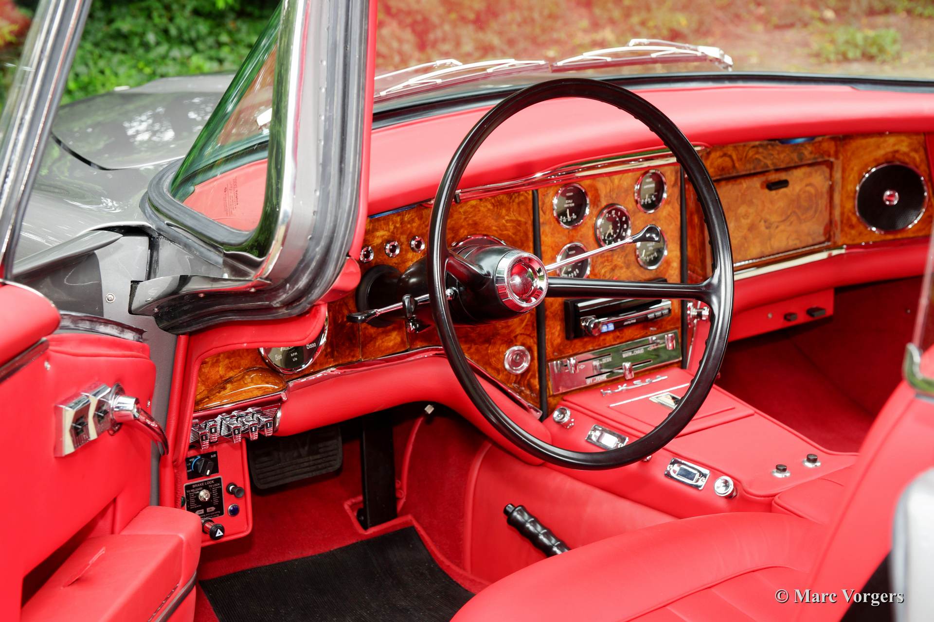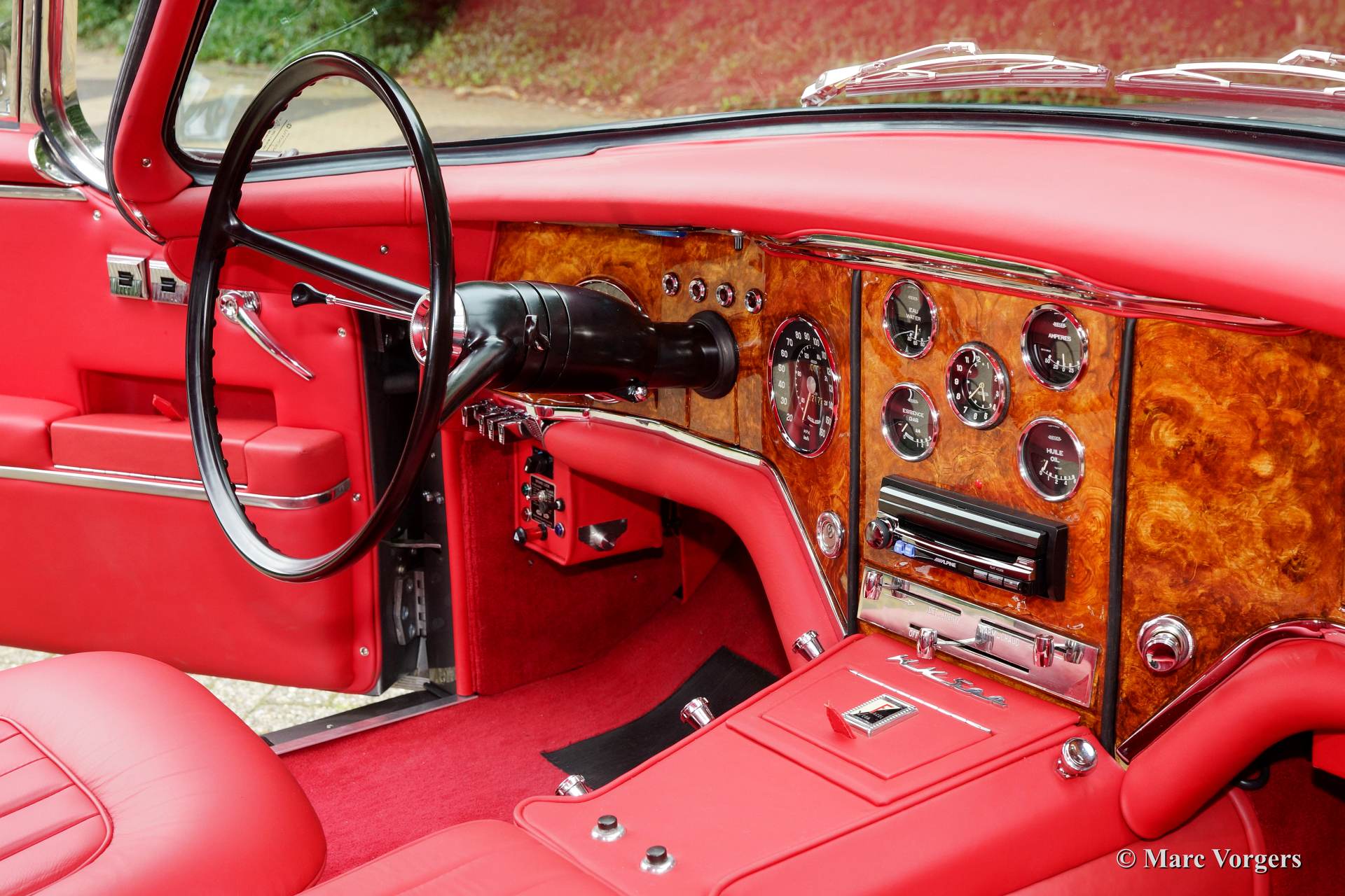 The Facel Vega HK 500 is an extremely luxurious car with a gorgeous finish and beautiful details. The interior is majestic with it’s mock walnut (in the French tradition) dashboard and beautifully chromed handles and switches. The leather upholstery is of an exceptionally high quality the comfort it offers reflects this. The car comes with all of the novelties which were common on the American market at the time. The robustly built automatic windows and the gear shift with it’s stylish buttons are extremely reliable and never fail. Chrome was used sparingly on the HK 500; the bumpers, mirrors and side strips are all constructed of stainless steel. The vehicle is built upon a welded steel chassis within which the strong 6.2 Litre Chrysler V8 is mounted. The undercarriage has independent wheel suspension with coil springs at the front and a live axle leaf spring suspension system at the rear. From 1960 onwards, the HK 500 was equipped with disc brakes around. The Facel Vega HK-500 is rare, only 490 units were built of which 329 still exist.
