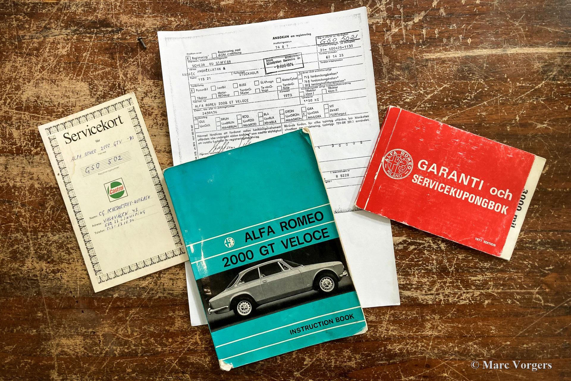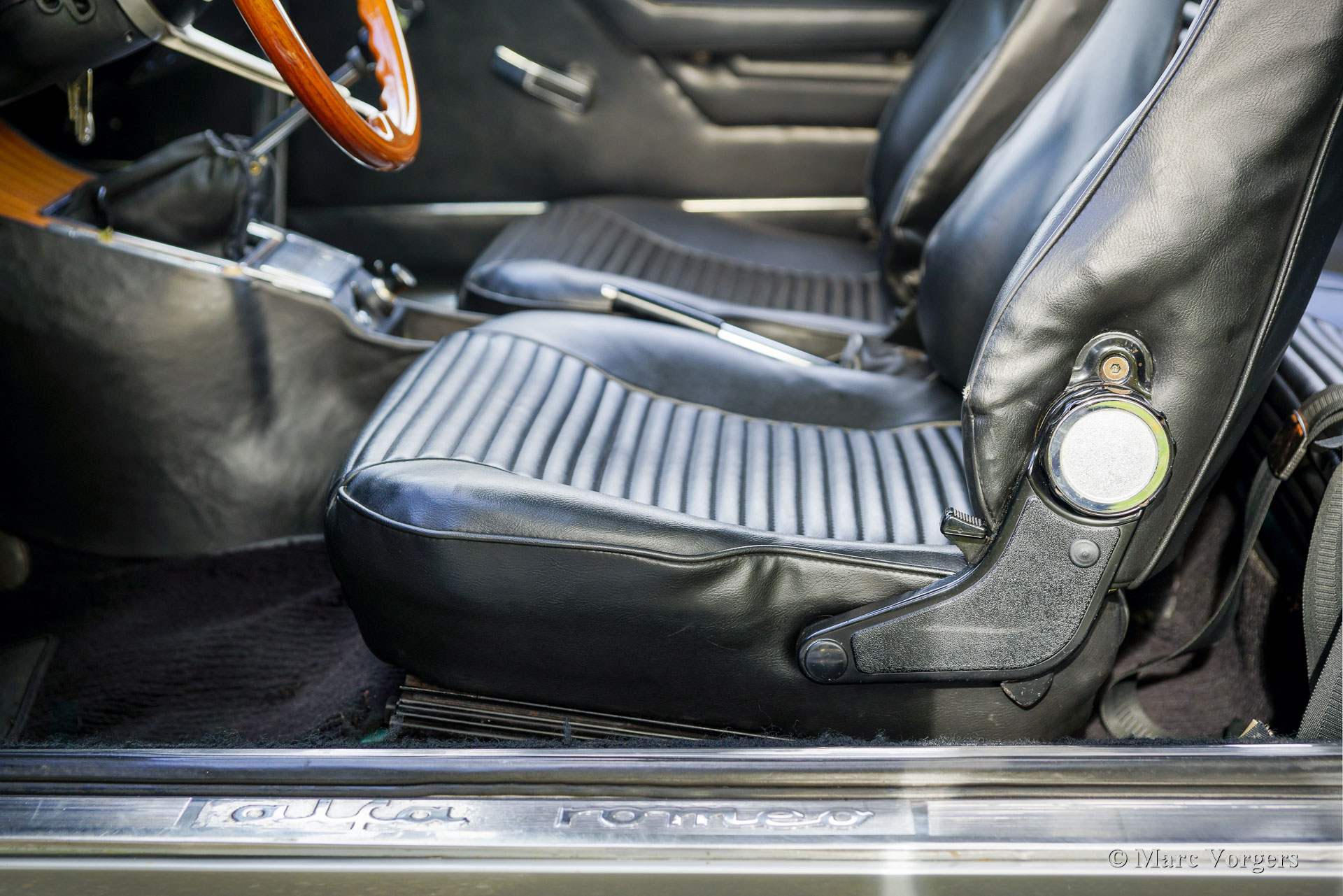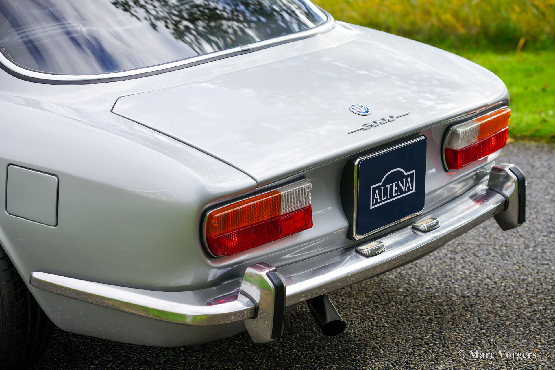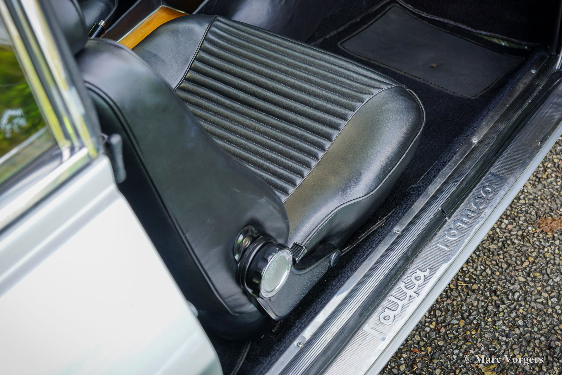 Alfa Romeo Giulia 2000 GTV „Bertone“, Jahr 1974. Fahrgestellnummer AR2439136, Motornummer 00512 – S10507. Karosserie in Silbermetallic, kombiniert mit einer Innenausstattung aus schwarzem Kunstleder und schwarzem Teppich. Der Alfa Romeo Giulia GT (105er-Reihe), der 1963 erstmals vorgestellt wurde, ist ein Coupé mit schönen Proportionen, das die Markenidentität von Alfa Romeo mitgeprägt hat. Designer Giorgetto Giugiaro war erst 22 Jahre alt, als er das Design entwarf. Der Giulia GT war einer seiner ersten, aber auch wichtigsten Aufträge und einer, auf den er sehr stolz war. Dieser hinreißende Giulia 2000 GTV wurde neu in Schweden verkauft, das Auto wird mit einer vollständigen Fahrzeughistorie, einer englischsprachigen Bedienungsanleitung, einem Garantieheft und einer originalen Servicekarte geliefert. Der Giulia 2000 GTV ist das Spitzenmodell der Baureihe und verfügt über einen 150 PS starken Twin-Cam-Motor und ein Sperrdifferenzial an der Hinterachse. Mit Scheibenbremsen rundum und einem Fünfganggetriebe ist klar, dass der 2000 GTV ein echtes Sportcoupé in bester italienischer GT-Tradition ist. Die Karosserie dieses Autos wurde in Schweden restauriert und mechanisch in einen ausgezeichneten Zustand versetzt. Das Auto zeigt alle Originaldetails, lediglich die Aufhängung wurde mit neuen Buchsen und Federn modifiziert und ein (serienmäßiger) Sportauspuff aus Stahl eingebaut. Unter der Motorhaube sieht alles fast wie neu aus! Der Innenraum ist in einem ausgezeichneten Zustand; wir glauben, dass die Sitzpolsterung während der Restaurierung erneuert wurde. Das Armaturenbrett, die Anzeigen, die Mittelkonsole und der Dachhimmel sind alle in ausgezeichnetem Originalzustand! Das Auto ist derzeit mit 14-Zoll-Leichtmetallfelgen im GB-Minilite-Stil (seit Jahrzehnten eine Aftermarket-Option für die Giulia 105-Serie) und 185/70 14 Vredestein T-Track 2-Reifen ausgestattet. Ein Satz von vier ATS-Leichtmetallfelgen ist ebenfalls vorhanden. Das Reserverad im Auto ist ein serienmäßiges Stahlrad. Dieser schnelle und wendige Alfa Romeo Giulia GTV 2000 ist ein hervorragendes Exemplar in einer tollen Farbkombination und mit Upgrades, die sportliche Alfa Romeo-Fans und -Fahrer sehr begeistern werden!