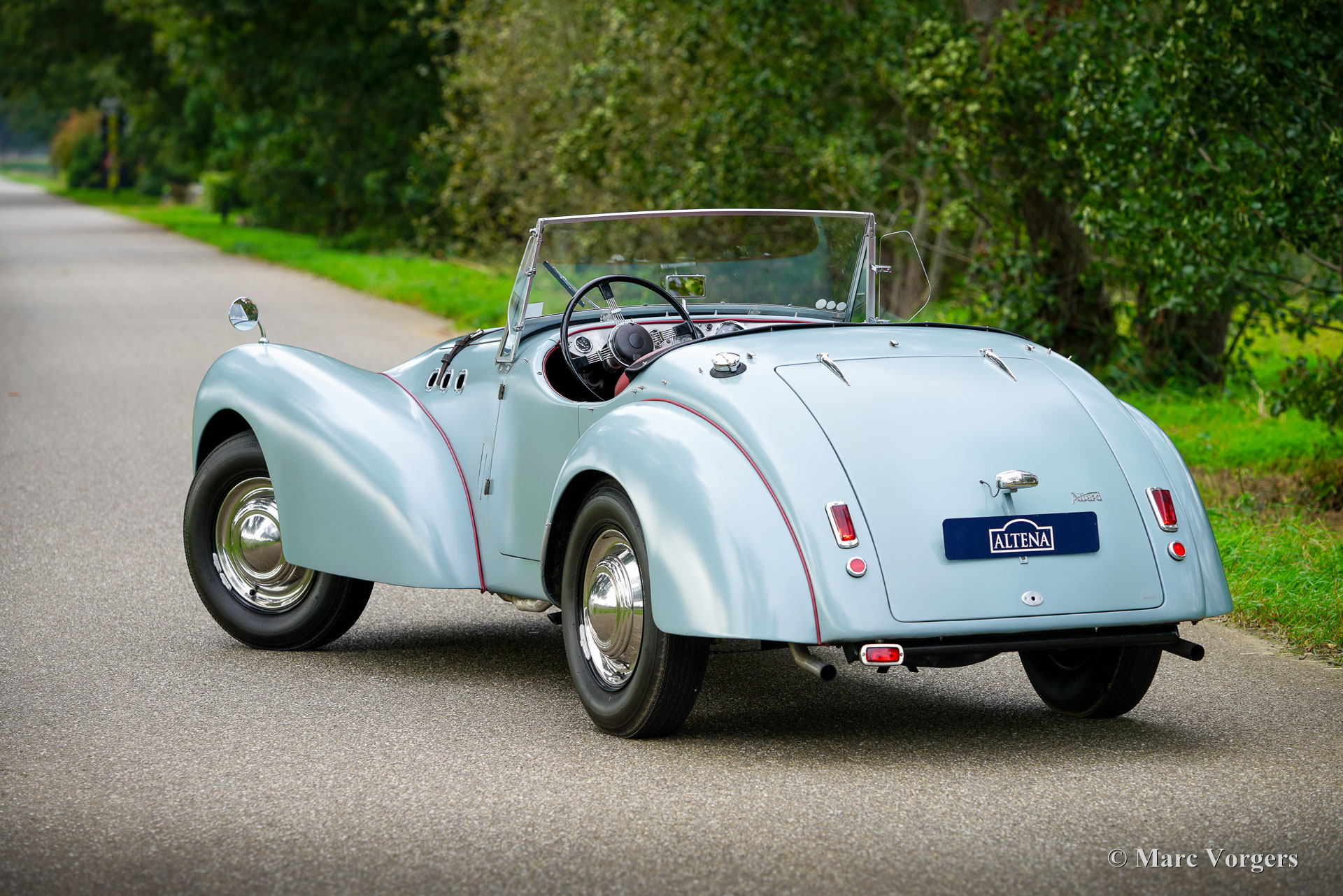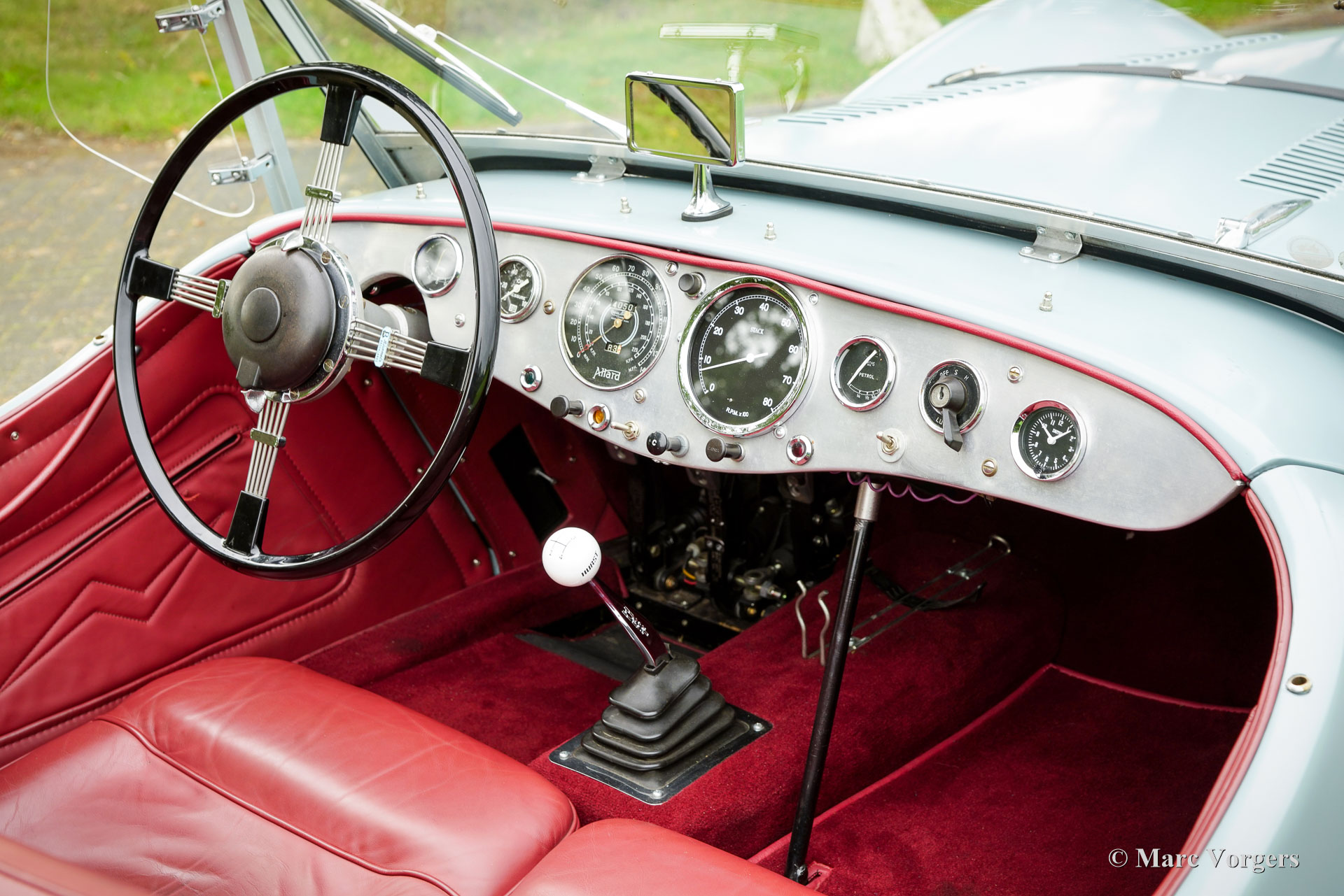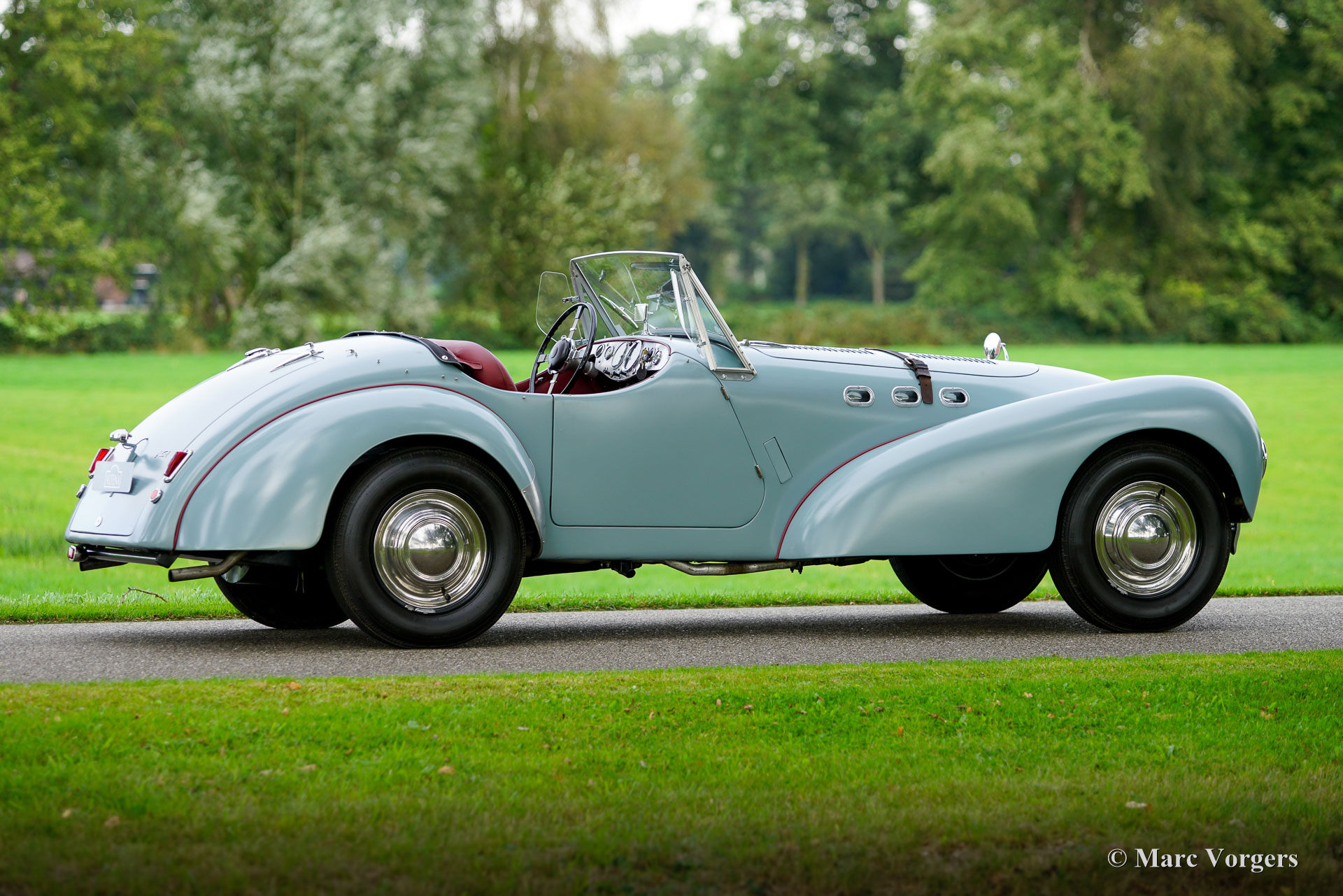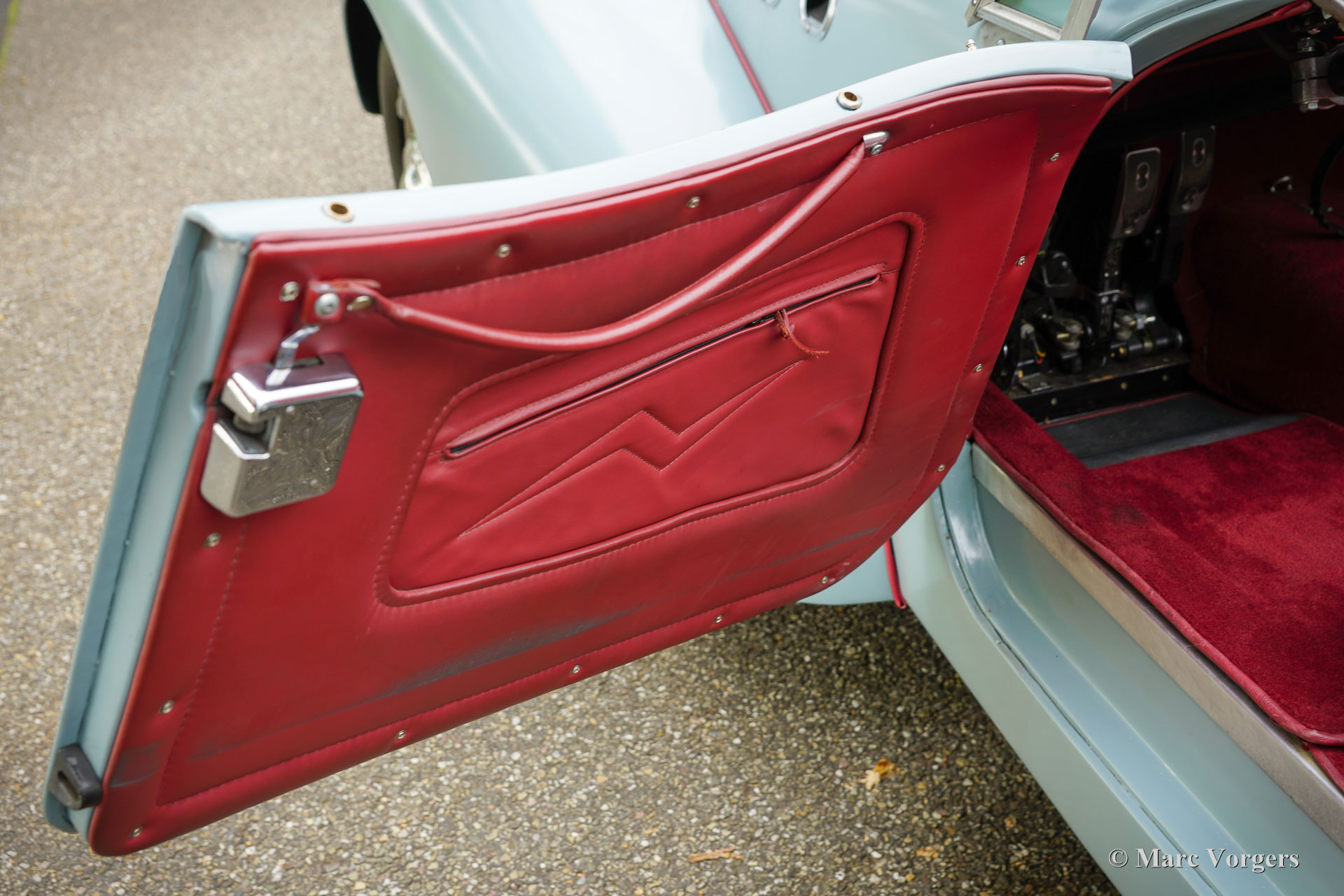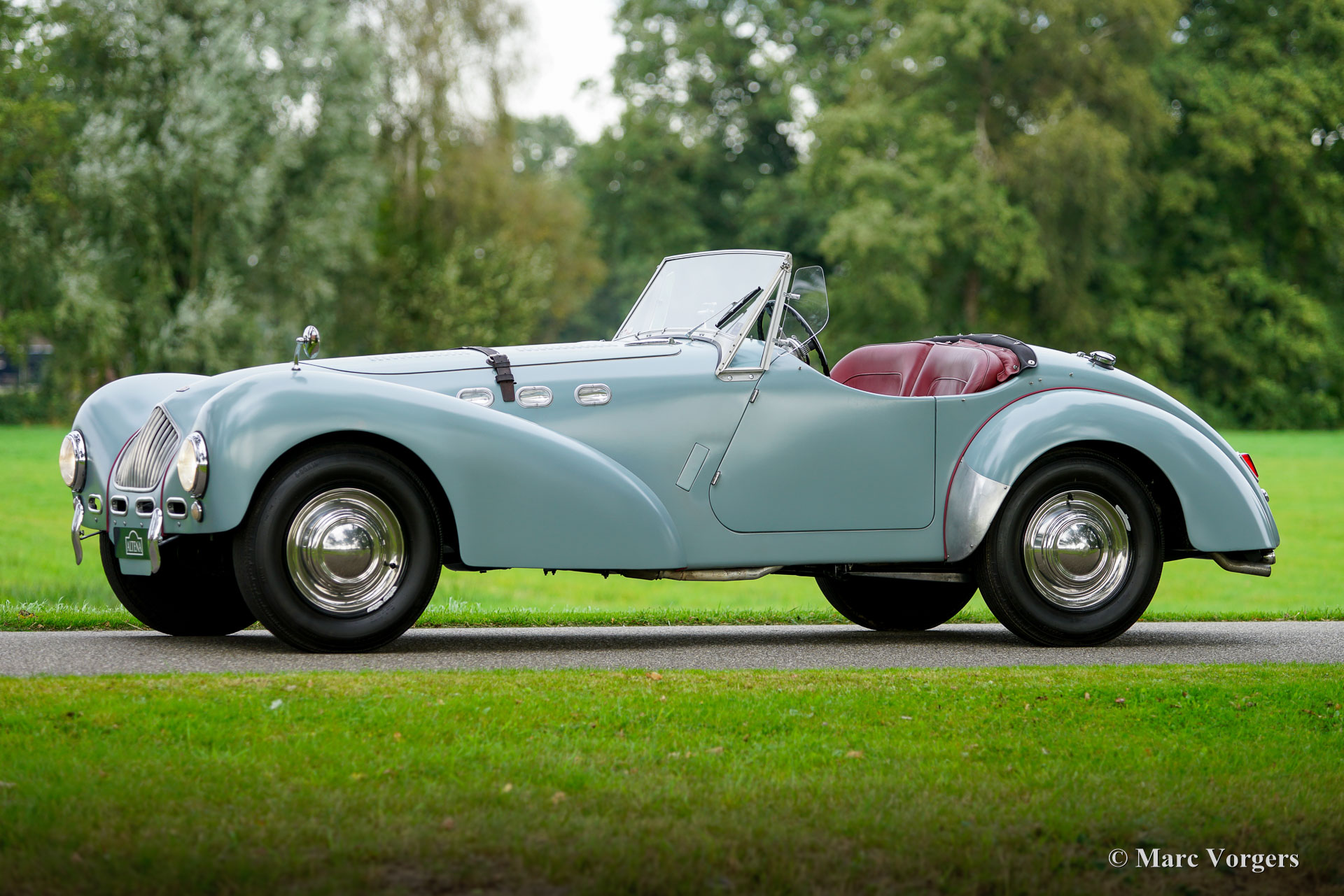Allard K2 Roadster, Jahr 1952. Fahrgestellnummer K1986. Farbe mattes Hellblau kombiniert mit einer roten Lederausstattung. Dieser seltene Allard K2 Roadster wurde neu in den USA verkauft, wo es 37 Jahre lang im Besitz seines ersten Besitzers war. Im Jahr 2010 wurde das Auto nach Europa importiert und in Belgien umfassend restauriert. Die Karosserie erhielt einen neuen Lack und die mechanischen Komponenten wurden überholt. Seit 2010 hatte das Auto nur einen Besitzer; Dieser Allard K2 Roadster ist in einem hervorragenden Zustand und das Auto fährt beeindruckend. Allard-Wagen wurden von 1945 bis 1958 in Clapham im Südwesten Londons gebaut. Carroll Shelby bekannt von AC Cobra und Chevrolet Corvette-Chefingenieur Zora Arkus-Duntov fuhren beide in den frühen 1950er Jahren Allards, was uns zeigt, dass die Allard-Autos etwas Besonderes waren und sind. Die Autos basierten auf einem modifizierten Ford Pilot Chassis mit einer Ballamy-Pendelachse vorne. Die Autos wurden mit amerikanischen V8-Motoren verkauft, die von Ford, Mercury, Chrysler und Cadillac bezogen wurden. Die Karosserien der Autos wurden von Allards Freund Godfrey Imhof aus Aluminium gefertigt. Dieser Allard K2 Roadster ist mit einem Cadillac V8-Motor ausgestattet. Das Auto lässt sich großartig lenken und manövrieren, und der Motor zieht, läuft und klingt hervorragend! Vom K2 Roadster wurden von 1950 bis 1952 nur 119 Exemplare gebaut, nur noch 25 Exemplare sind bekannt. Dieses besondere Auto wird mit einer historischen Datei von neuem geliefert! Eine Menge Dokumentation, darunter Korrespondenz mit dem Allard-Club und die Original-Bedienungsanleitung. Ein ganz besonderes und seltenes Auto, das der neue Besitzer voll genießen kann!