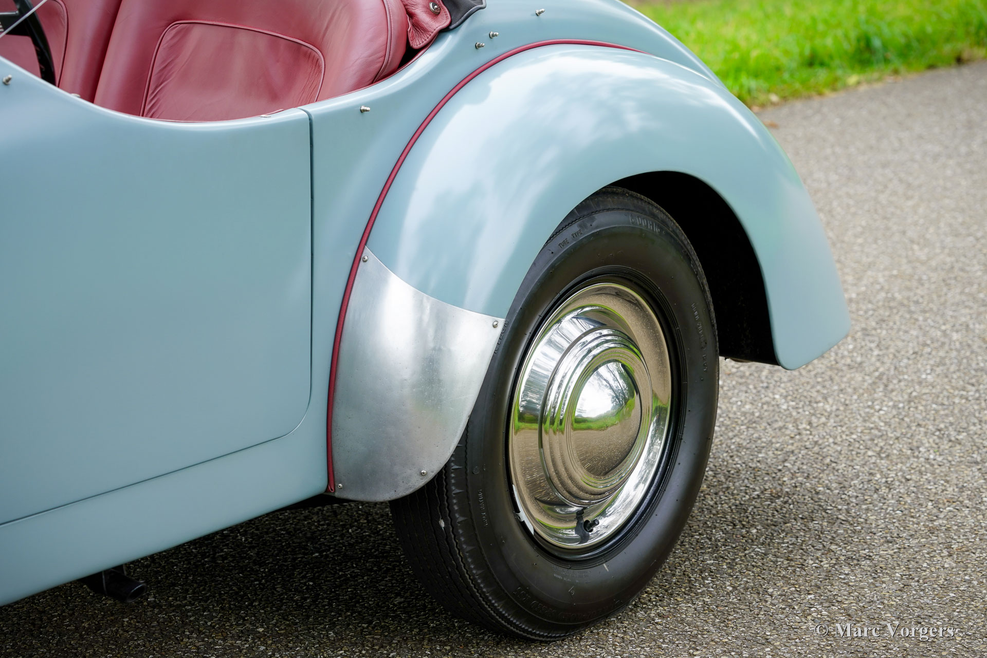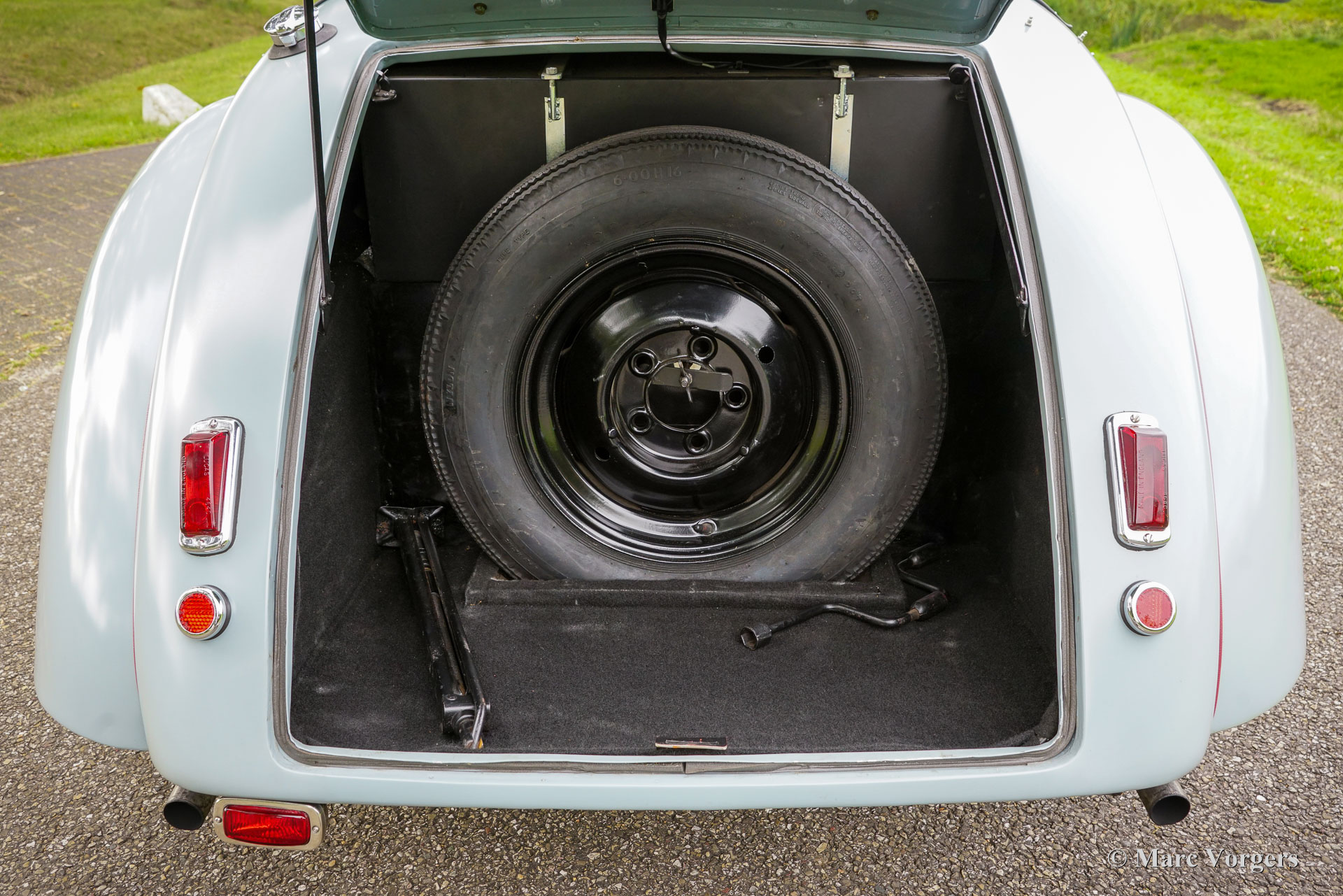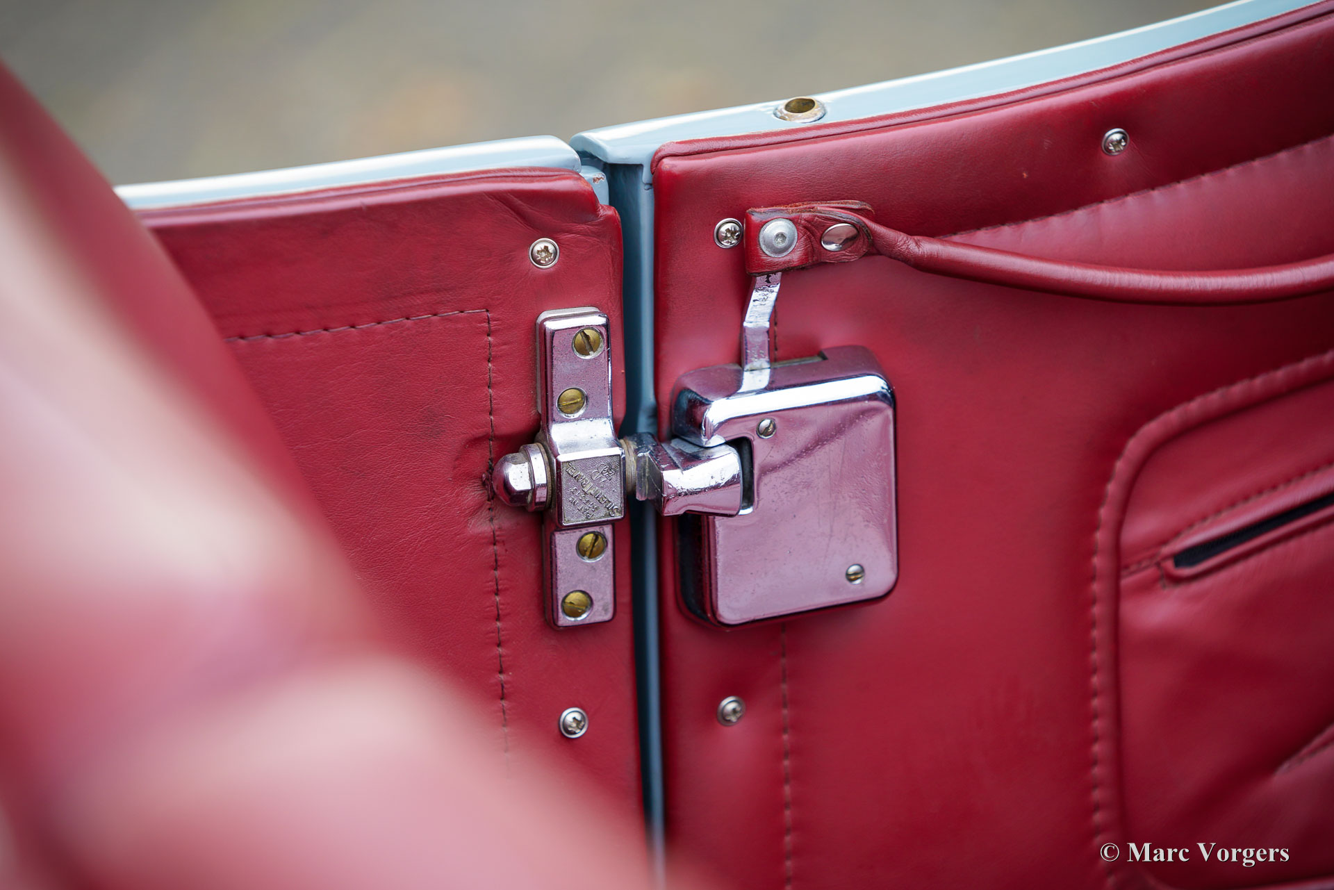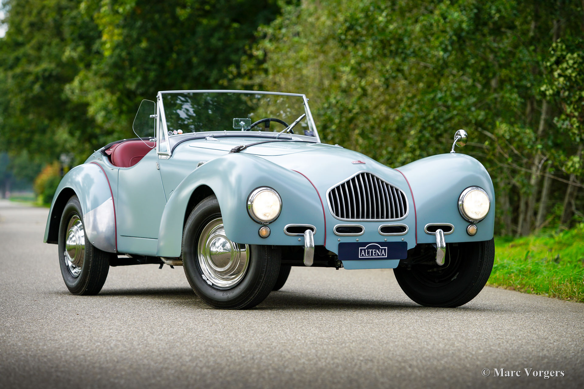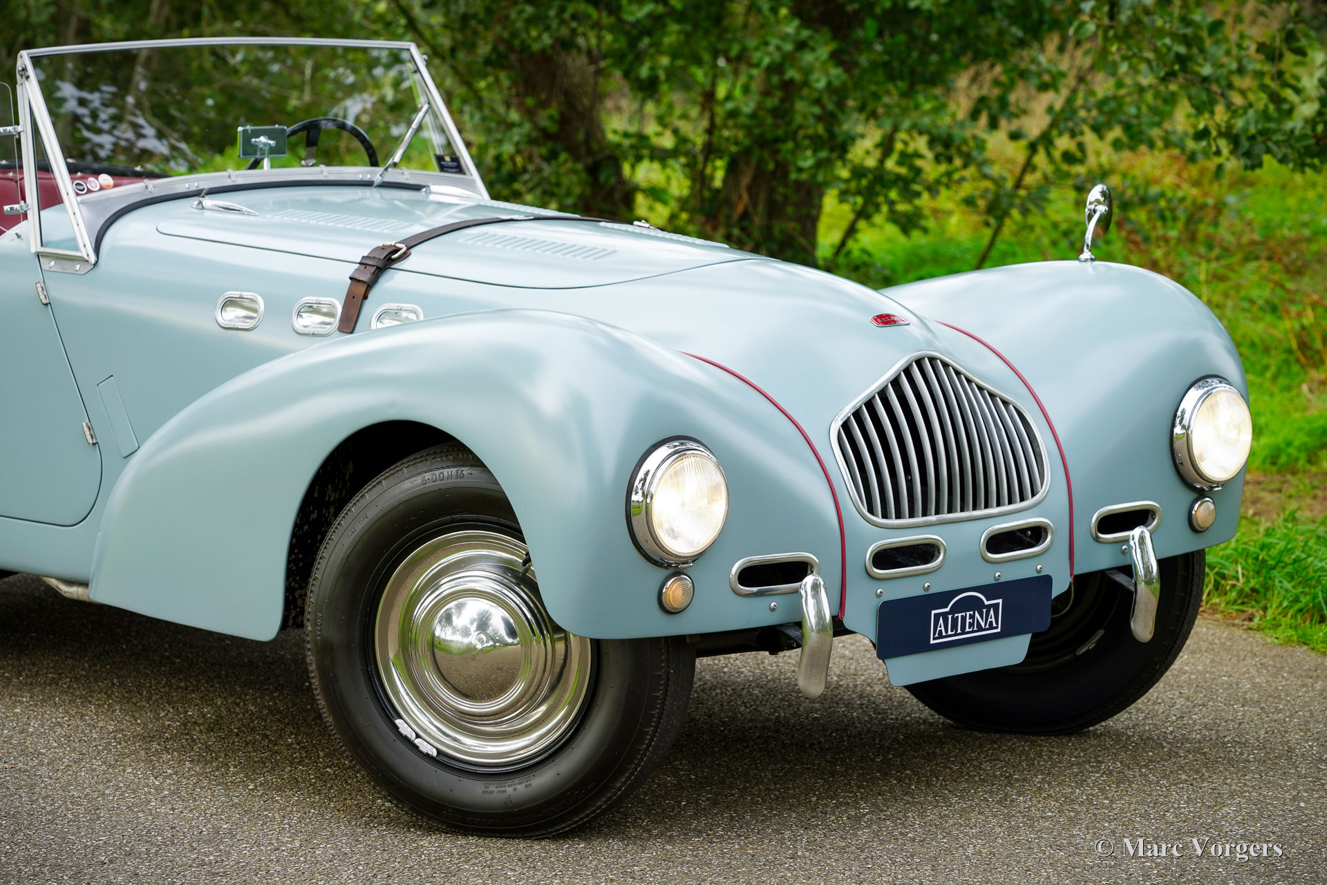 Allard K2 Roadster, Jahr 1952. Fahrgestellnummer K1986. Farbe mattes Hellblau kombiniert mit einer roten Lederausstattung. Dieser seltene Allard K2 Roadster wurde neu in den USA verkauft, wo es 37 Jahre lang im Besitz seines ersten Besitzers war. Im Jahr 2010 wurde das Auto nach Europa importiert und in Belgien umfassend restauriert. Die Karosserie erhielt einen neuen Lack und die mechanischen Komponenten wurden überholt. Seit 2010 hatte das Auto nur einen Besitzer; Dieser Allard K2 Roadster ist in einem hervorragenden Zustand und das Auto fährt beeindruckend. Allard-Wagen wurden von 1945 bis 1958 in Clapham im Südwesten Londons gebaut. Carroll Shelby bekannt von AC Cobra und Chevrolet Corvette-Chefingenieur Zora Arkus-Duntov fuhren beide in den frühen 1950er Jahren Allards, was uns zeigt, dass die Allard-Autos etwas Besonderes waren und sind. Die Autos basierten auf einem modifizierten Ford Pilot Chassis mit einer Ballamy-Pendelachse vorne. Die Autos wurden mit amerikanischen V8-Motoren verkauft, die von Ford, Mercury, Chrysler und Cadillac bezogen wurden. Die Karosserien der Autos wurden von Allards Freund Godfrey Imhof aus Aluminium gefertigt. Dieser Allard K2 Roadster ist mit einem Cadillac V8-Motor ausgestattet. Das Auto lässt sich großartig lenken und manövrieren, und der Motor zieht, läuft und klingt hervorragend! Vom K2 Roadster wurden von 1950 bis 1952 nur 119 Exemplare gebaut, nur noch 25 Exemplare sind bekannt. Dieses besondere Auto wird mit einer historischen Datei von neuem geliefert! Eine Menge Dokumentation, darunter Korrespondenz mit dem Allard-Club und die Original-Bedienungsanleitung. Ein ganz besonderes und seltenes Auto, das der neue Besitzer voll genießen kann!