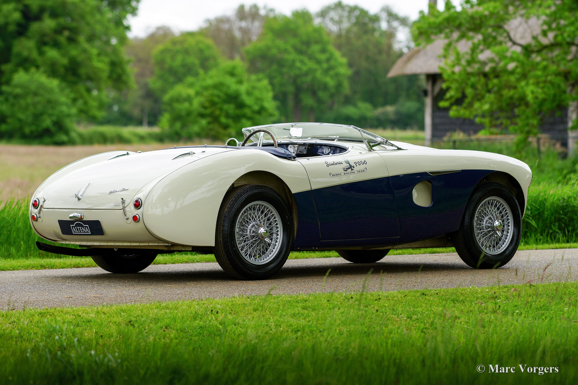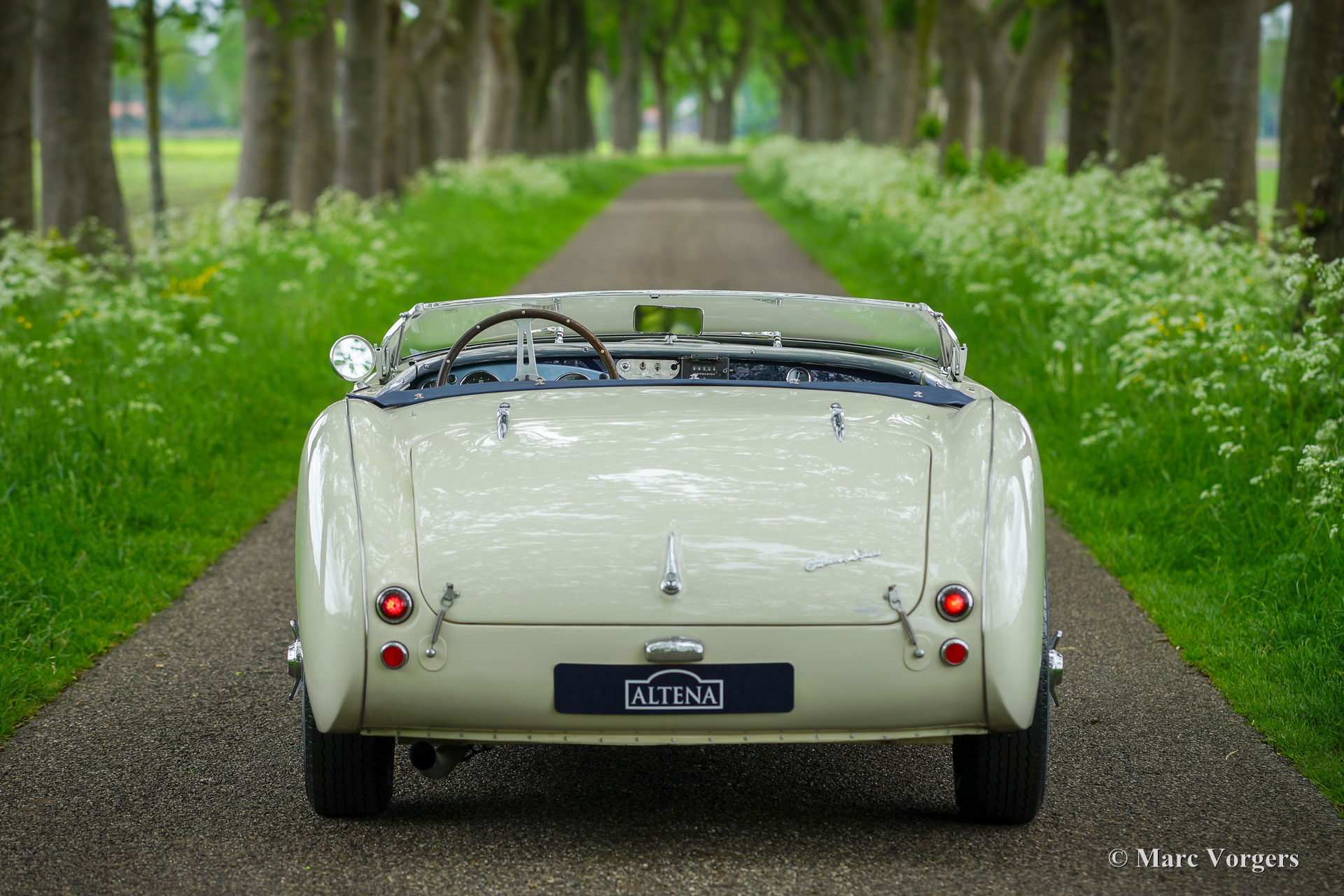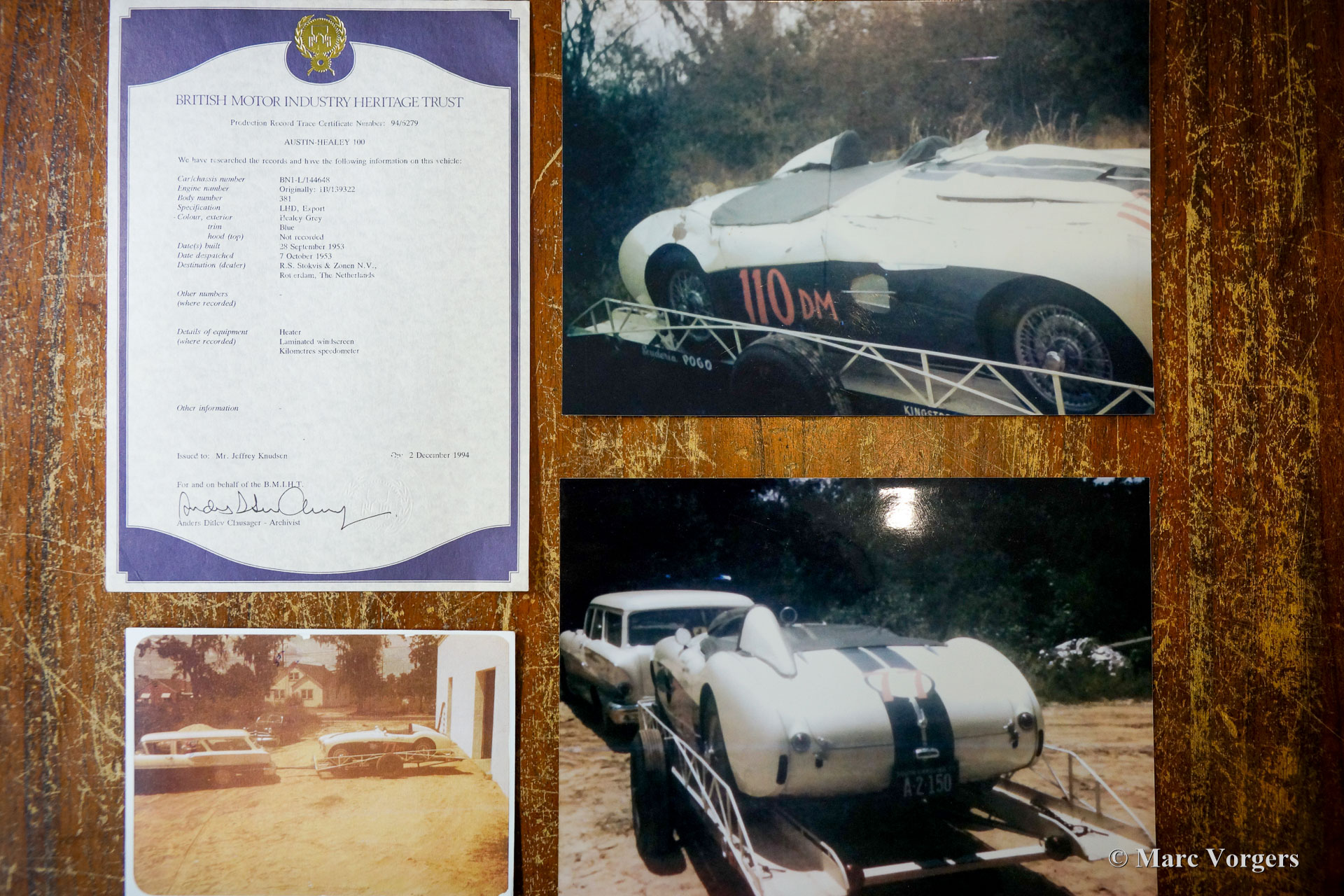 Austin Healey 100/4 BN1, Jahr 1953. Farbe Old English White über Dunkelblau, kombiniert mit einer blauen Lederausstattung getrimmt mit weißen Paspeln. Dunkelblaues Verdeck, Seitenfenster und ‚Tonneau‘ Abdeckung. Der erste Healey 100 BN1 wurde im Mai 1953 produziert und der BN1 wurde im September 1955 durch den BN2 ersetzt. Dies ist ein frühes Exemplar, das das Werk am 28. September 1953 verließ. Dieser prächtige Austin Healey wurde vom Holländischem Importeur Stokvis & Zonen in Rotterdam als Neuwagen verkauft. Später im Jahr 1953 wurde das Auto nach Texas in die USA verschifft. In den USA wurde dieser Austin Healey bis 1962 als Rennwagen eingesetzt. Nach seiner Rennkarriere stand der Wagen 32 Jahre lang in einer Scheune in Columbia. Alte Fotos des Wagens im Rennsport-Look sind in der Dokumentation noch vorhanden, ebenso wie Fotos des Wagens, nachdem er Jahrzehnte später aus der Scheune geholt wurde. Im Jahr 2010 wurde der Austin Healey nach Deutschland verkauft, wo das Auto vollständig und wunderschön restauriert und bis zur Perfektion überholt wurde. Das Auto wurde bis auf die stromlinienförmige „Ausbuchtung“ hinter dem Fahrer wieder auf die auf den alten Fotos sichtbaren Rennspezifikationen restauriert.