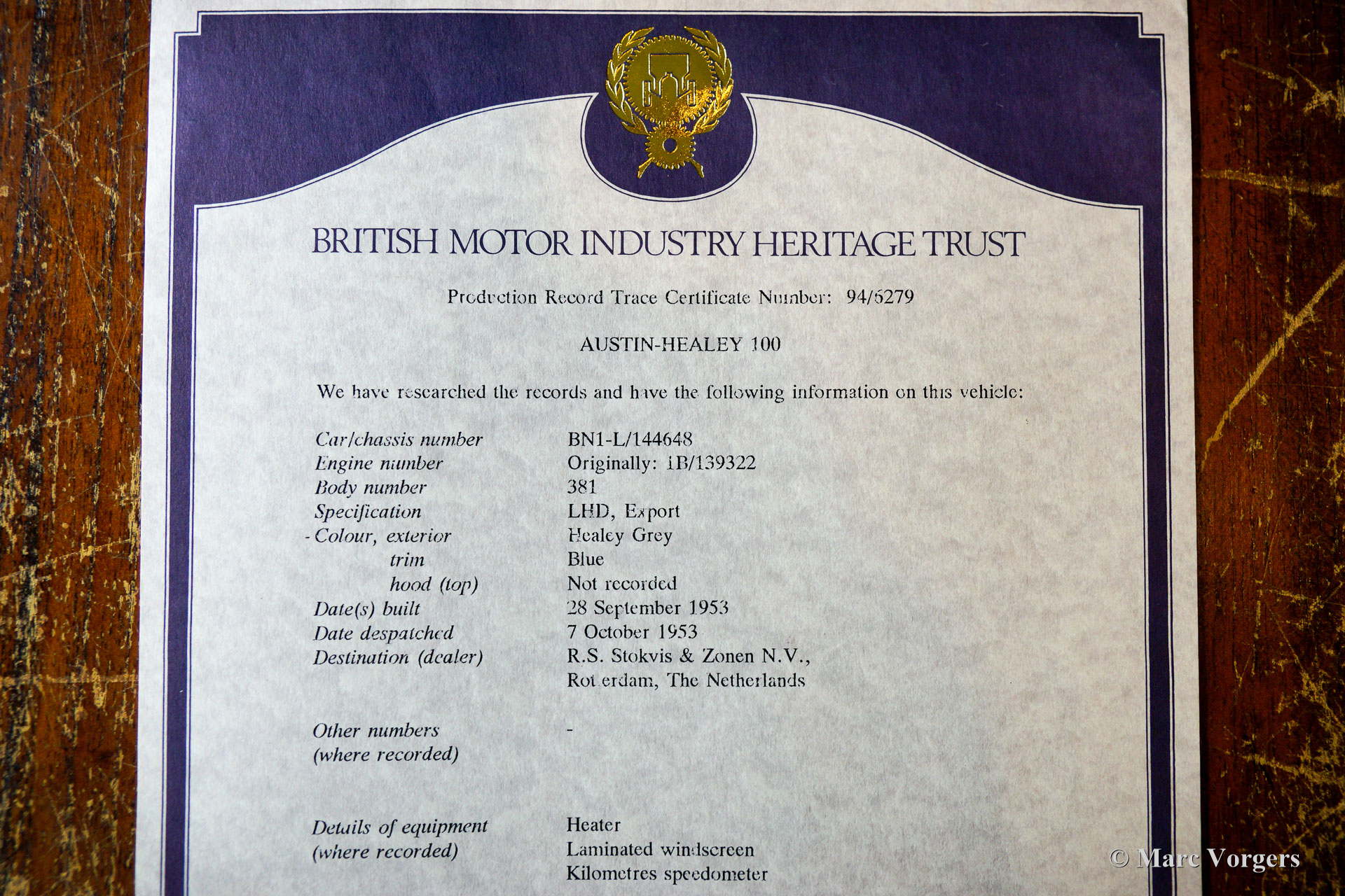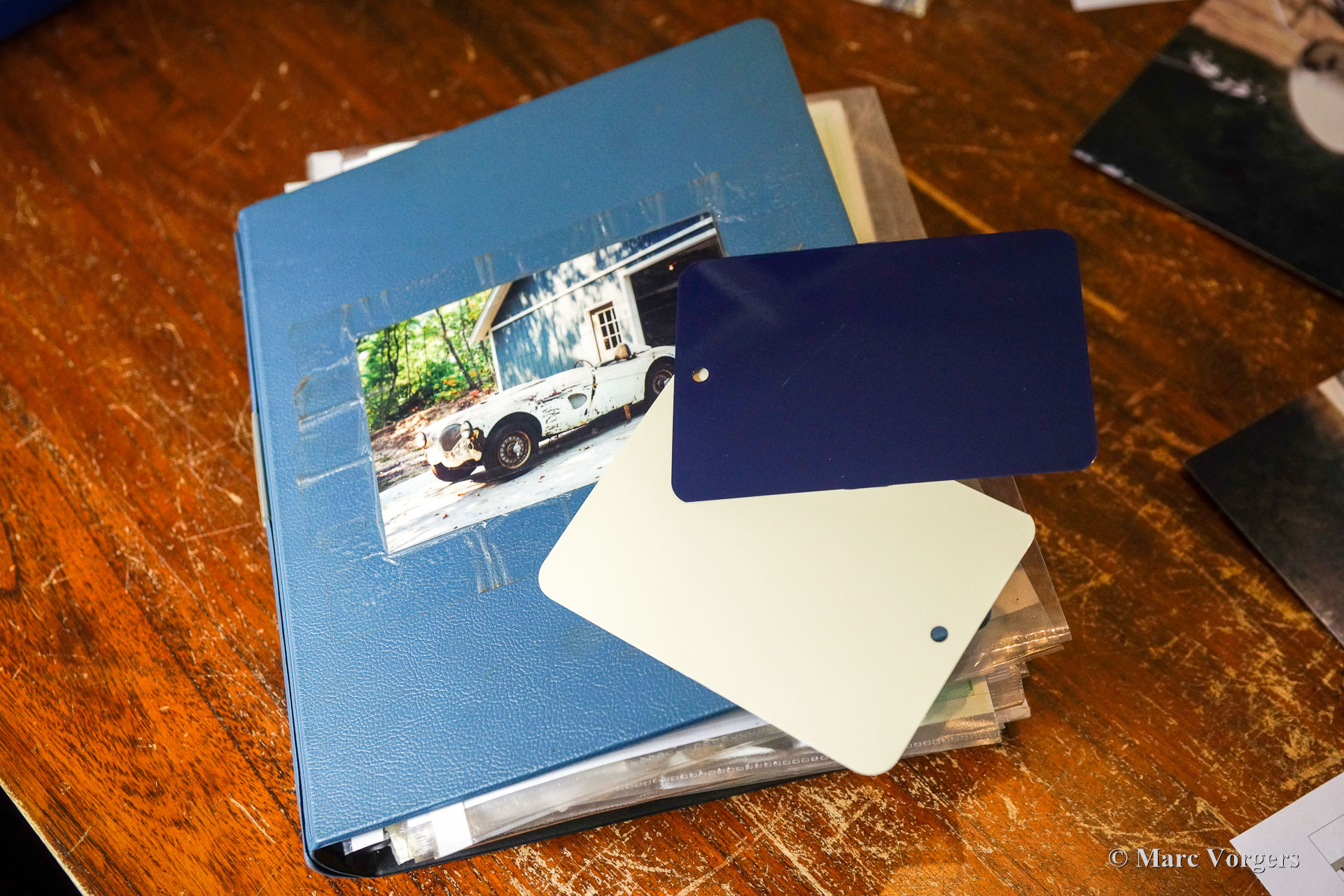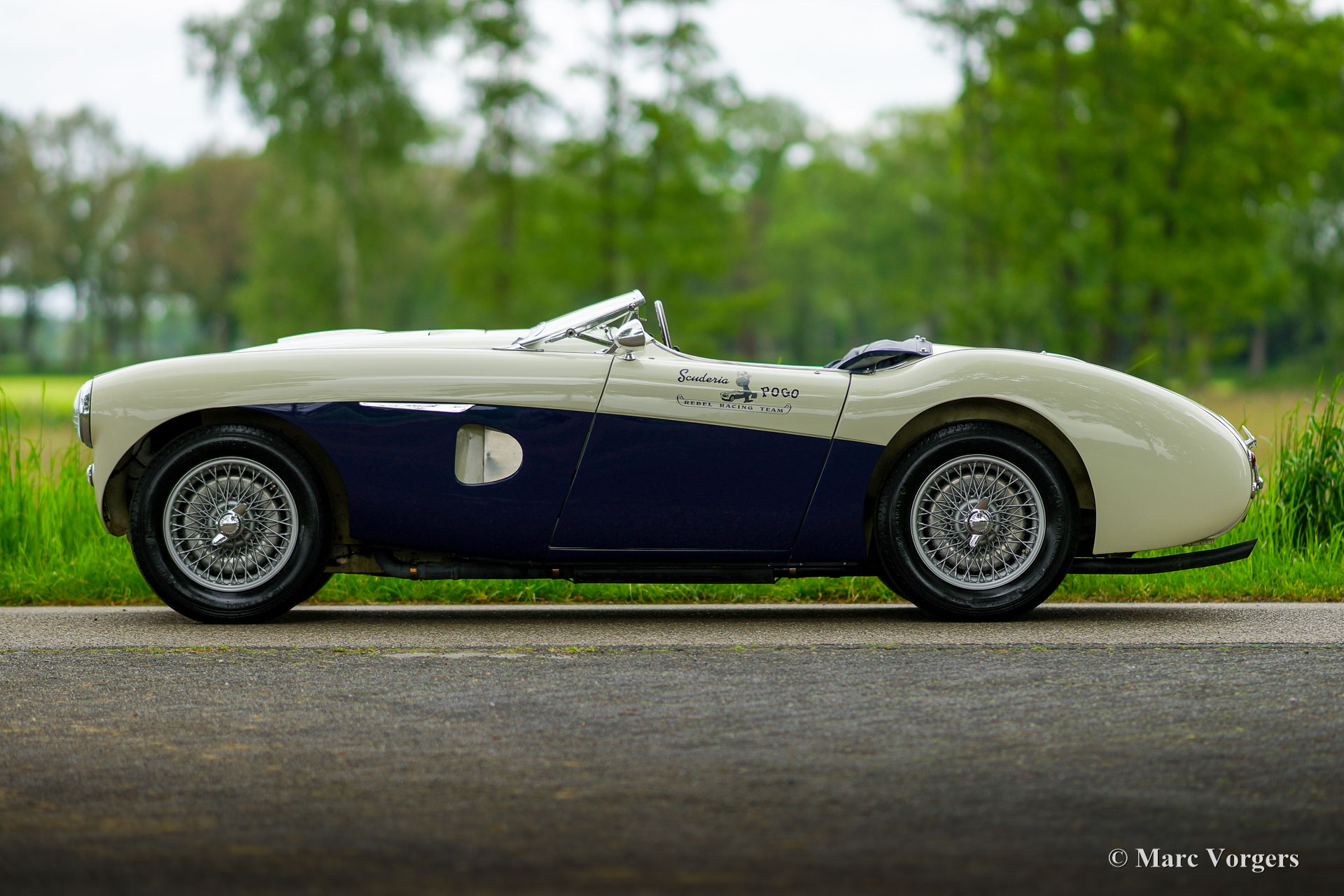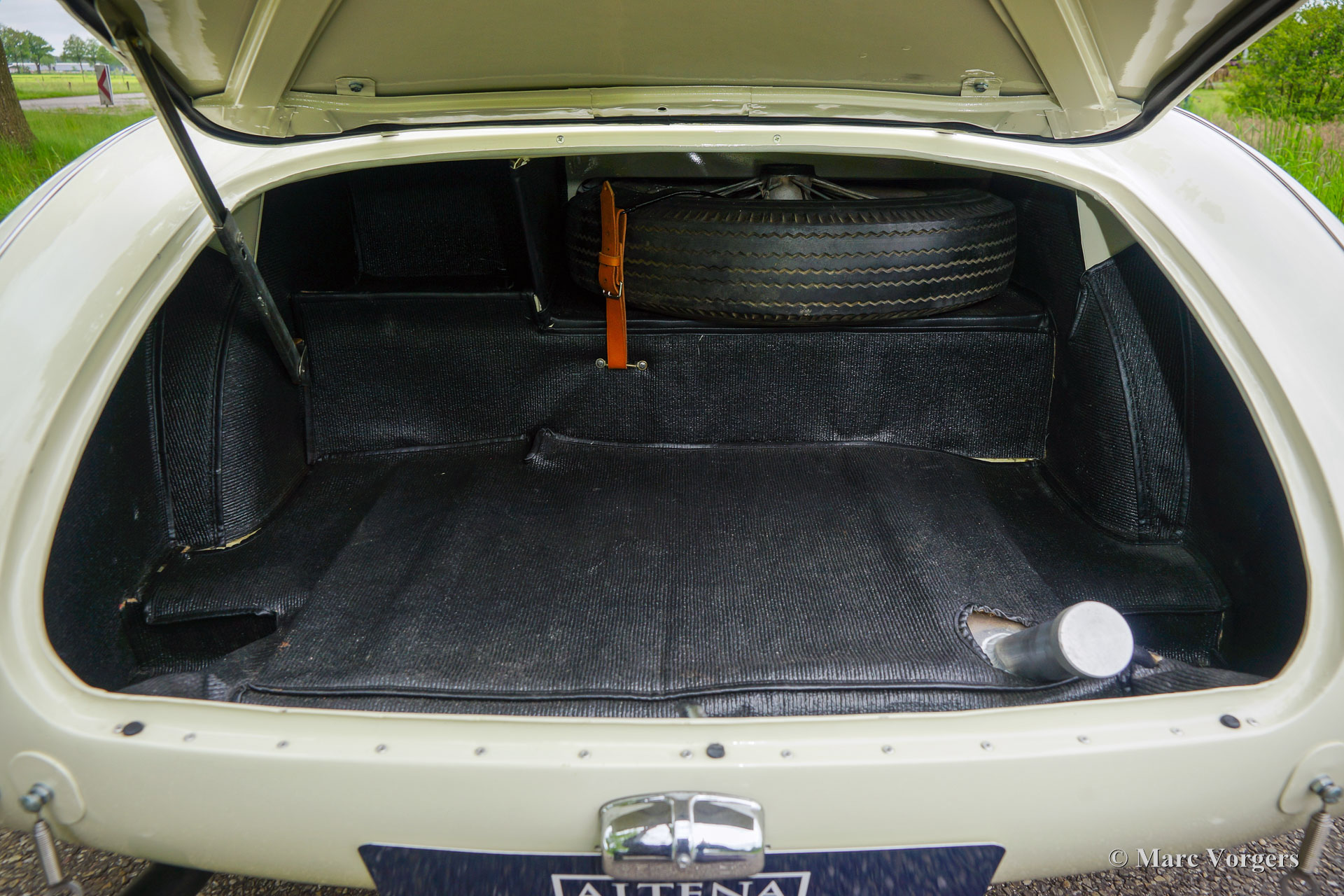 Austin Healey 100/4 BN1, Jahr 1953. Farbe Old English White über Dunkelblau, kombiniert mit einer blauen Lederausstattung getrimmt mit weißen Paspeln. Dunkelblaues Verdeck, Seitenfenster und ‚Tonneau‘ Abdeckung. Der erste Healey 100 BN1 wurde im Mai 1953 produziert und der BN1 wurde im September 1955 durch den BN2 ersetzt. Dies ist ein frühes Exemplar, das das Werk am 28. September 1953 verließ. Dieser prächtige Austin Healey wurde vom Holländischem Importeur Stokvis & Zonen in Rotterdam als Neuwagen verkauft. Später im Jahr 1953 wurde das Auto nach Texas in die USA verschifft. In den USA wurde dieser Austin Healey bis 1962 als Rennwagen eingesetzt. Nach seiner Rennkarriere stand der Wagen 32 Jahre lang in einer Scheune in Columbia. Alte Fotos des Wagens im Rennsport-Look sind in der Dokumentation noch vorhanden, ebenso wie Fotos des Wagens, nachdem er Jahrzehnte später aus der Scheune geholt wurde. Im Jahr 2010 wurde der Austin Healey nach Deutschland verkauft, wo das Auto vollständig und wunderschön restauriert und bis zur Perfektion überholt wurde. Das Auto wurde bis auf die stromlinienförmige „Ausbuchtung“ hinter dem Fahrer wieder auf die auf den alten Fotos sichtbaren Rennspezifikationen restauriert.