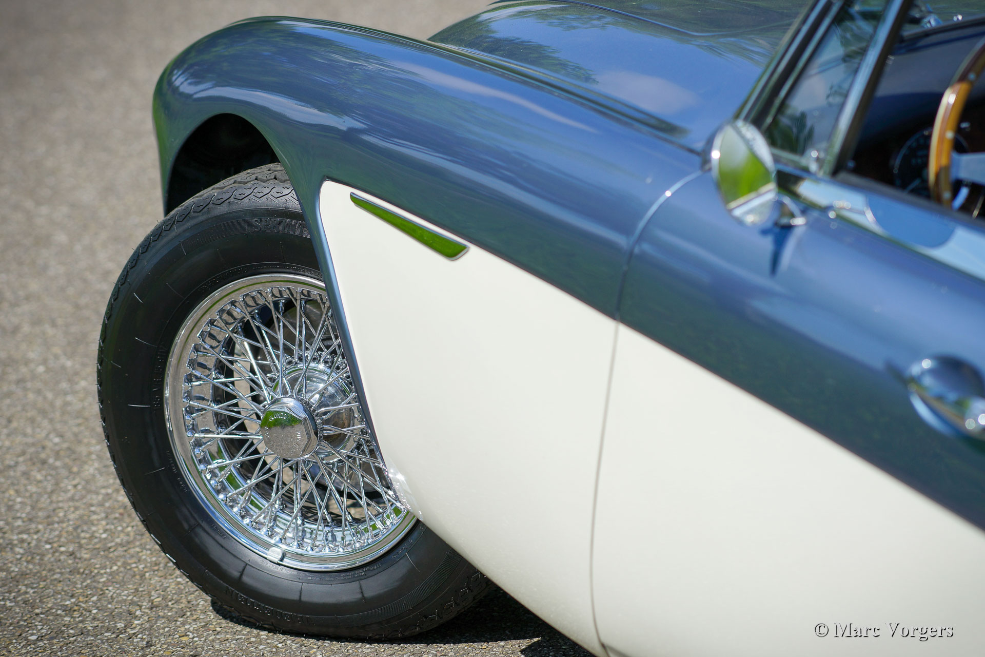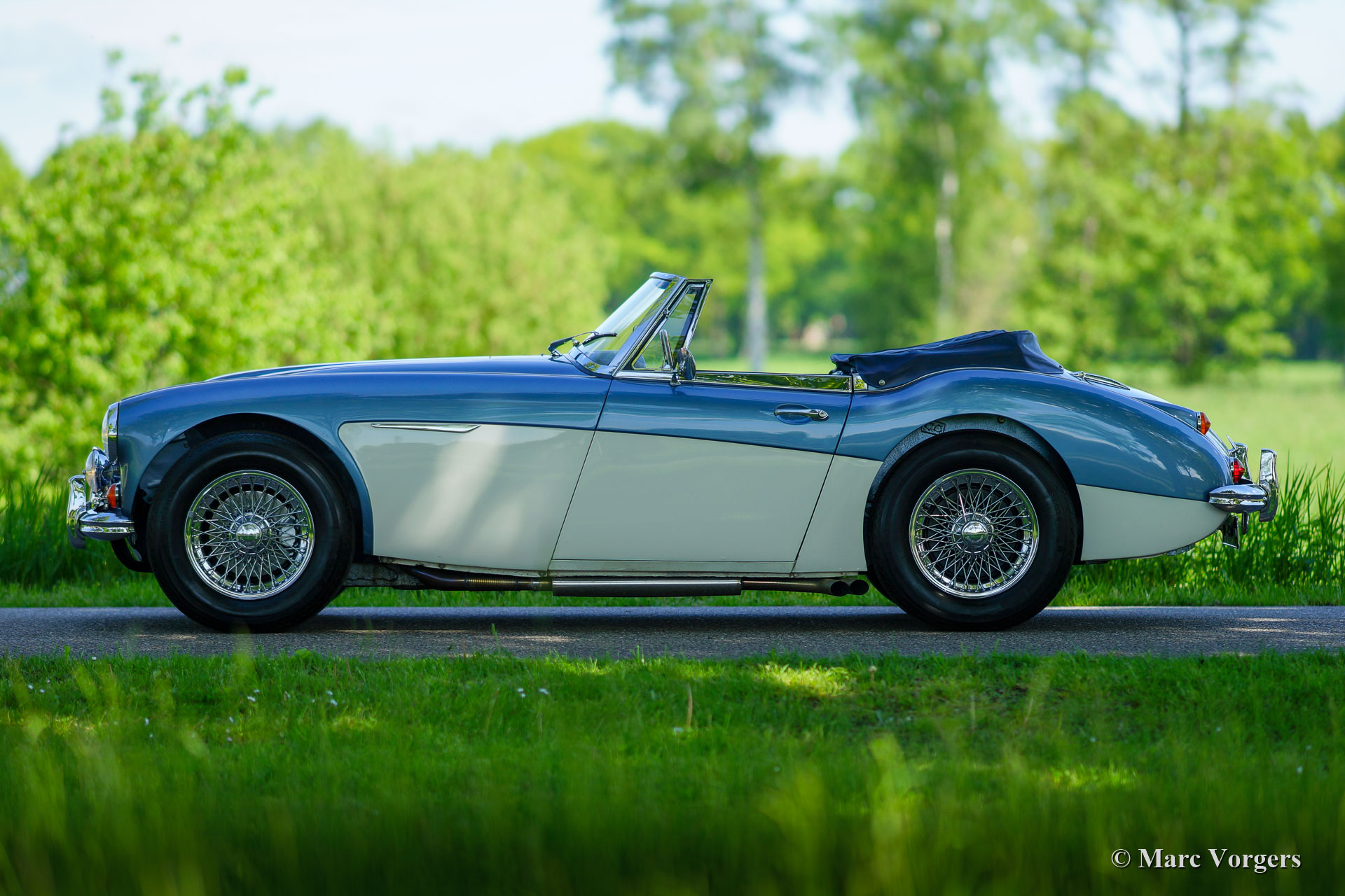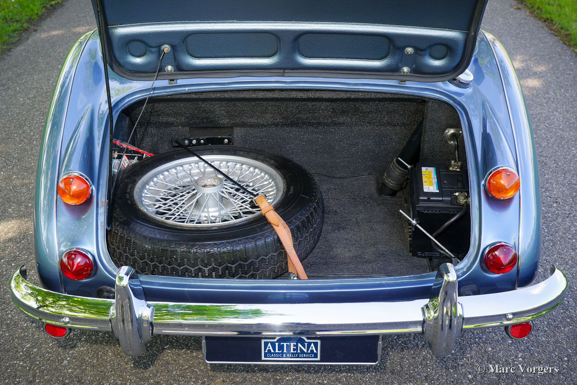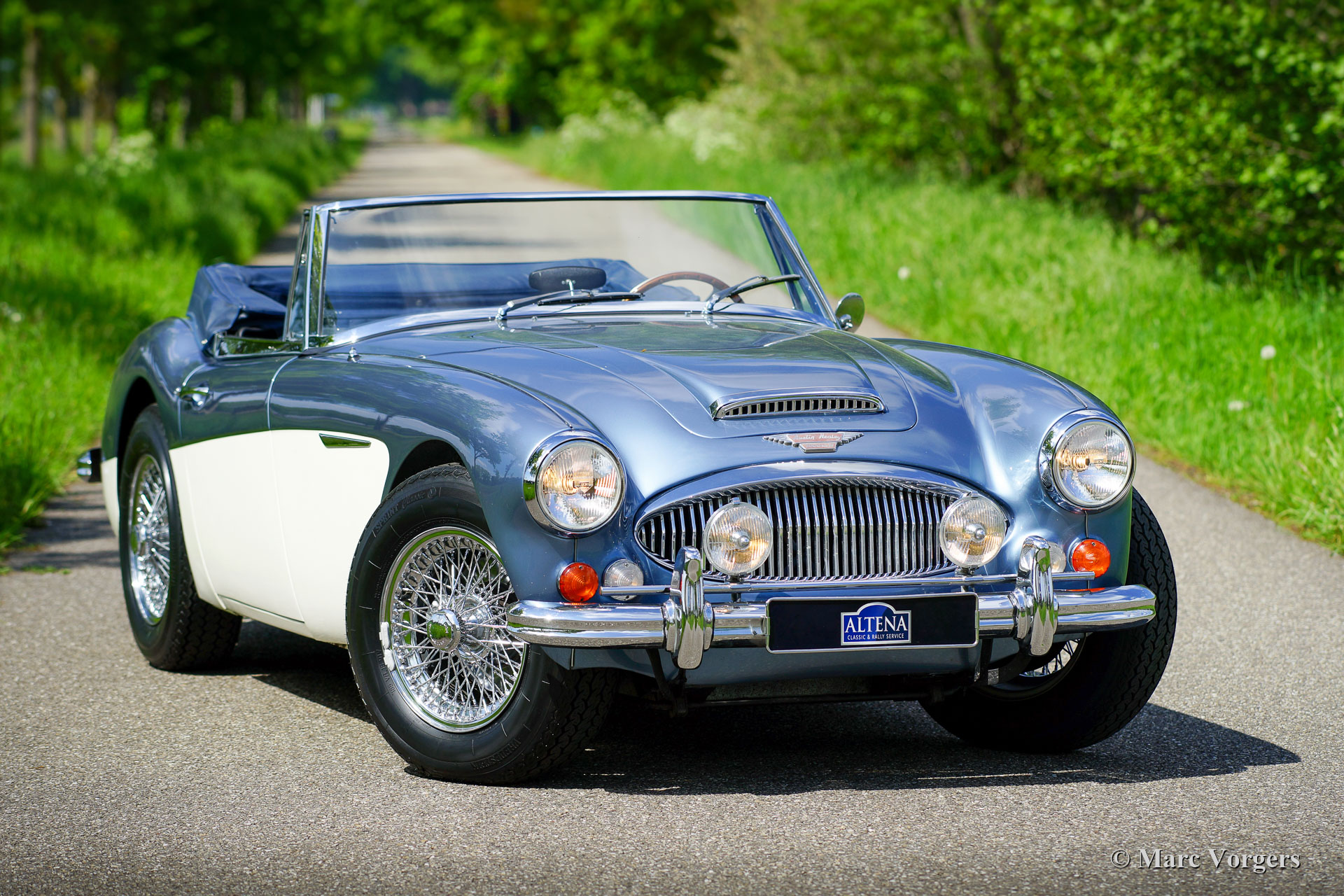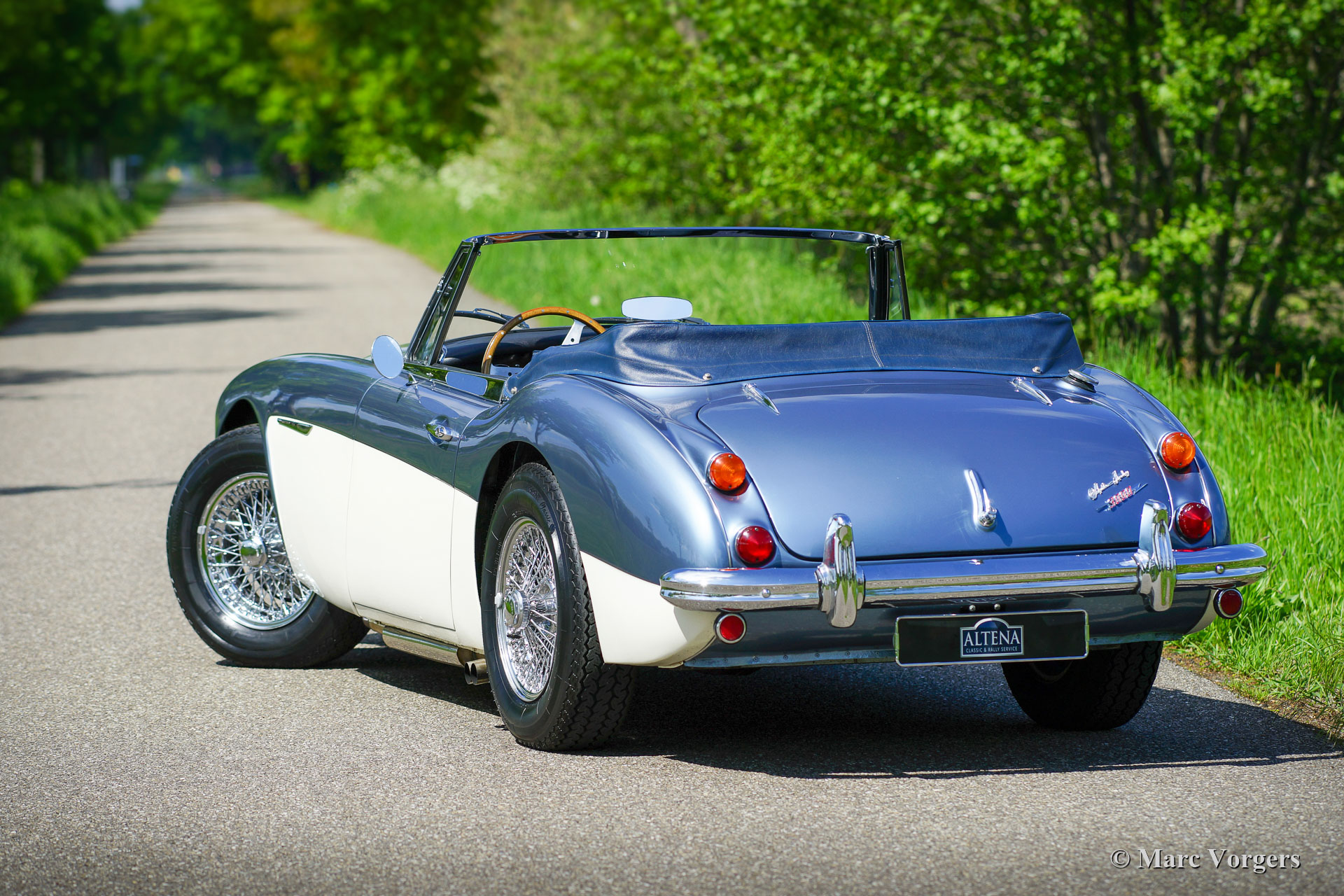 Austin Healey 3000 Mk III Phase 2, Jahr 1966. Farbe Healey Blue Metallic über Old English White kombiniert mit einer dunkelblauen Lederausstattung und dunkelblauem Teppich. Dunkelblaues Verdeck und Verdeck-Abdeckung. Dieser wunderschöne Austin Healey wurde in den USA neu verkauft. Das Auto wurde im Jahr 1979 in die Niederlande verschifft. Das Auto wurde in der Vergangenheit von Austin Healey Spezialist Cees Cardol in den Niederlanden umfassend restauriert, Fotos der Restaurierung sind vorhanden. Dieser „Big Healey“ wird seit 2005 in den Werkstätten von Altena Classic Service gewartet. Altena hat das Auto 2013 an den jetzigen Besitzer verkauft. Dieser wunderschöne Austin Healey ist in einem sehr guten Zustand und das Auto fährt sich wunderbar! Das Auto ist ausgestattet mit Overdrive, verchromte Speichenräder, ein „Badge-bar“ mit einem Paar Lucas SFT576-Nebelscheinwerfern, einen Edelstahl-Seitenauspuff, rote Sicherheitsgurte (Farbe kann geändert werden) und ein MotoLita-Lenkrad mit Holzkranz. Das Auto wird komplett geliefert mit (Service-)Geschichte, einem Heritage-Dokument und einer Originalbroschüre. Das ist ein fantastischer „Big Healey“ in der begehrtesten Farbkombination!