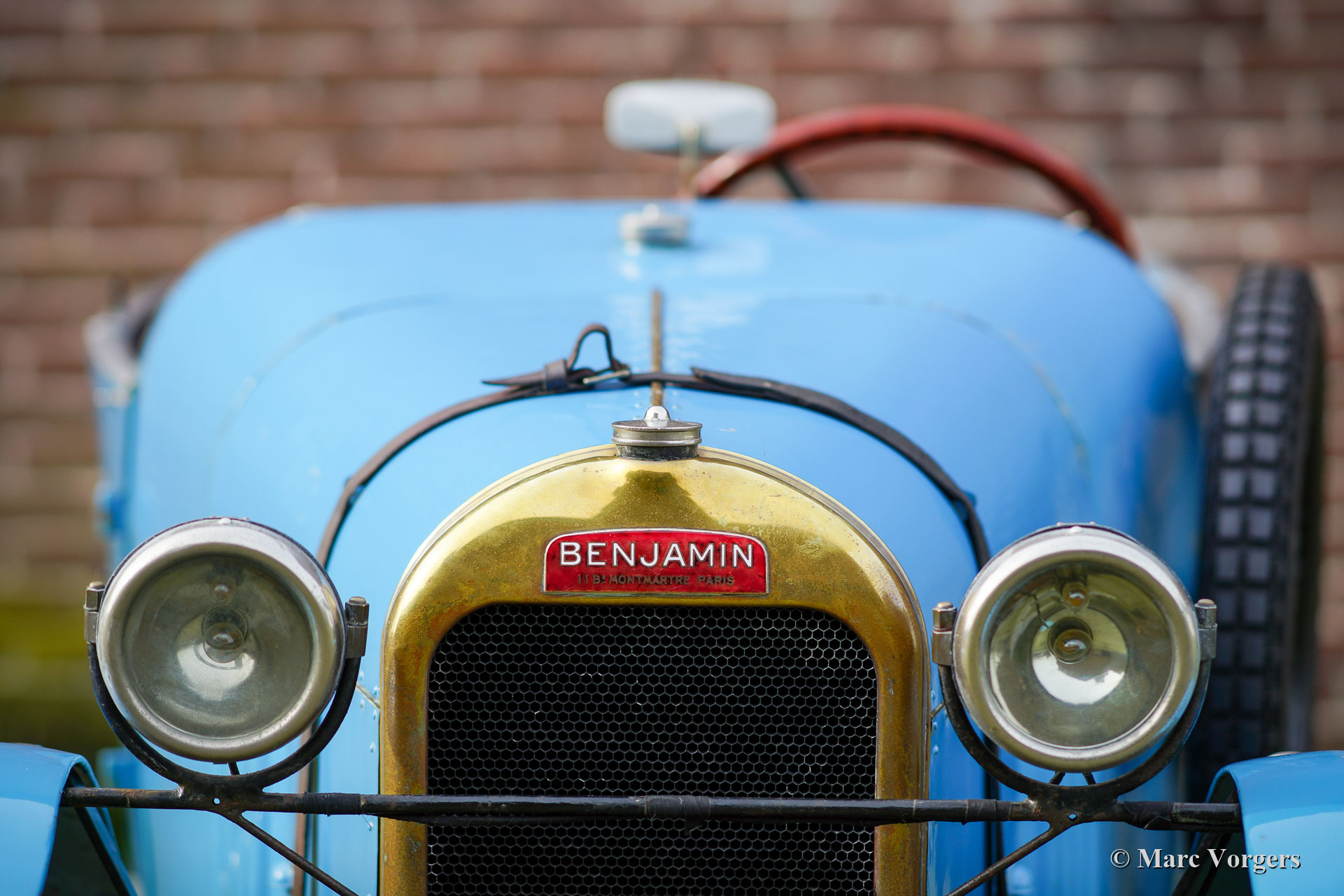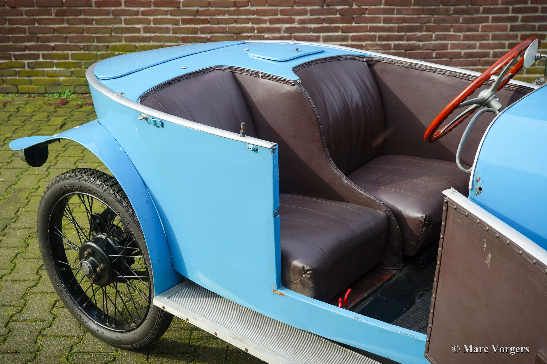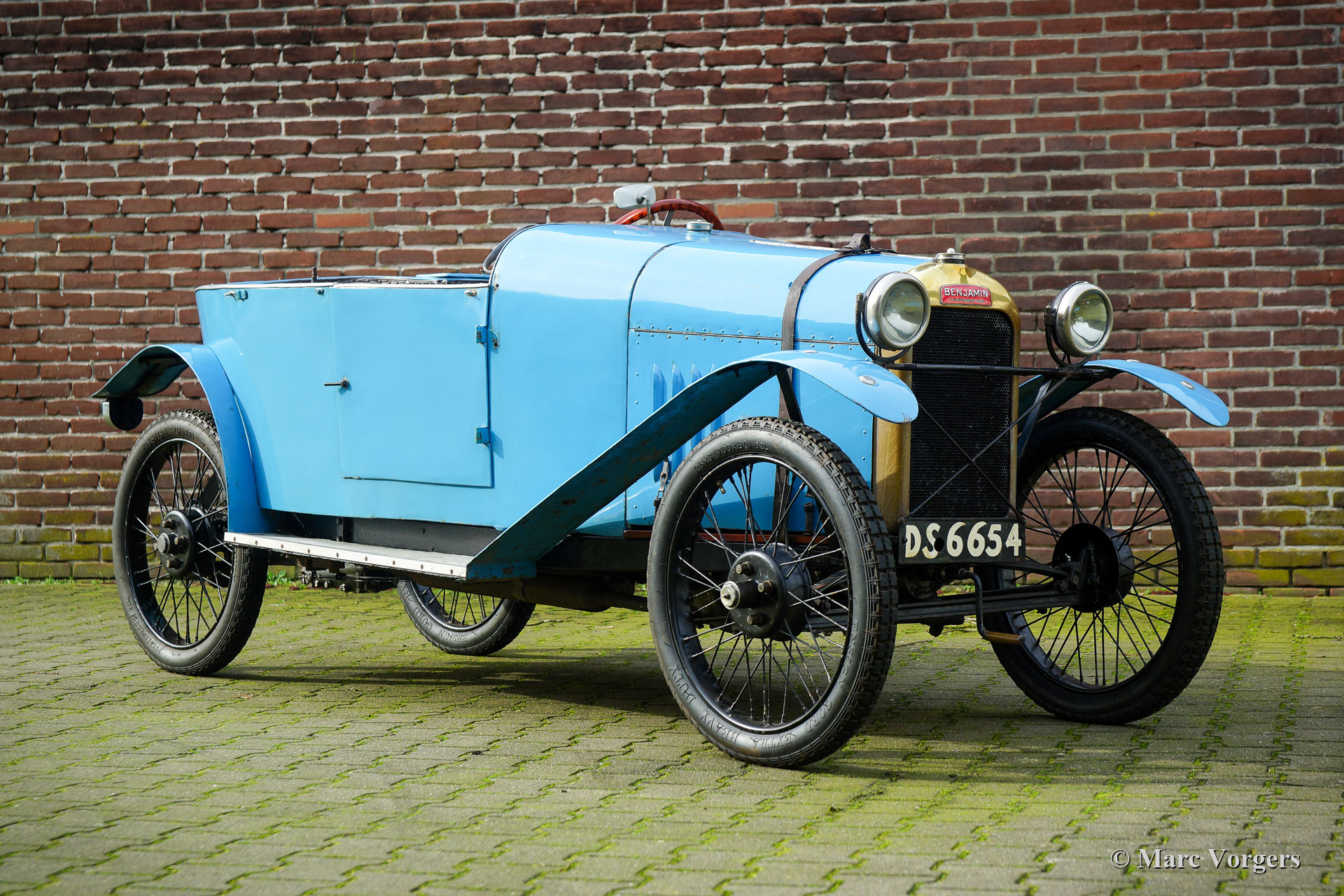 Benjamin Typ B ‘cycle car‘, Jahr 1922. Farbe französisch Blau kombiniert mit schwarzen Speichenrädern und einer braunen Lederausstattung. Laut Vorbesitzern und den Bonhams-Verkaufsinformationen von 2013 war dieses Benjamin Typ B ‘cycle car‘ das 1920er Werksteamauto. Das Auto soll 1922 am französischen Bol d'Or teilgenommen haben. Das Auto wurde von Violette Morris (18. April 1893 - 26. April 1944) gefahren. Weitere Informationen zum farbenfrohen Lebensstil dieser französischen Sportlerin und Rennfahrerin finden Sie in Wikipedia. Das Auto wurde Mitte der 1980er Jahre von Stephen Langton nach Großbritannien importiert. 1988 wurde das Auto von Barry Clarke (ehemaliger Präsident des Vintage Sports Car Club -VSCC-) erworben. Clarke ließ das Auto weitgehend überholen. Die Räder wurden restauriert, der Kühler neu entkernt, der Dynamo und der Anlasser neu aufgebaut, und der Motor überholt. Der nachfolgende Besitzer ließ die Aufhängung überholen, die Rad- und Kardanwellenlager erneuern und zwei Trommelbremsen ersetzen. Darüber hinaus wurde der Zylinderkopf für 14-mm-Zündkerzen modifiziert, die Nockenwelle neu profiliert, die Kupplung repariert und ein SU-Vergaser mit einem neuen Ansaugkrümmer ausgestattet. Im Laufe der Jahre wurde viel über diesen Benjamin geschrieben und das Auto hat an verschiedenen VSCC-Fahrversuchen und -demonstrationen teilgenommen. Dieses seltene Auto befindet sich in einem guten, fahrbereiten Zustand. Eine entzückende Maschine für den Liebhaber des Vorkriegsautos, der ein Auto sucht, an dem er basteln und an besonderen historischen Ereignissen teilnehmen kann.
