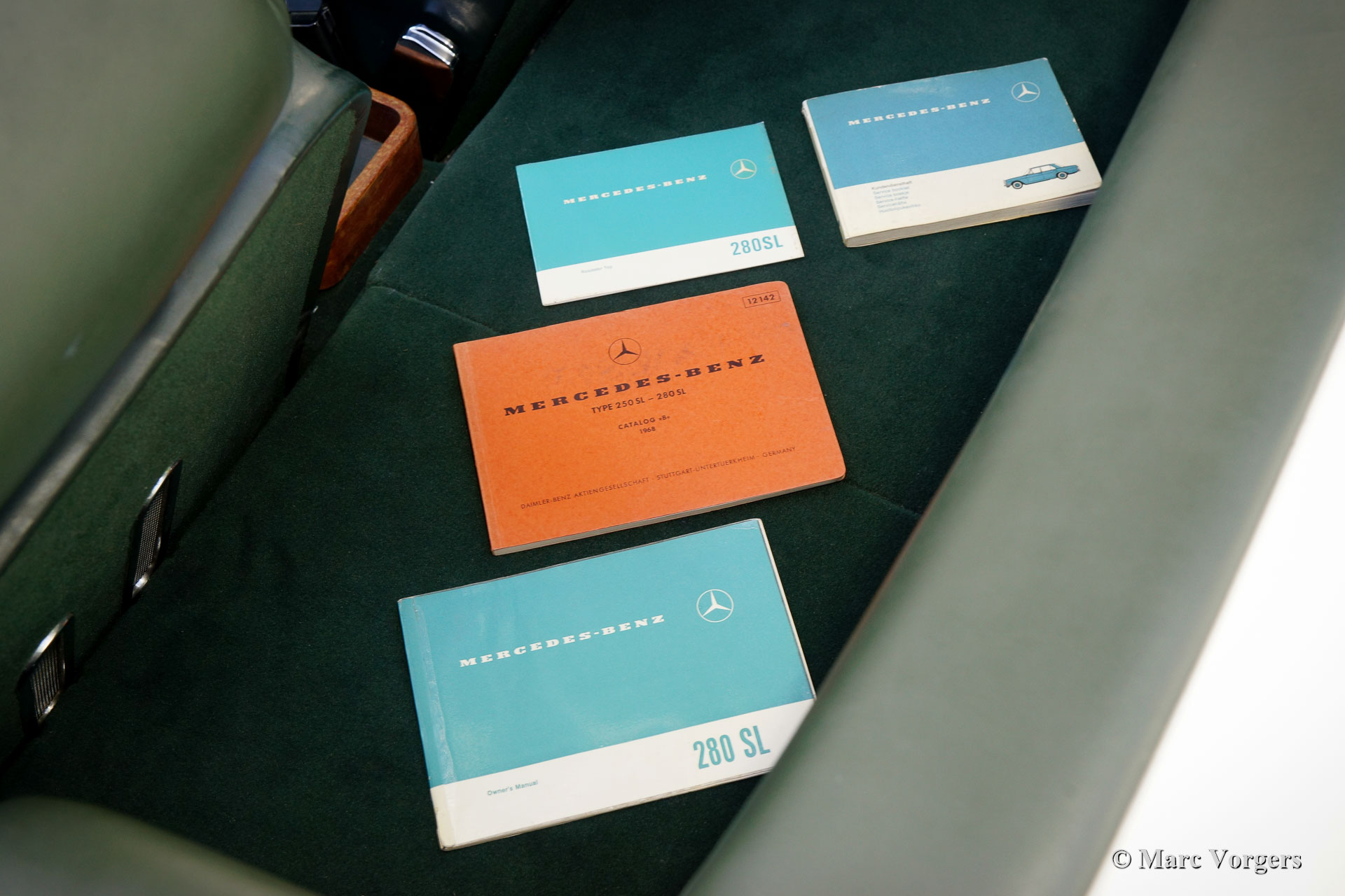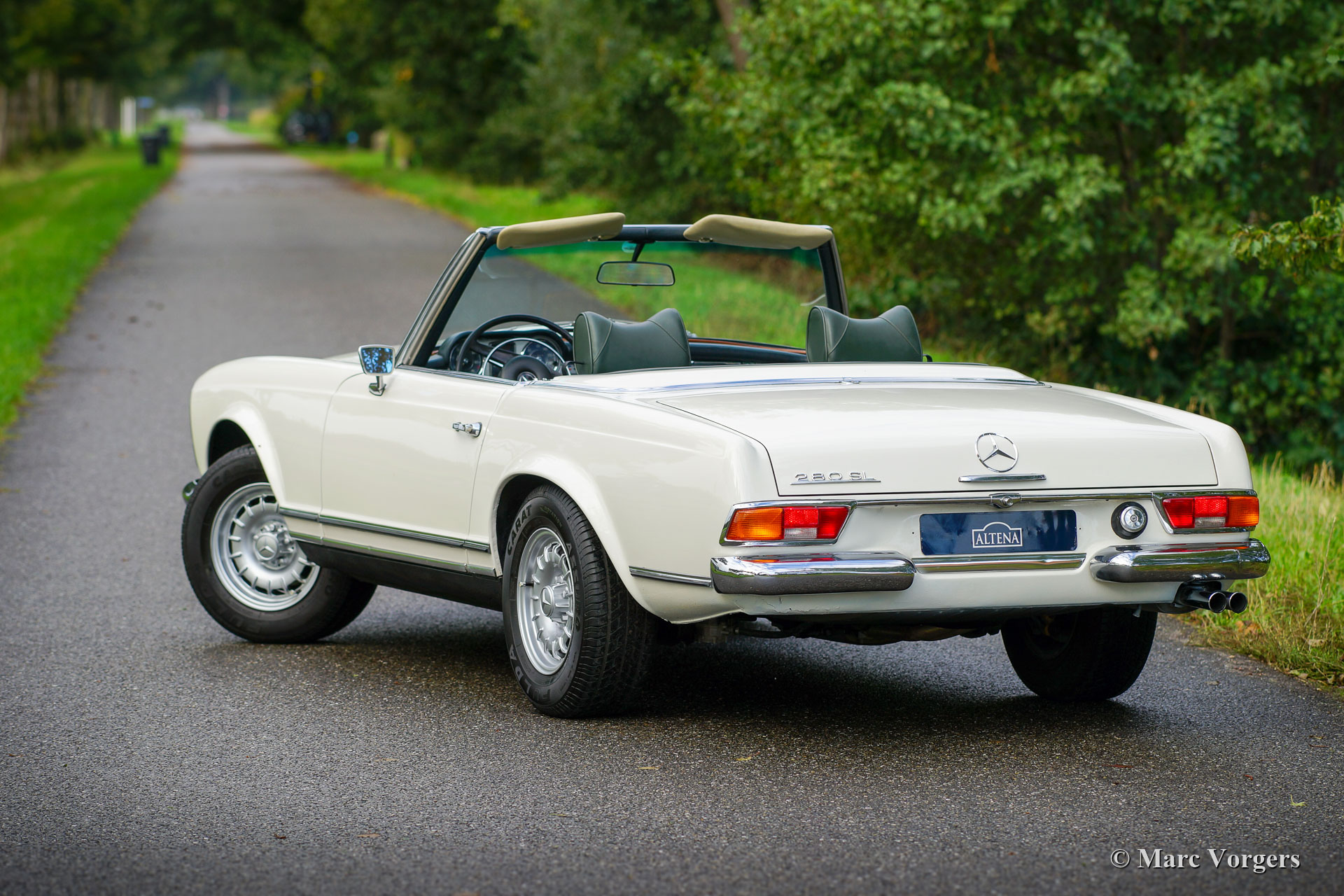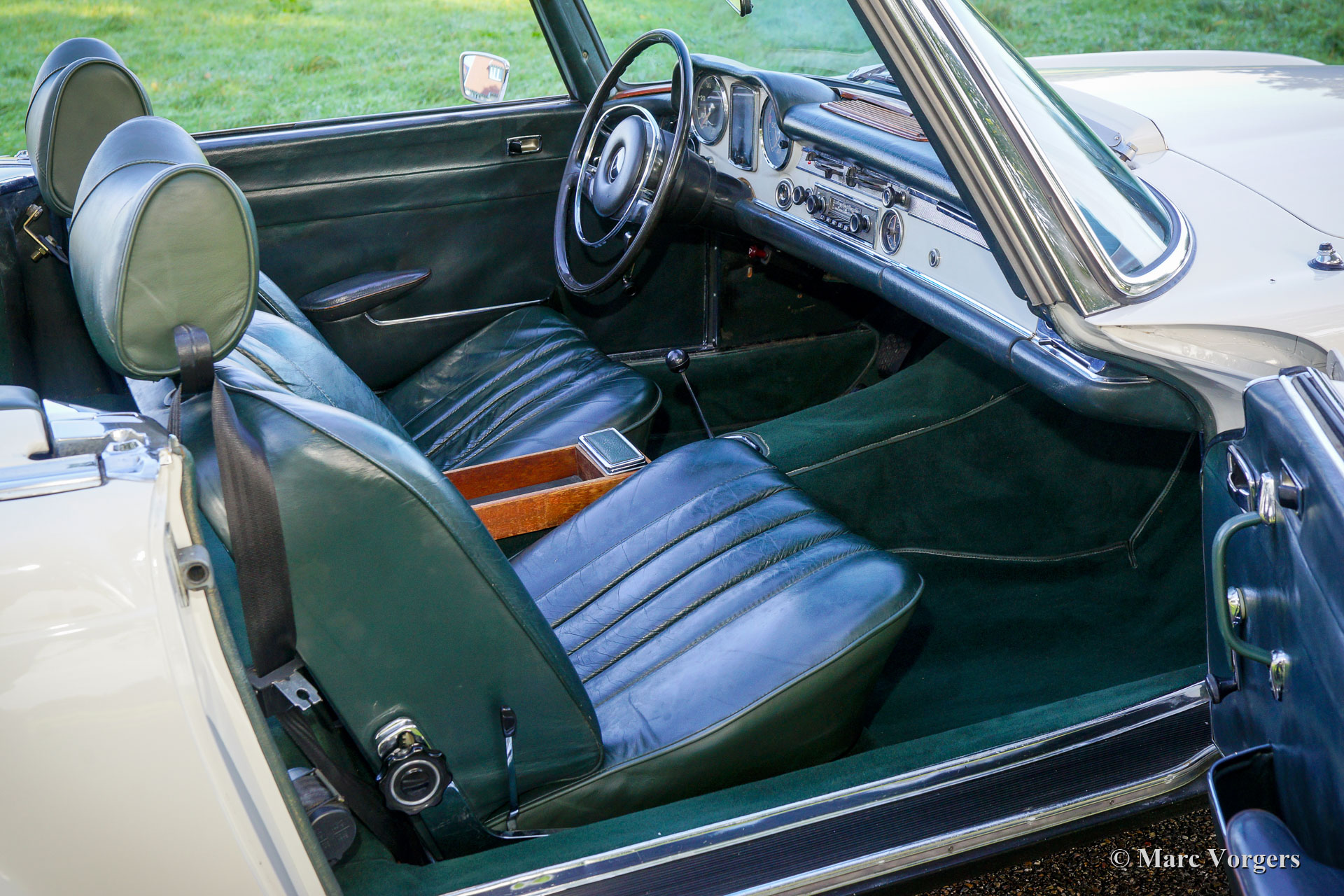 Mercedes-Benz 280 SL „Pagode“, Jahr 1968. Farbe Elfenbeinweiß kombiniert mit einer dunkelgrünen Lederausstattung und einem passenden Teppich. Dunkelgrüne Mohair Haube und Hardtop in Wagenfarbe. Dieser schöne Mercedes-Benz 280 SL wurde neu in Großbritannien (Sussex) verkauft. Dies mit Linkslenkung und Kilometerzähler mit km/h Schriftzug. Möglicherweise war der erste Besitzer ein häufiger Besucher von Europäische Länder Übersee. Dieser feine 280 SL befindet sich in einem sehr guten und sehr originellen Zustand. Das Auto wurde in der Vergangenheit nur in der Originalfarbe perfekt neu lackiert. Die originalen Schweißpunkte sind immer noch sichtbar, wie sie sollten. Der Innenraum ist vollständig original und intakt und weist leichte Gebrauchsspuren. Der Motorraum ist in einem fast neuwertigen Zustand und die Chromteile sind brillant! Dieser Mercedes-Benz 280 SL wurde im Laufe der Jahre sehr gut gewartet und gepflegt, der Sechszylinder Motor läuft kraftvoll und das Automatikgetriebe schaltet sehr gut. Das Auto wird komplett mit den Originalbroschüren geliefert, einschließlich des Servicebuchs. Dieser 280 SL der letzten Generation ist ausgestattet mit den wunderschönen MB-Leichtmetallrädern, dem seltenen originalen Blaupunkt Frankfurt-Autoradio und getöntem Glas. Dies ist ein super originaler "europäischer" Mercedes-Benz 280 SL in einem sehr guten und schönen Zustand!