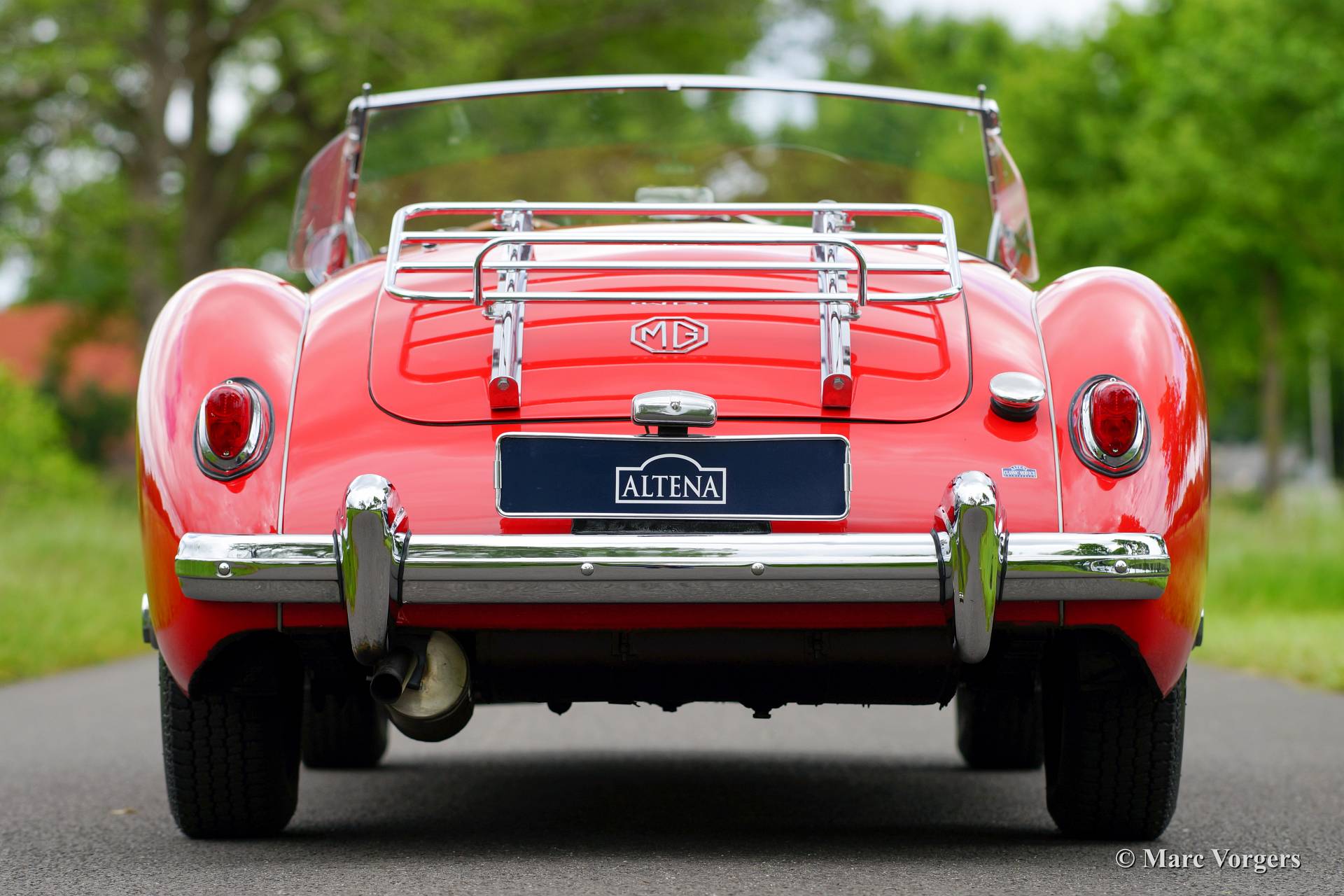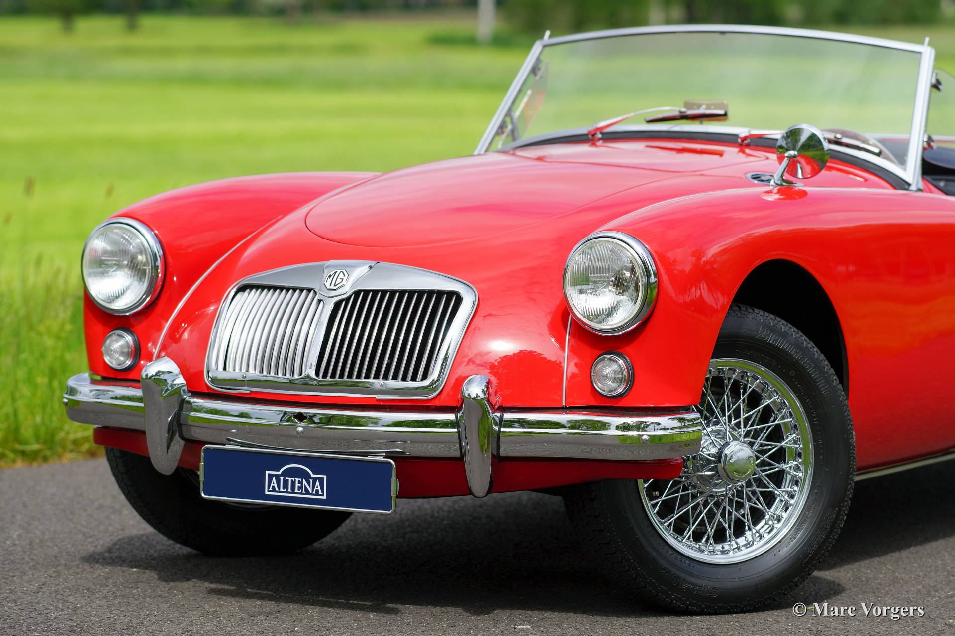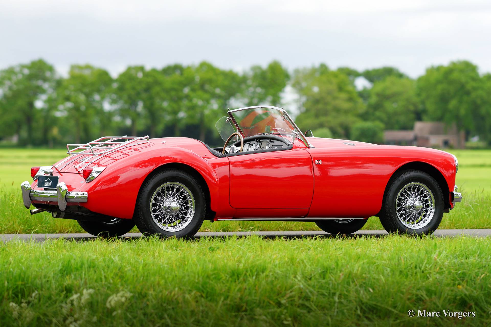 MG MGA 1500 Roadster, Jahr 1957. Farbe Rot mit einem schwarzen Leder-Interieur und einem schwarzen Verdeck. Dieses schöne und stilvolle MGA 1500 ist in einem sehr guten Zustand und das Auto fährt herrlich! Das Auto wurde in der Vergangenheit ausgestattet mit dem stärkeren 1600 Motor. Das ist natürlich eine Verbesserung des Fahrerlebnisses! Die Service-Geschichte ist bekannt und dokumentiert. Das Automobil wird geliefert mit neuen Vredestein Classic Reifen, Bedienungsanleitung, und Ersatzschlüssel.