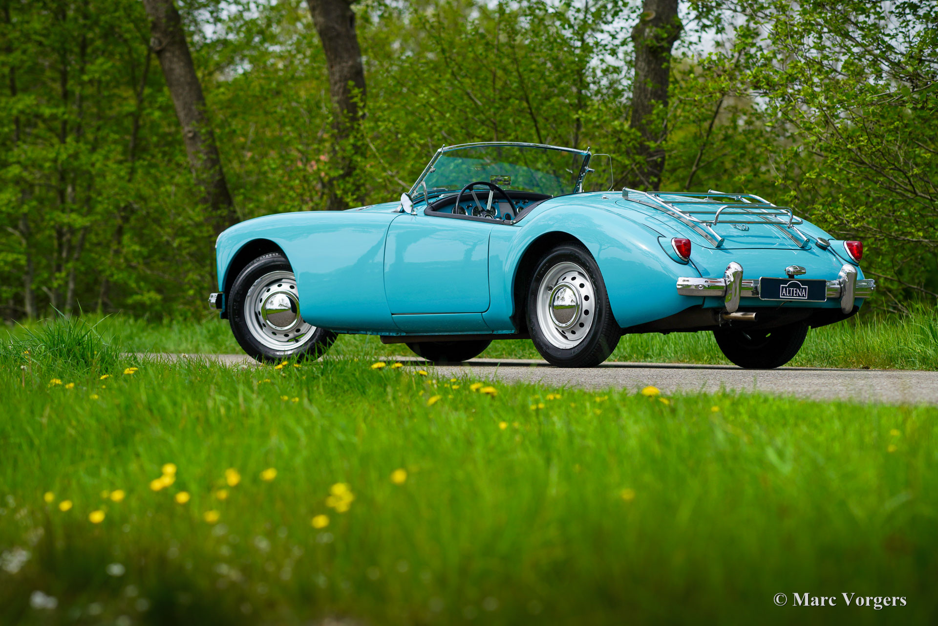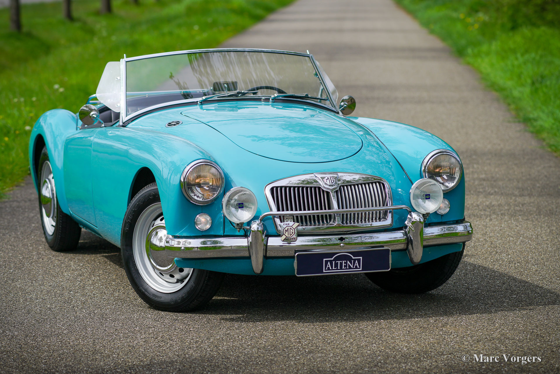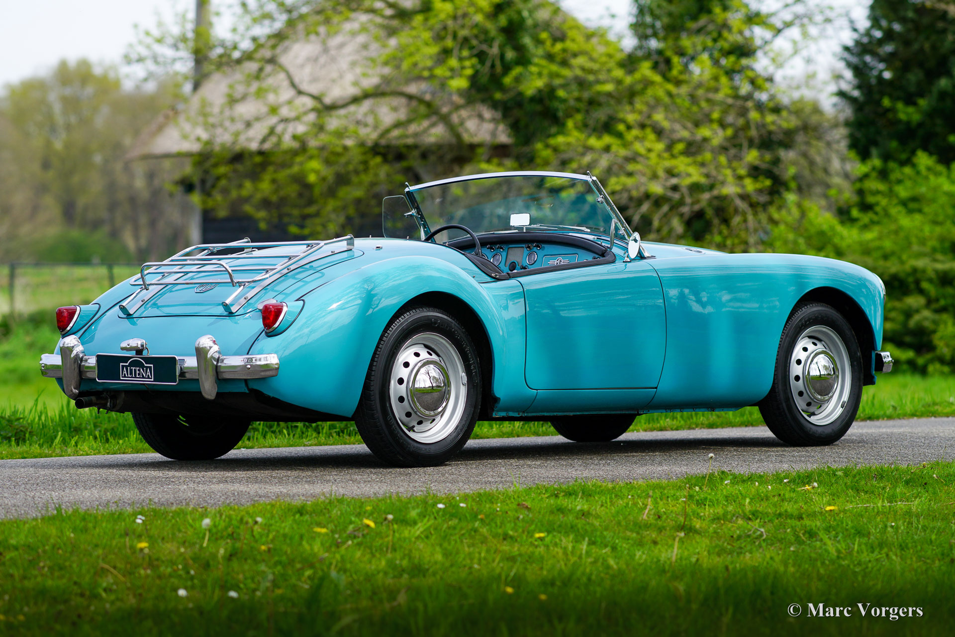 MG MGA 1500 Roadster, 1957. Farbe Pazifikgrün kombiniert mit schwarzer Lederausstattung und schwarzem Teppich. Schwarzes Vinyl-Verdeck, Seitenfenster und Persenning. Dieser wunderschöne MGA 1500 Roadster wurde in den USA neu verkauft. Im Jahr 1996 wurde das Auto in die Niederlande importiert und umfassend restauriert und in einen Topzustand gebracht! Natürlich wurde das Auto wieder in der fantastischen Originalfarbe lackiert. Altena Classic Service (ACS) verkaufte das Auto im Jahr 2006 an den jetzigen Besitzer. Das Auto wurde viele Jahre lang in der Werkstatt von ACS gewartet. Dieser wundervolle MG MGA 1500 Roadster ist in einem sehr guten bis hervorragenden Zustand. Das Auto weist leichte Gebrauchsspuren auf und fährt einwandfrei. Dieser MGA wird mit einer vollständigen Geschichtsdatei geliefert. Dieser MGA-Roadster weist alle Originaldetails auf, wie das Originallenkrad und die Stahlscheibenräder mit verchromten Radkappen. Das Auto ist ausgestattet mit Windabweisern am Windschutzscheibenrahmen, einem Gepäckträger aus Edelstahl, einem Paar zusätzlicher Hella-Scheinwerferlampen vorne und Firestone 155/15-Reifen. Dieser wundervolle MG MGA 1500 Roadster ist in den Händen des neuen Besitzers bereit für jedes sonnige Abenteuer.