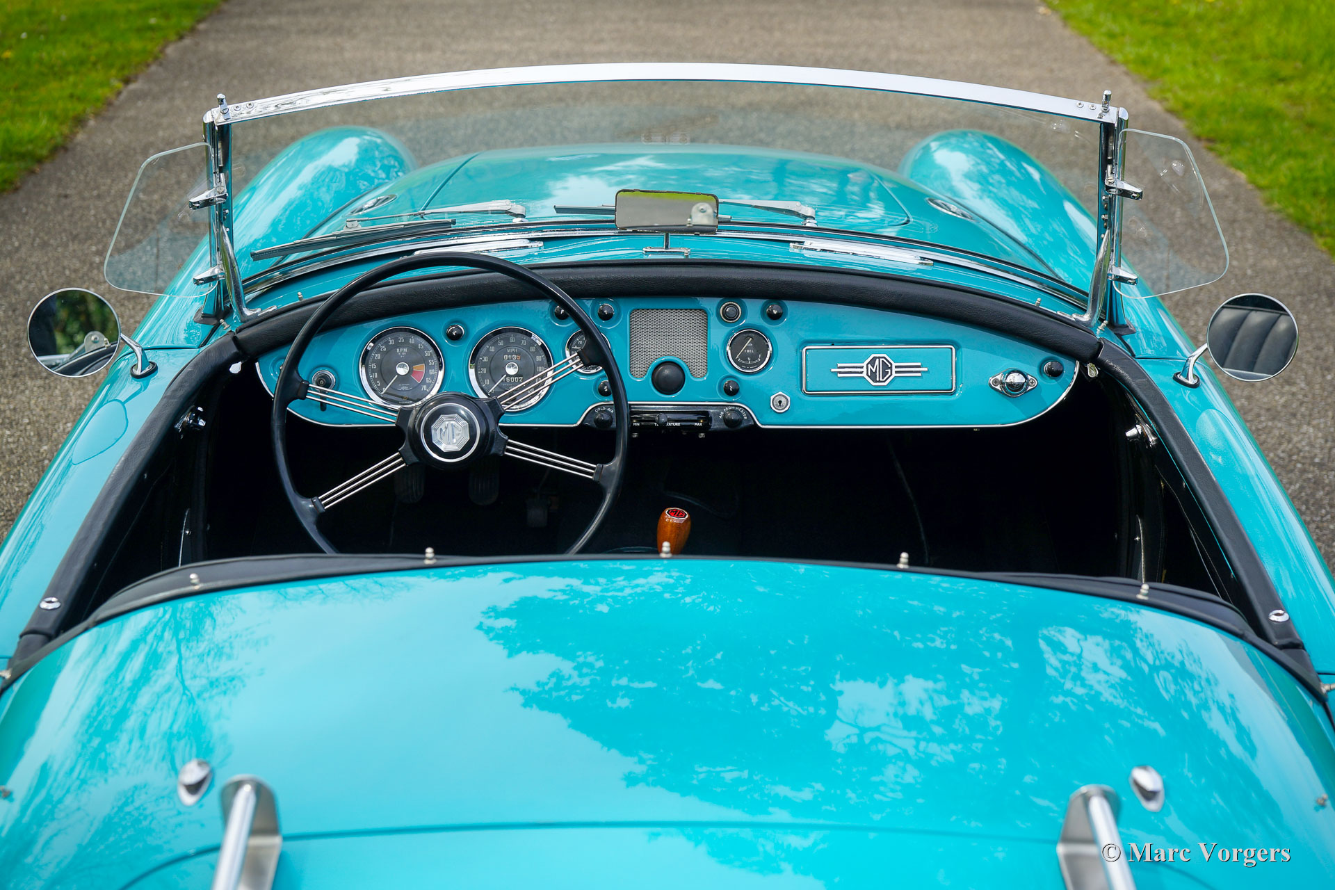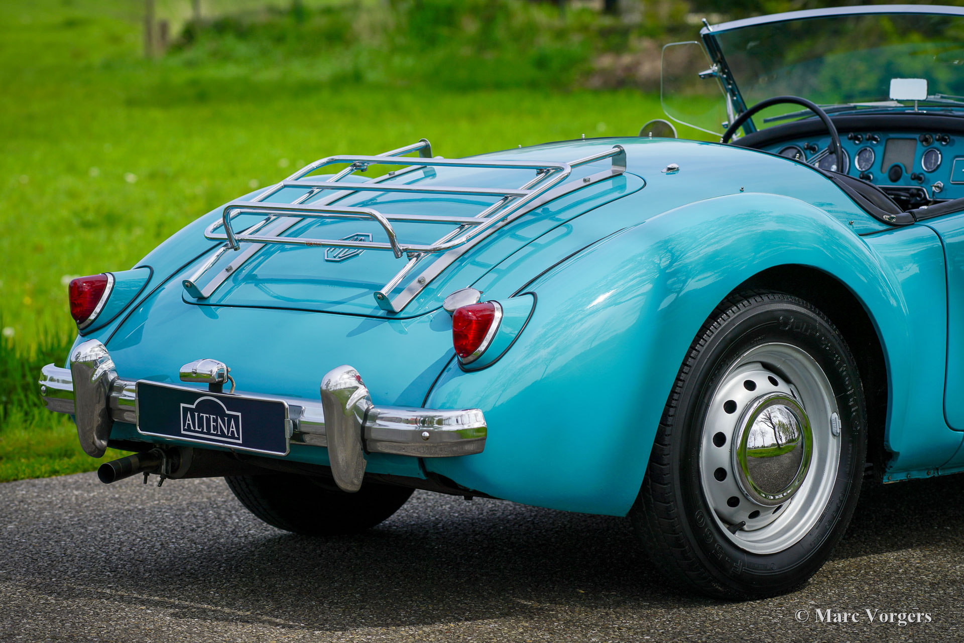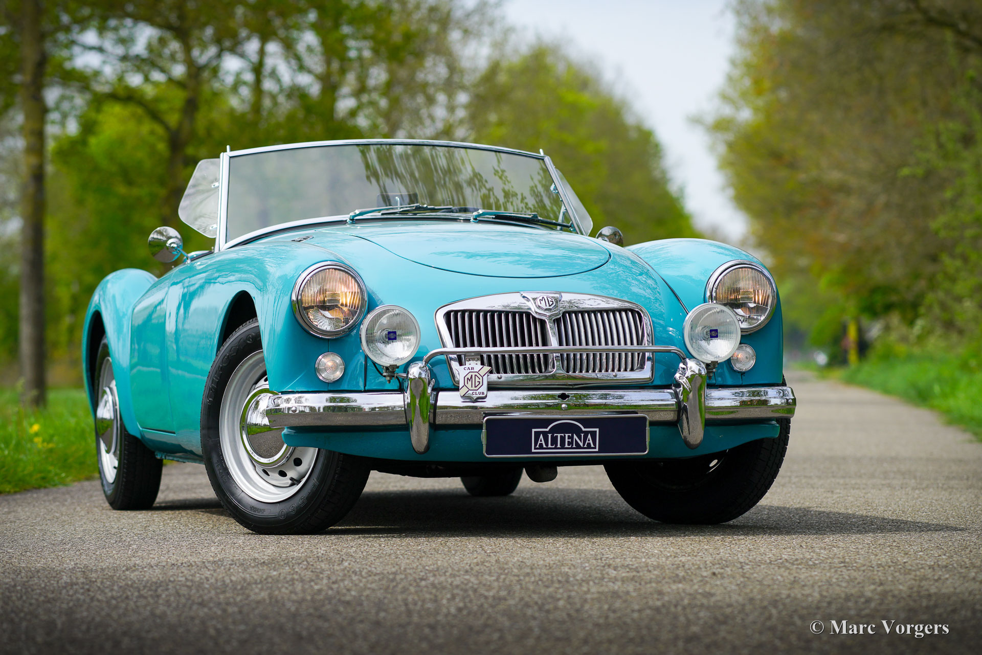 MG MGA 1500 Roadster, 1957. Farbe Pazifikgrün kombiniert mit schwarzer Lederausstattung und schwarzem Teppich. Schwarzes Vinyl-Verdeck, Seitenfenster und Persenning. Dieser wunderschöne MGA 1500 Roadster wurde in den USA neu verkauft. Im Jahr 1996 wurde das Auto in die Niederlande importiert und umfassend restauriert und in einen Topzustand gebracht! Natürlich wurde das Auto wieder in der fantastischen Originalfarbe lackiert. Altena Classic Service (ACS) verkaufte das Auto im Jahr 2006 an den jetzigen Besitzer. Das Auto wurde viele Jahre lang in der Werkstatt von ACS gewartet. Dieser wundervolle MG MGA 1500 Roadster ist in einem sehr guten bis hervorragenden Zustand. Das Auto weist leichte Gebrauchsspuren auf und fährt einwandfrei. Dieser MGA wird mit einer vollständigen Geschichtsdatei geliefert. Dieser MGA-Roadster weist alle Originaldetails auf, wie das Originallenkrad und die Stahlscheibenräder mit verchromten Radkappen. Das Auto ist ausgestattet mit Windabweisern am Windschutzscheibenrahmen, einem Gepäckträger aus Edelstahl, einem Paar zusätzlicher Hella-Scheinwerferlampen vorne und Firestone 155/15-Reifen. Dieser wundervolle MG MGA 1500 Roadster ist in den Händen des neuen Besitzers bereit für jedes sonnige Abenteuer.