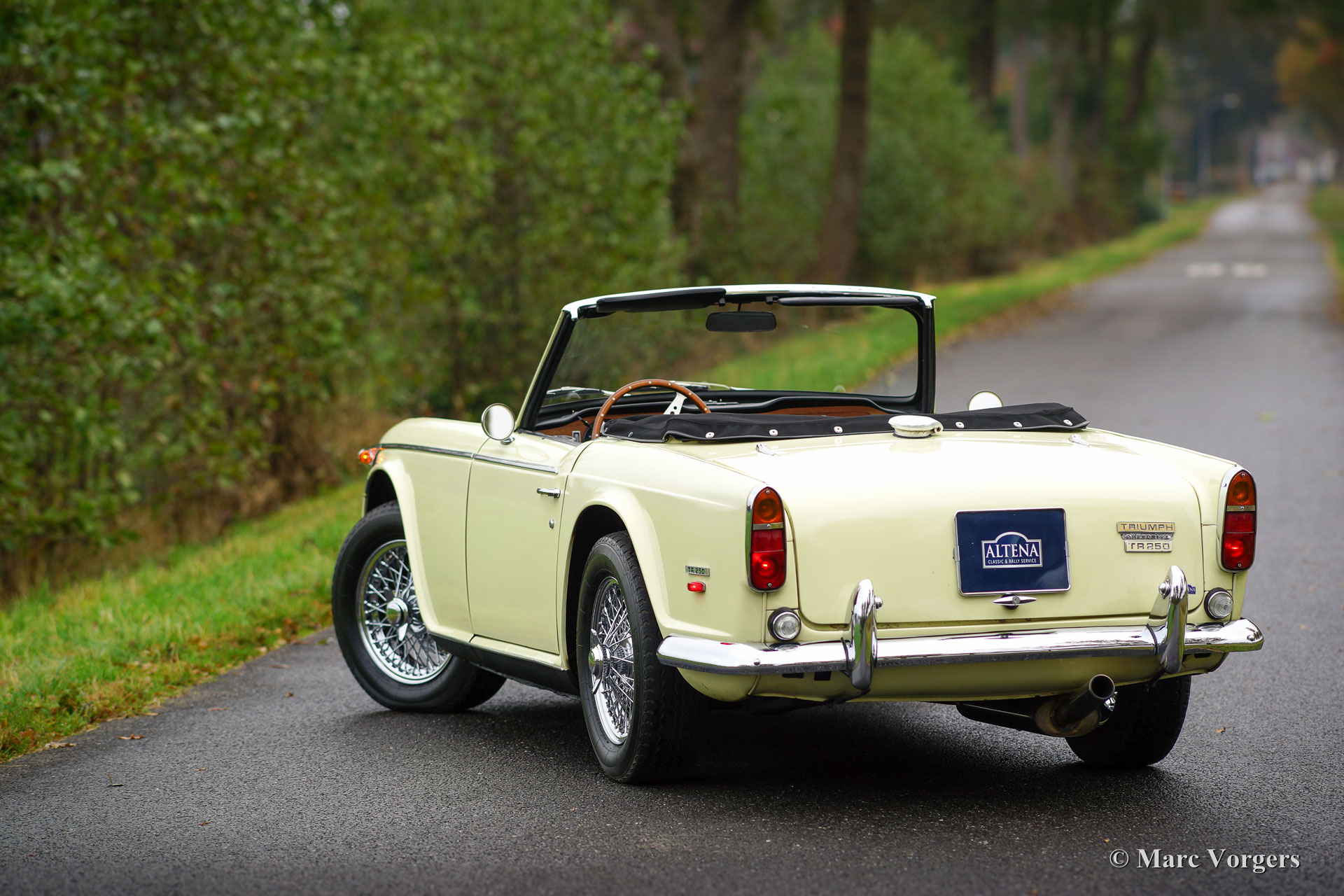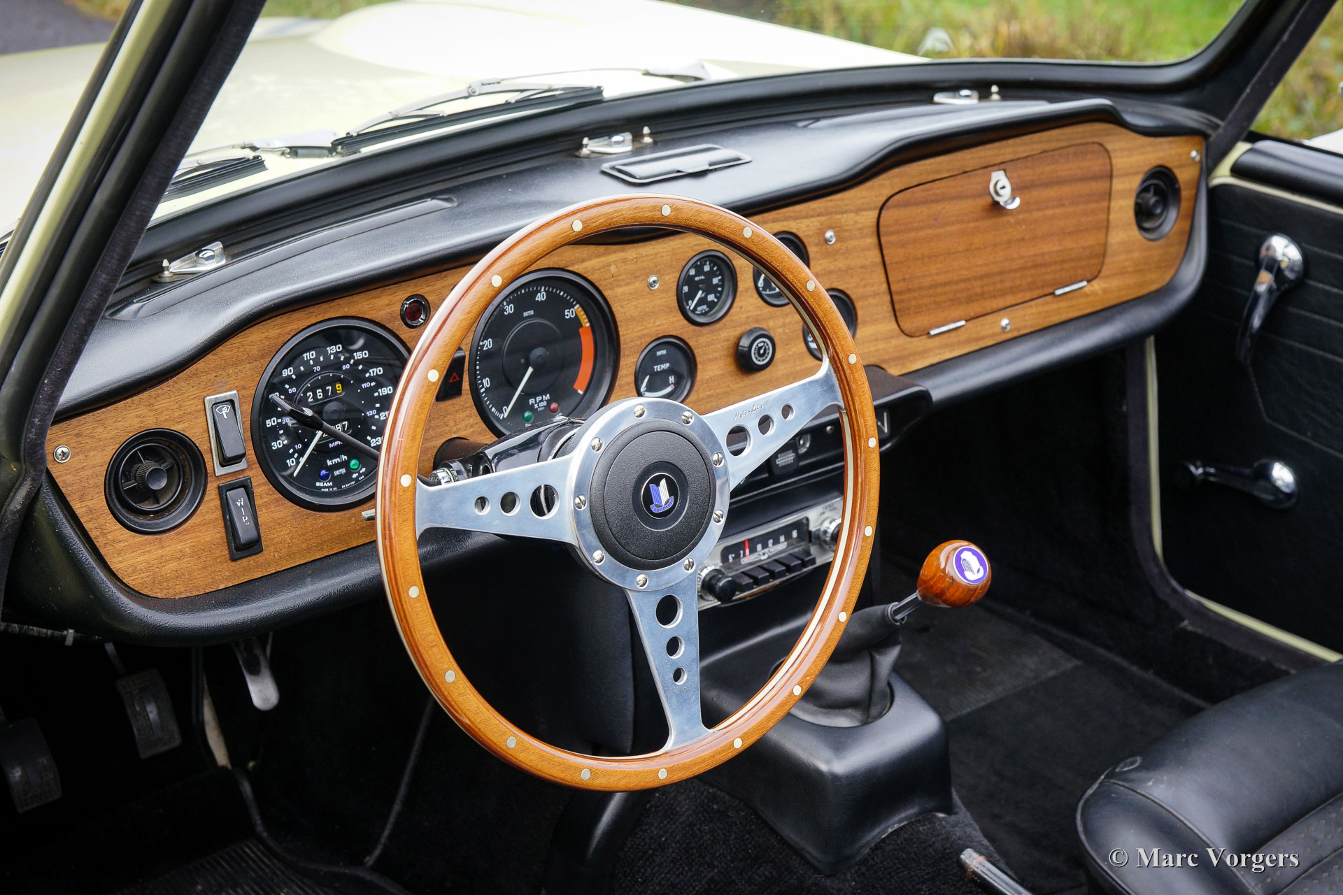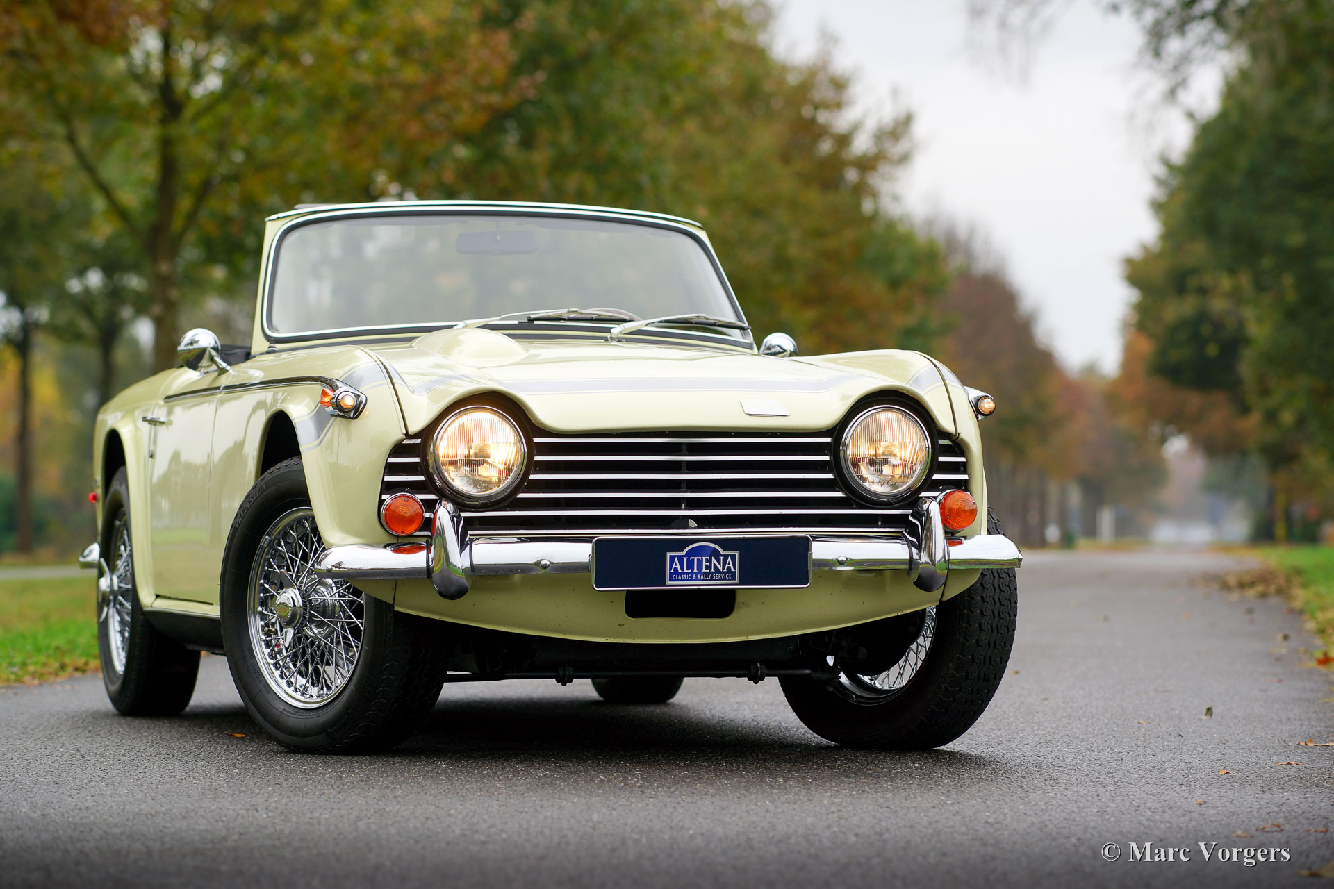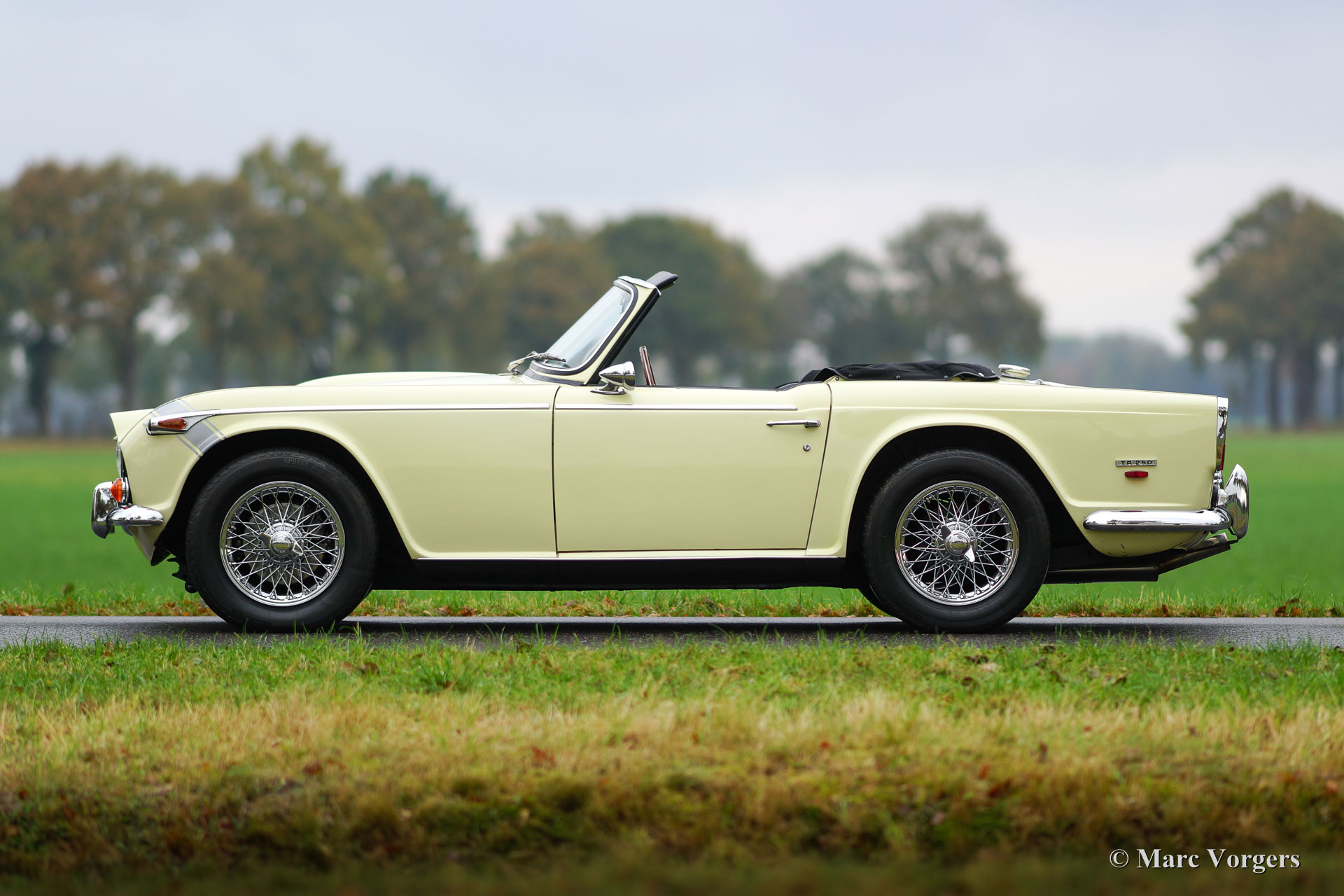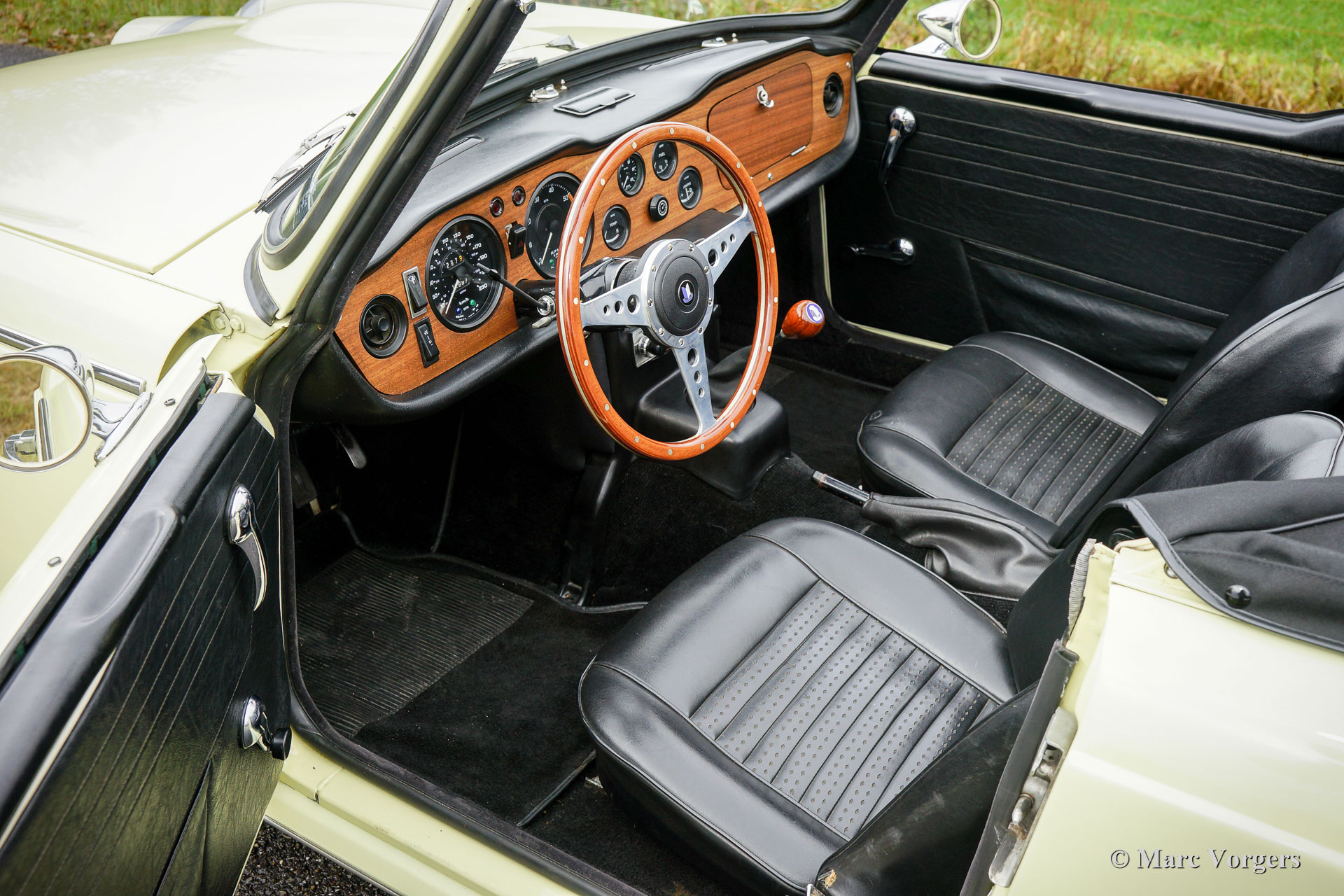Triumph TR 250, Jahr 1968. Farbe ‘Primrose‘ Gelb mit einem schwarzen Kunstleder-Interieur und schwarzem Teppich. Neues schwarzes Verdeck. Diese schöne und relativ seltene Triumph TR 250 ist in einem sehr guten Zustand und das Auto fährt perfekt! Das Auto verfügt über Overdrive, Chrom Speichen Räder, einen Sportauspuff, K & N Sportluftfilter, ein klassische Triumph-Radio und ein schönes Moto-Lita Sportlenkrad mit Holzkranz. Dieser Triumph TR 250 ist ein herrlicher und praktischer britischer Sport-Roadster; ausgestattet mit einem herrlichen Sechszylindermotor!