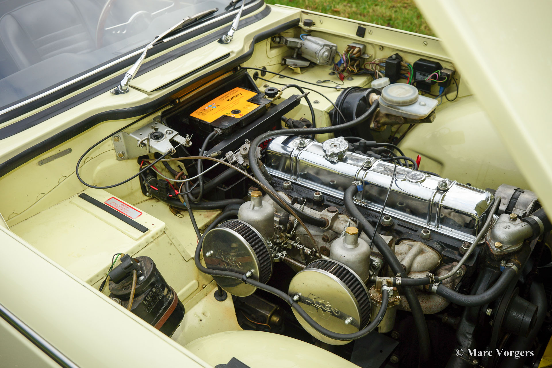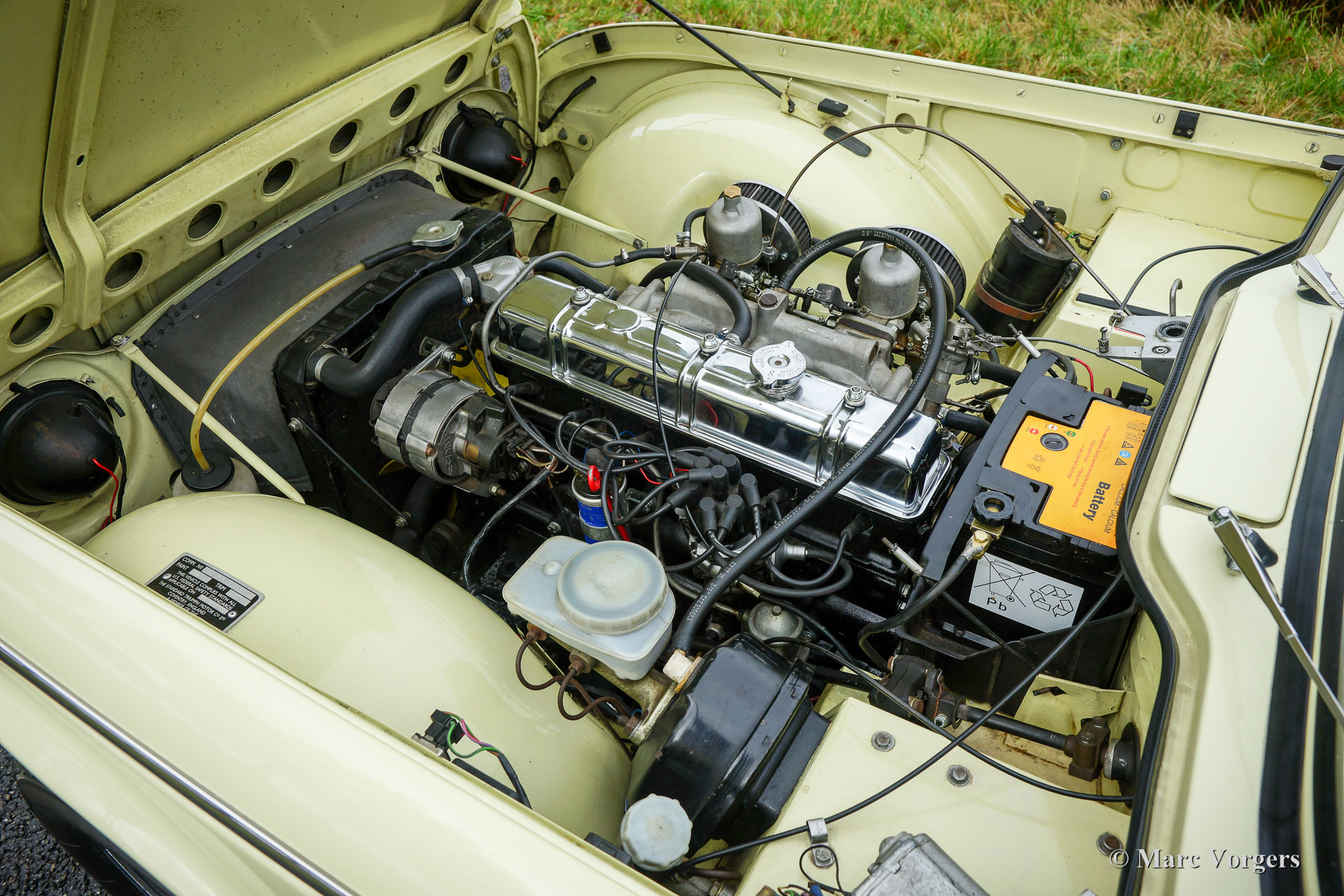 The six cylinder engine originally came from the Triumph 2000 saloon. For use in the TR 5/ TR 250 Triumph enlarged the cylinder capacity up to 2498 cc., fitted a more racy camshaft and petrol injection. Result was that they gained 60 bhp. (TR5) to the standard engine, enough for the engine to be used in a sports car like the TR 5/ TR 250.
