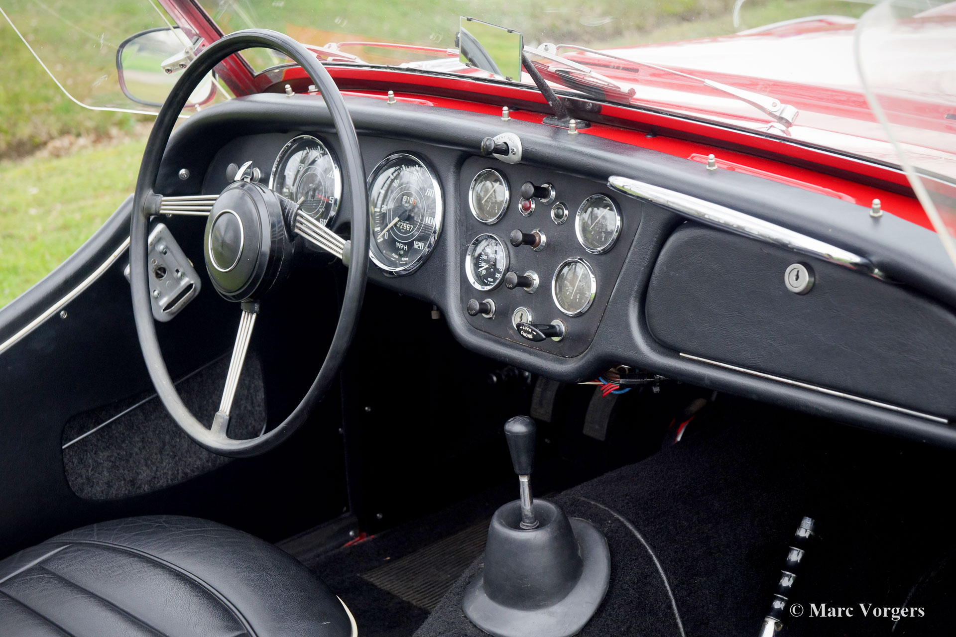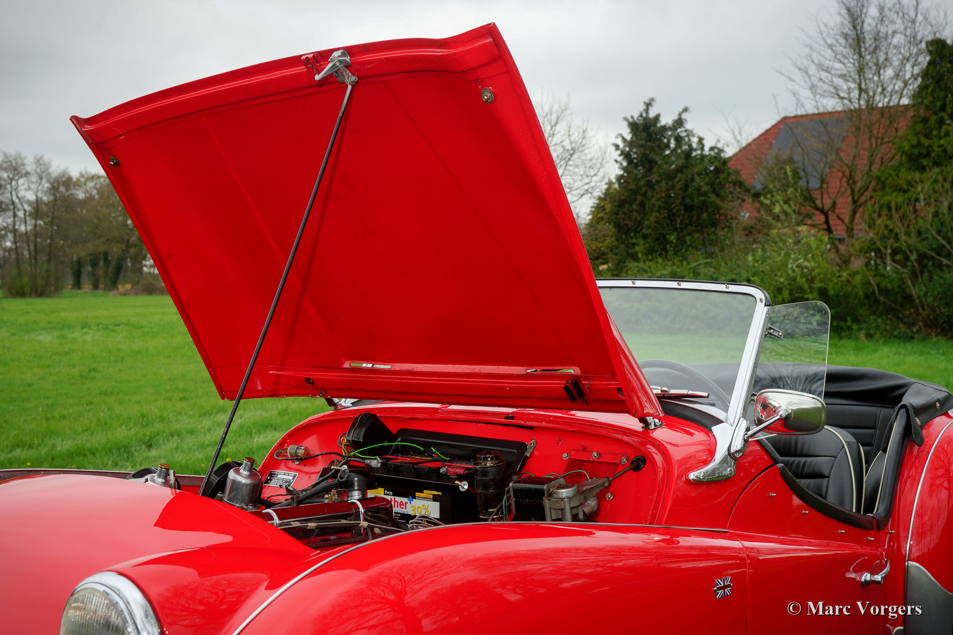 The Triumph TR 3 is a no nonsense sports car; very robust, simple and reliable, a true British sports car all over. The TR 3 was the first production car, off factory, equipped with disc brakes on the front-wheels. The engine was a Standard Vanguard based, cast-iron, long stroke, in-line four cylinder with a displacement of 1991cc. The TR 3 engine was equipped with two carburettors giving a power-output of almost 100 bhp.