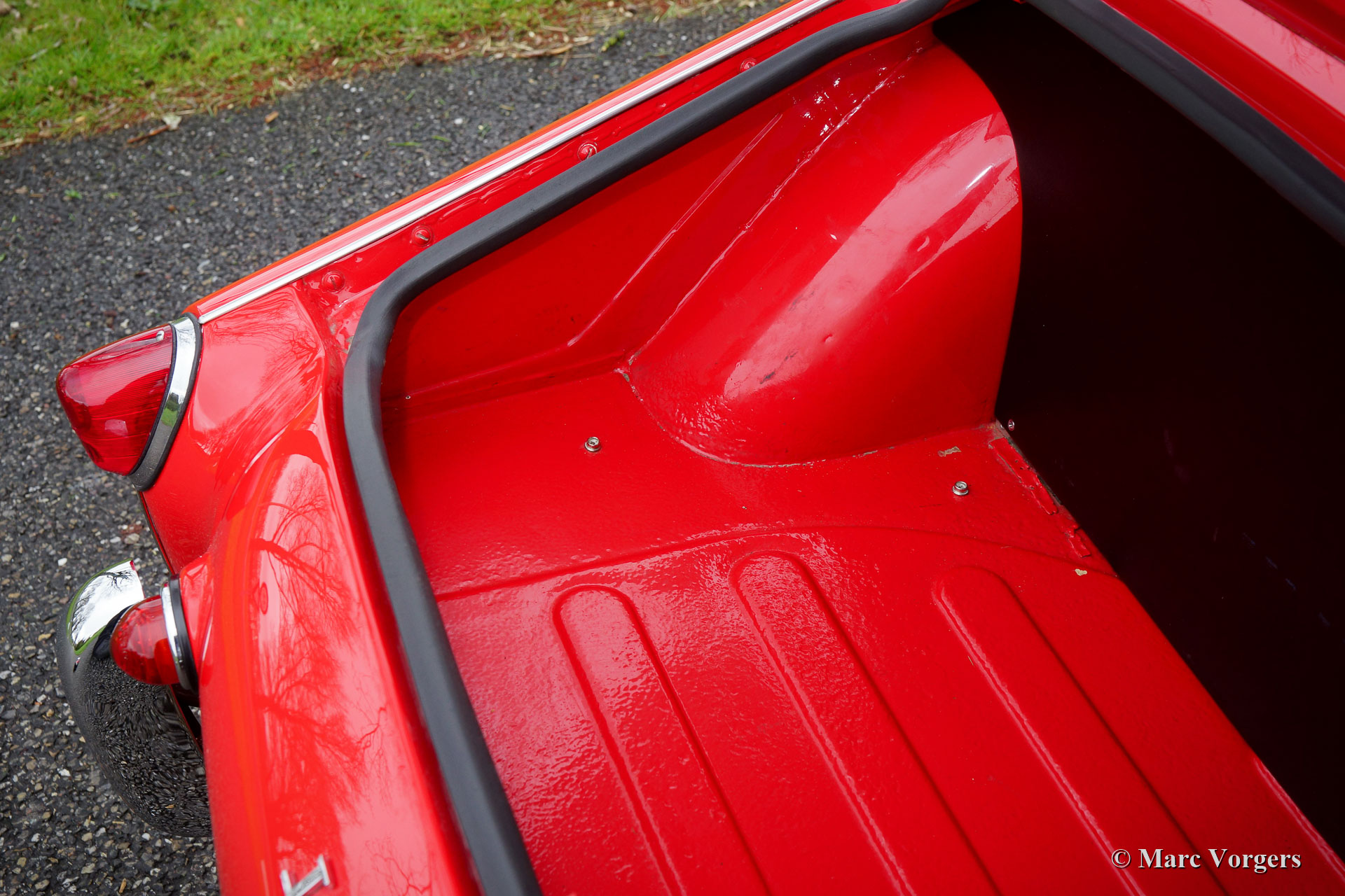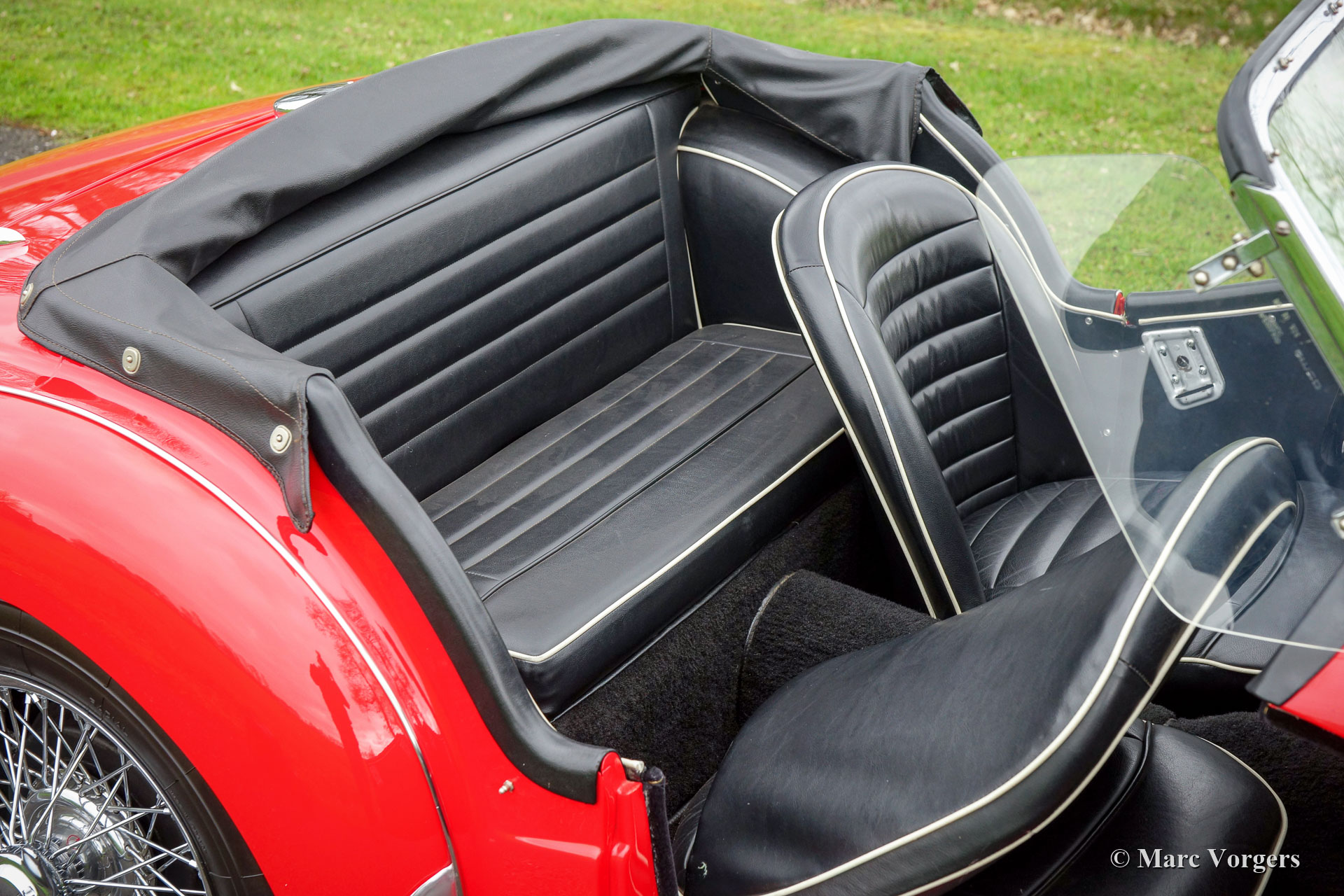 Triumph TR 3A, Jahr 1963. Farbe rot kombiniert mit einem schwarzen Interieur und schwarzem Teppich. Verdeck, Kapuzenbezug, Seitenfenster und Persenning sind alle in schwarz gehalten. Dieser wundervolle Triumph TR 3A wurde in den USA neu verkauft, das Auto wurde im Jahr 1998 in die Niederlande importiert. In den Niederlanden wurde der Triumph im Zeitraum 2000 - 2003 umfassend restauriert. Die Restaurierung war ein detaillierter Job, natürlich wurden der Motor und das Getriebe überholt und wurde der Kabelbaum erneuert. Das Auto ist in einem ausgezeichneten Zustand und das Auto fährt herrlich! Dieser Triumph TR 3A verfügt über verchromte Drahträder mit verchromten Radmuttern und Michelin 165/15 Reifen. Ein sehr begehrtes Exemplar!
