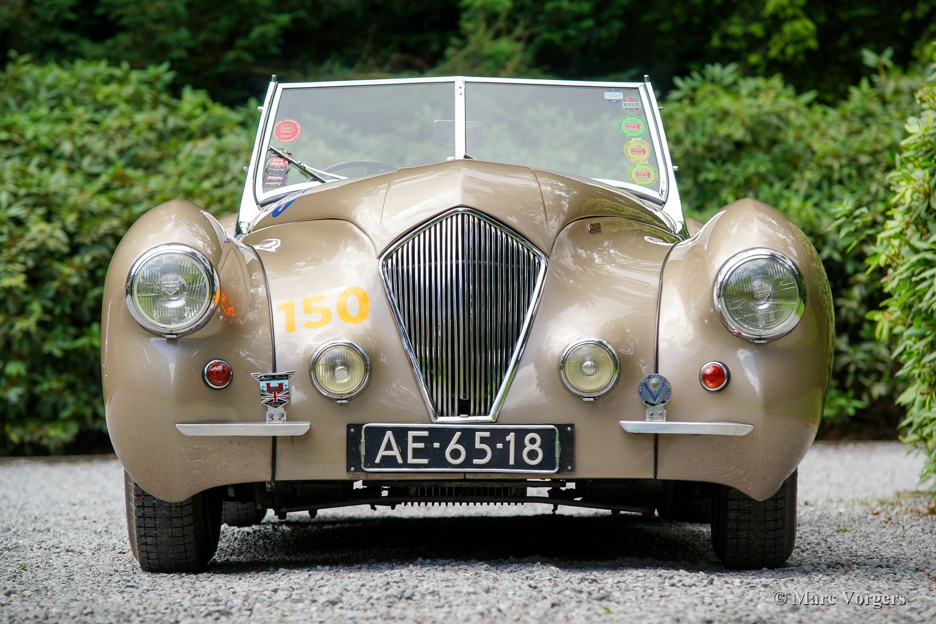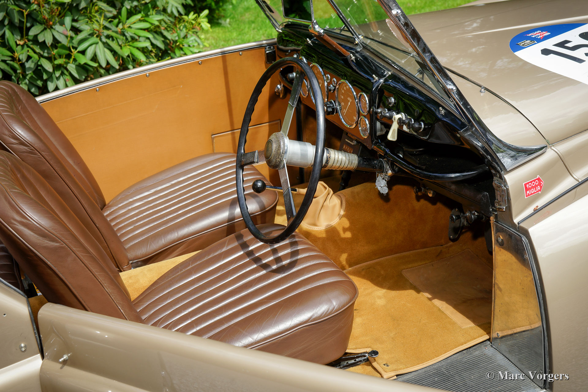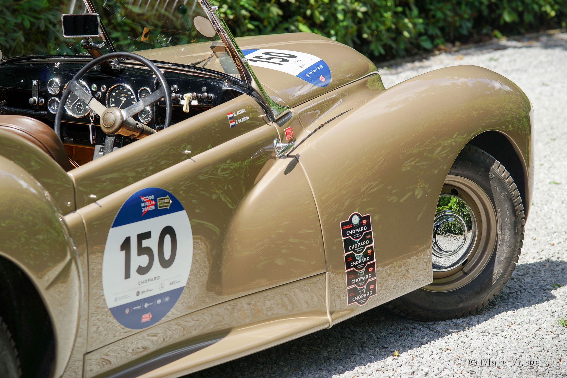 Westland Healey Roadster, Jahr 1947 (Erstzulassung 28. Februar 1947). Farbe Bronze metallic mit einem braunen Leder Interieur. Dies ist ein ganz besonderer und seltener britischer Sportwagen. Nur 64 Exemplare wurden von 1946 bis 1950 gebaut. Diese großartige Westland Healey wurde in Kalifornien, USA, neu verkauft. Im Jahr 1999 wurde das Automobil in die Niederlande importiert. Von diesem Moment an hat das Auto nur einen Besitzer gekannt. Diese Westland Healey ist ein renommierter Teilnehmer in der Mille Miglia. Das Auto hat teilgenommen in diesem berühmten Event in den Jahren 2008, 2009, 2011, 2012, 2014 und 2018. Alle Blei 'Seals', die von Mille Miglia Beamten angewendet wurden, sind noch an der Lenksäule vorhanden. Mille Miglia ‘Genehmigungs‘ Kleber sind auch als ‘stille Zeugen‘ fest an der Windschutzscheibe befestigt.