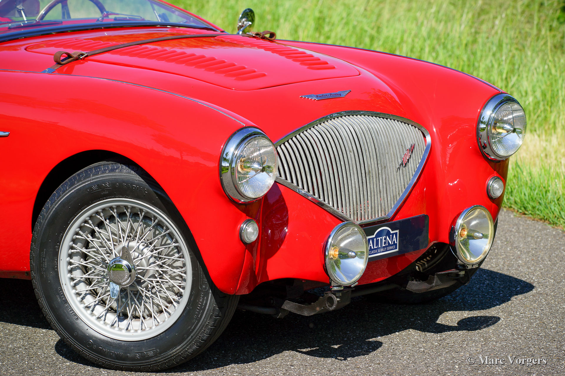 Austin Healey 100/4 BN1, Jahr 1954. Farbe rot kombiniert mit einem roten Lederinterieur, schwarzem Armaturenbrett und rotem Teppich. Seitenfenster mit roten Randen, rotes Verdeck und Persenning. Dies ist ein wunderschöner und früher Austin Healey 100, der erste der legendären "Big Healeys"! Dieser Austin Healey wurde vor einigen Jahrzehnten in Dänemark umfangreich restauriert und überholt. Ein Fotobericht über die Restaurierung und den Wiederaufbau sowie ein Heritage-Zertifikat liegen vor. Das Auto ist in einem sehr guten Zustand, es weist nur leichte Gebrauchsspuren auf. Die Karosserie hat eine sehr schöne Passform der Blechpaneele. Das Auto wurde während der Restaurierung nach ‘Le Mans‘ vorgaben angepasst. Dieser „Big Healey“ verfügt über spezielle Scheinwerfer, eine Kaltluftbox an den Vergasern, einen speziellen Zylinderkopf, eine Motorhaube mit Luftschaufeln, einen Ledergürtel über der Motorhaube, Lucas SLR700-Scheinwerfer, einen Seitenauspuff usw. Das Auto fährt und klingt eindrucksvoll - wie ein richtiger britischer Sportwagen sollte! Diese Austin Healey ist derzeit in den Niederlanden registriert, das Auto kann in jedem Land registriert werden.