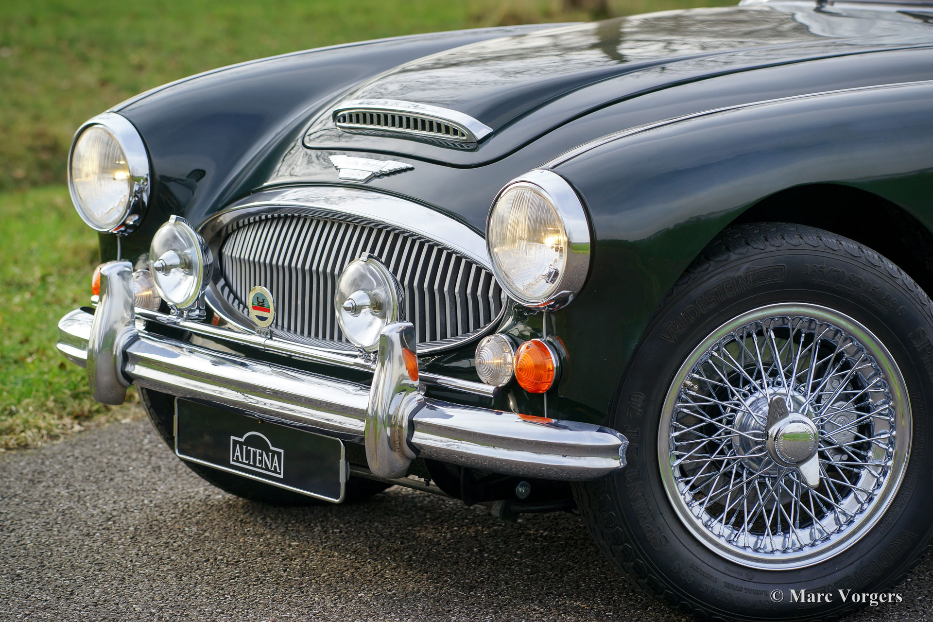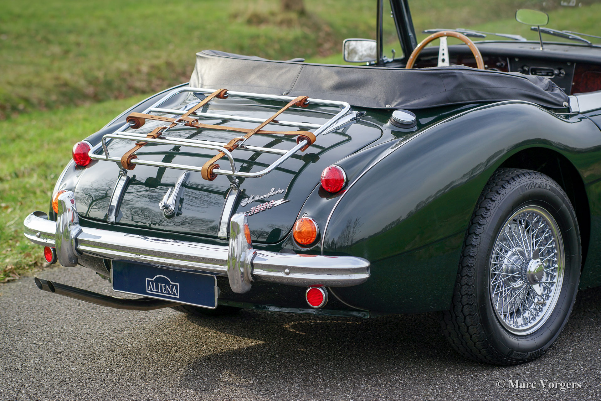 Austin Healey 3000 Mk III Phase 2, Jahr 1966. Farbe British Racing Green mit einer schwarzen Lederausstattung und schwarzem Teppich. Schwarzes Verdeck und Kapuze. Dieser wunderschöne "Big Healey" der letzten Mk III Phase 2 Serie wurde neu in den USA verkauft. Das Auto wurde im Jahr 1995 in die Niederlande importiert. Danach wurde das Auto aufwändig in Top-Zustand wiederhergestellt. Das Auto wurde von Altena Classic Service im Jahr 2002 an den letzten Besitzer verkauft. Seitdem wurde das Auto sehr gut gewartet und gepflegt. Dieser prächtige Austin Healey ist in einem sehr guten Zustand und das Auto fährt perfekt! Das Auto weist eine ganz tolle Farbenkombination auf und der Motorraum sieht makellos aus. Das Auto verfügt über verchromte Draht-Speichen-Räder, verchromte "knock-off" Radmuttern, Vredestein Sprint Classic-Reifen, eine verchromte "badge-bar" mit einem Paar Lucas-Scheinwerfer, eine verchromte Gepäckablage mit Lederriemen und ein Edelstahl-Auspuff. Dieses letzte Austin Healey Modell verfügt über das leicht zu bedienen Cabrio-Verdeck. Dieser schöne "Big Healey" steht bereit für jede Reise und / oder Abenteuer!
