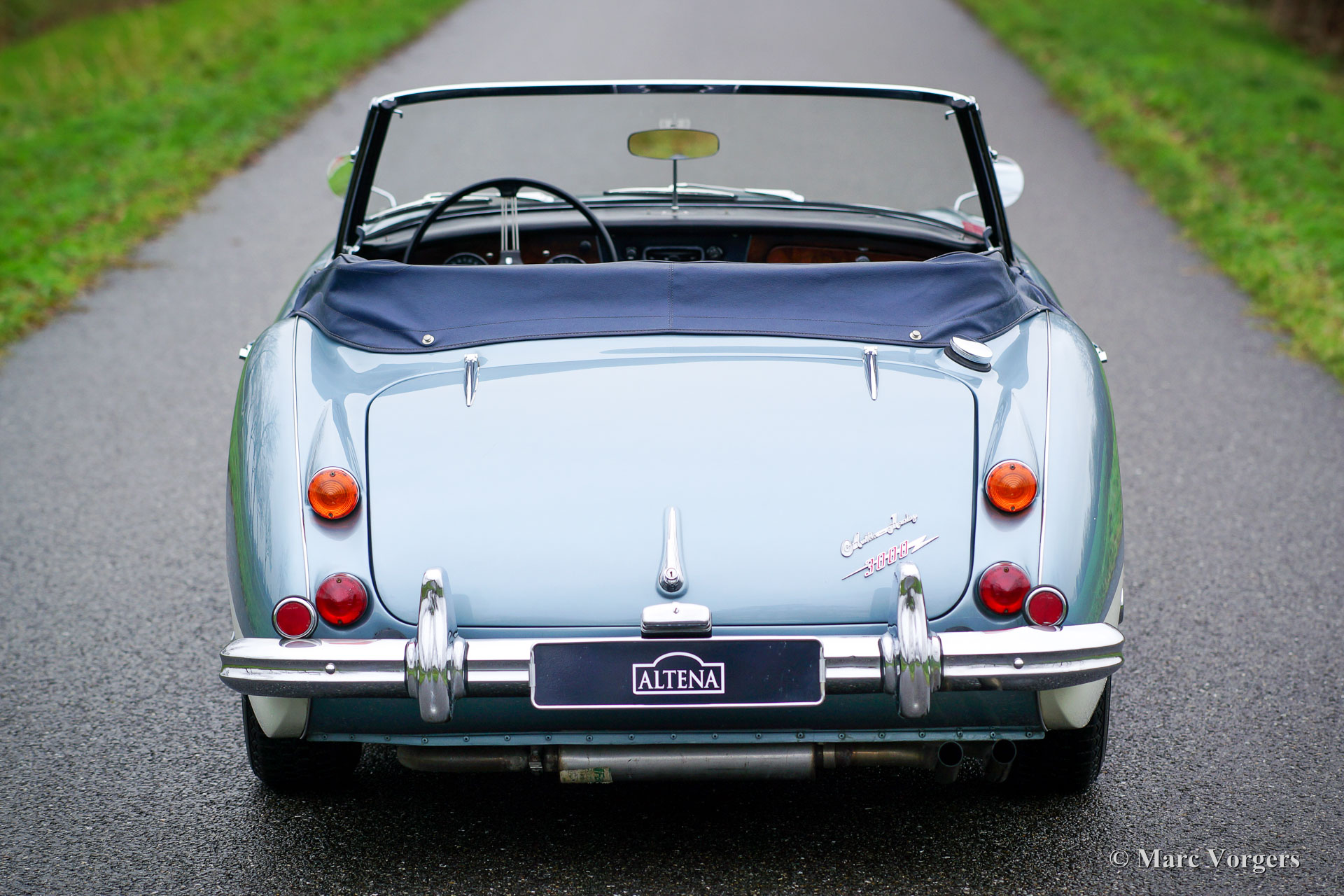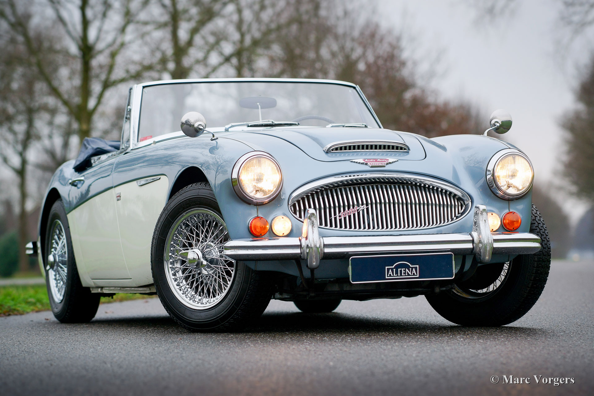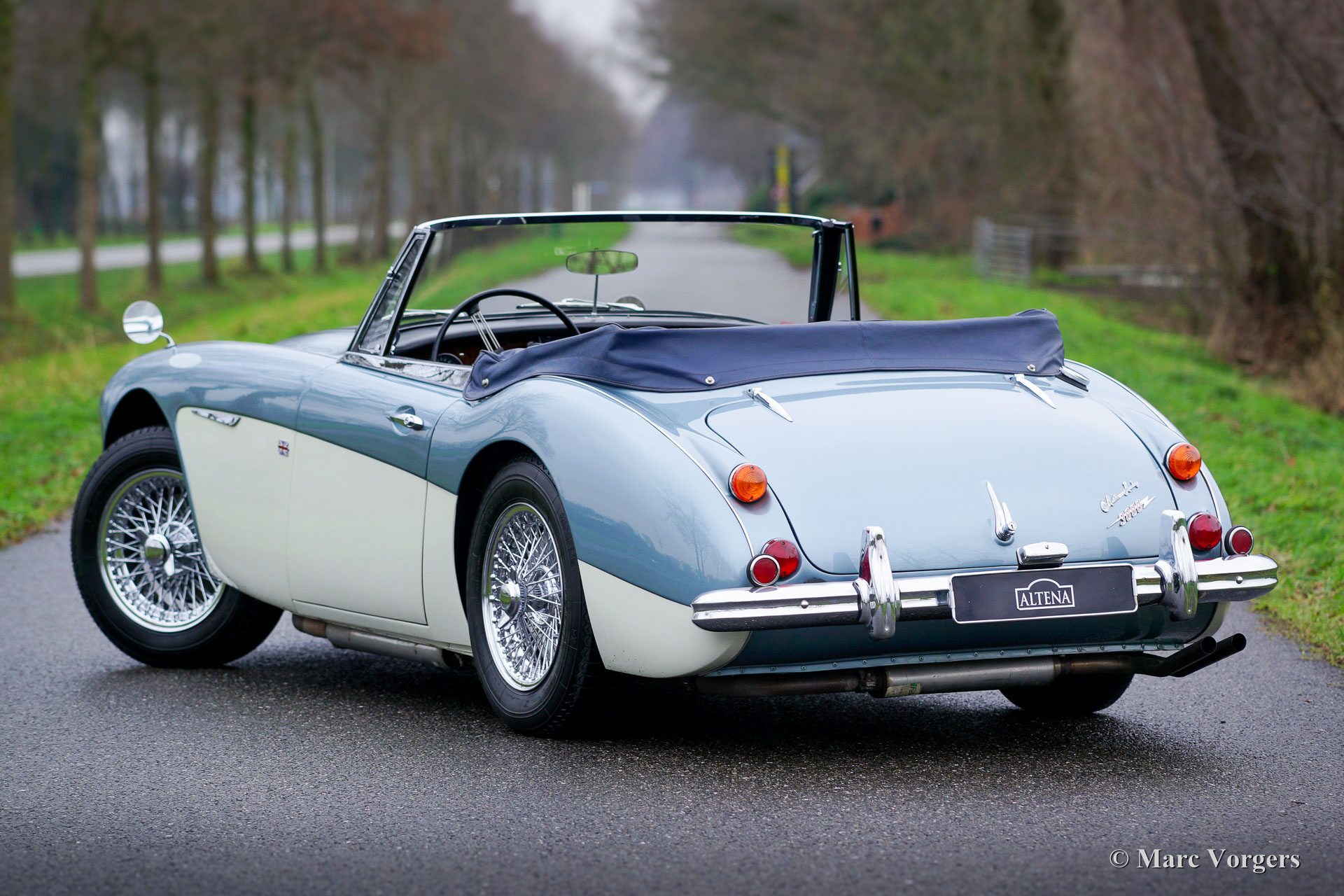Austin Healey 3000 Mk III Phase 2, Jahr 1966. Fahrgestellnummer HBJ8L351XX, Motornummer 29K / RU / H1045XX; "matching numbers". Farbe Ice Blue metallic über cremeweiß kombiniert mit einer dunkelblauen Lederausstattung und dunkelblauem Teppich. Dunkelblaues Vinyl-Verdeck und Kapuze. Dieser großartige "Big Healey" wurde in den USA neu verkauft. Das Auto wurde in der Vergangenheit in den Niederlanden aufwändig restauriert, und das Auto wird seit vielen Jahren von Altena Classic Service gewartet. Dieser Austin Healey aus der letzten und gefragtesten Mk III Phase 2 Serie ist in einem Top Zustand! Das Auto verfügt über Overdrive, Chromspeichenräder und ein originales Radio. Dies ist ein sehr schönes Exemplar in Top-Zustand!