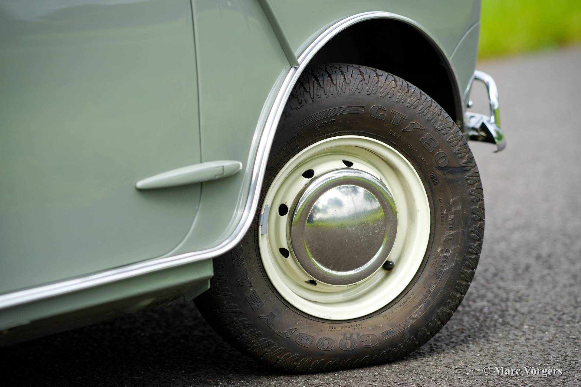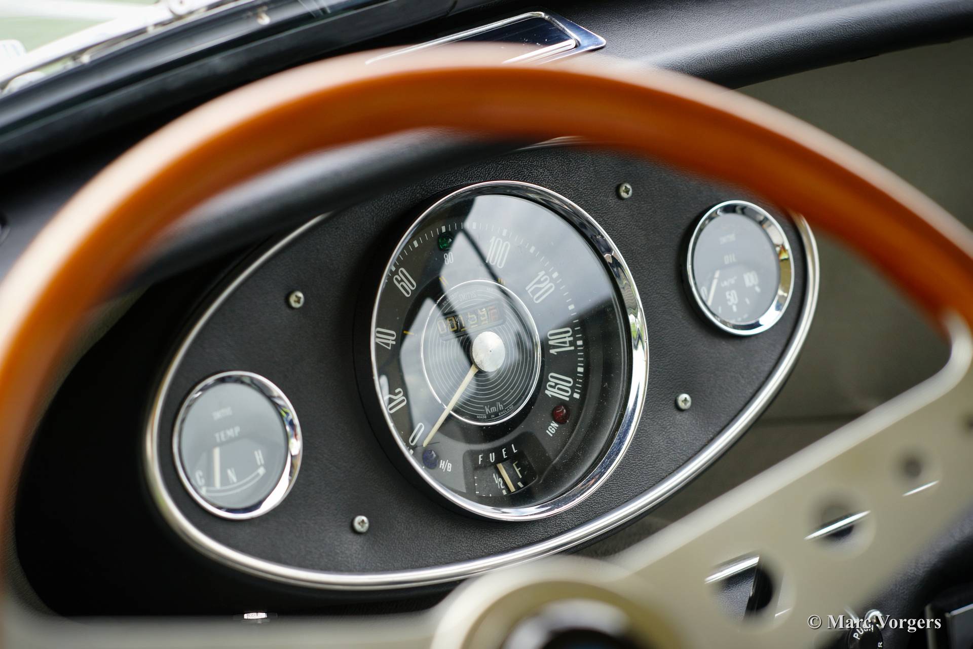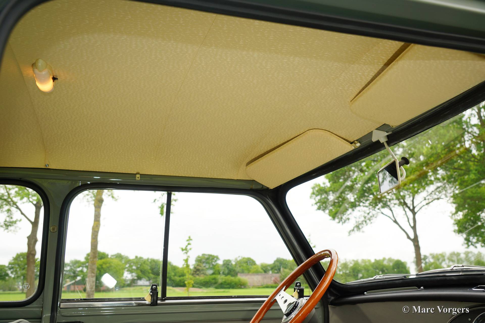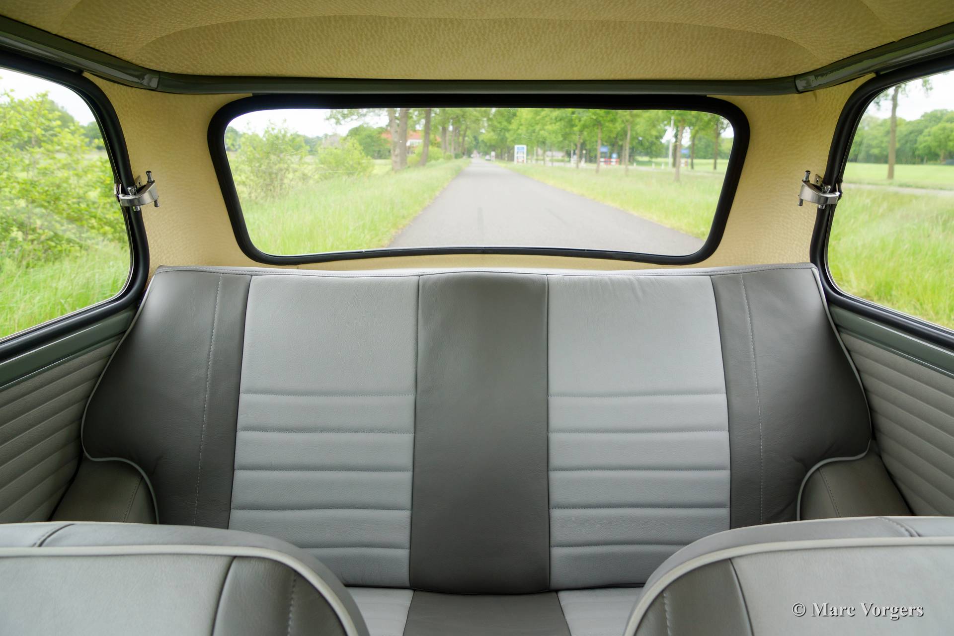 The Morris Mini saw the light of day in the year 1959. The Mini was designed by Sir Alec Issigonis (who also designed the Morris Minor) and is considered to be one of the greatest concepts in motorcar history. The Mini is a front wheel drive car; that was not new those days, but the transverse-engine packaging was. The Mini is a very small car, only 305 cm. long (the VW Beetle is 100 cm. longer!), but the interior offers lots of space, enough for four persons, because of the clever concept. The Mini is equipped with a unique "hydrolastic" suspension and the Mini's wheels are located at the outer corners of the car giving the Mini tremendous road-holding; like a go-cart.
