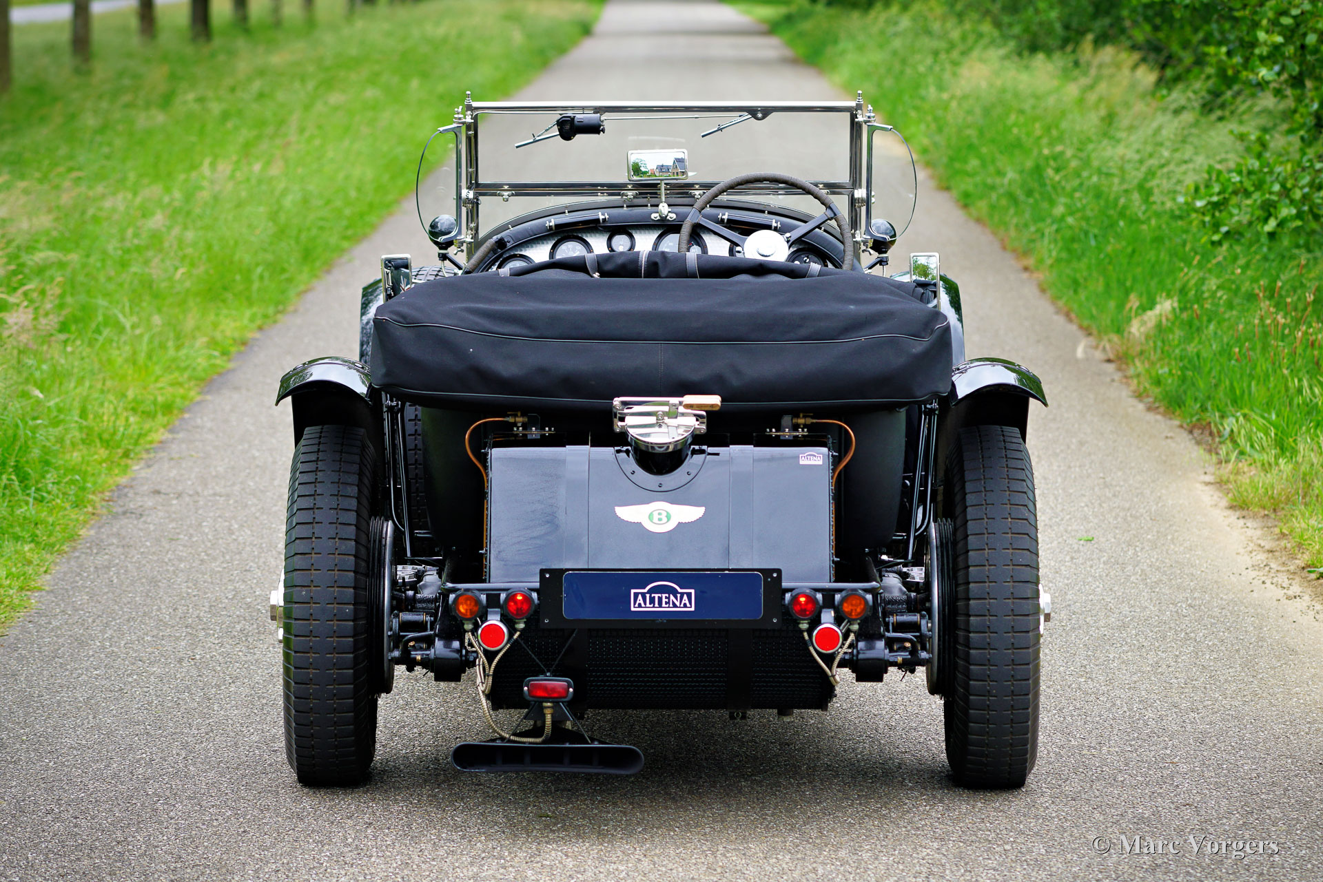 The Bentley 3 Litre was W.O. Bentley’s first design. The car was presented in 1919 but the first cars were sold in 1921. The four cylinder cars of rugged construction where in a class of their own for they combined the size and comfort of the big tourers and saloons with the road holding, and speed of the smaller sports- and racing cars. The Bentley was a true owner-driver car for the sporting motorist and connoisseur. The Bentley car could be had in three different types which were designated with three different radiator badges*. Red badge: short chassis speed model, Blue badge: the early short and then long chassis type for bespoke bodywork, Green badge: very rare and used for about eighteen 100 mph. These Green badge car won at Le Mans in 1924 and 1927 (Old Number Seven.) The 3-Litre was built from 1919 until 1929.