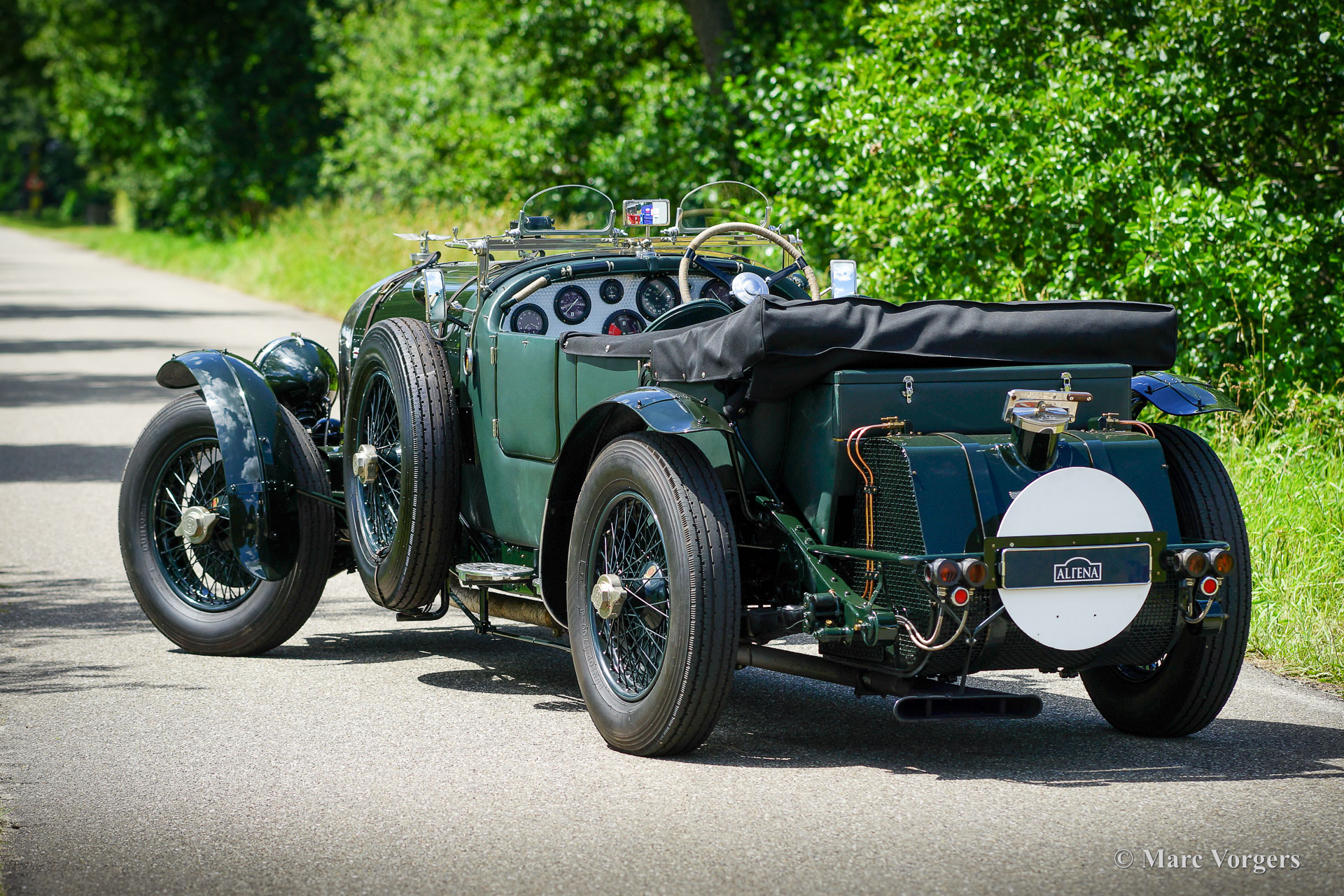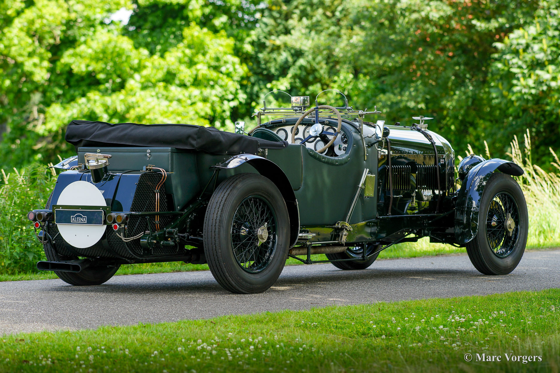 The Bentley 3 Litre was W.O. Bentley’s first design. The car was presented in 1919 but the first cars were sold in 1921. The four cylinder cars of rugged construction where in a class of their own for they combined the size and comfort of the big tourers and saloons with the road holding, and speed of the smaller sports- and racing cars. The Bentley was a true owner-driver car for the sporting motorist and connoisseur. The Bentley car could be had in three different types which were designated with three different radiator badges*. Red badge: short chassis speed model, Blue badge: the early short and then long chassis type for bespoke bodywork, Green badge: very rare and used for about eighteen 100 mph. These Green badge car won at Le Mans in 1924 and 1927 (Old Number Seven.) The 3-Litre was built from 1919 until 1929.
