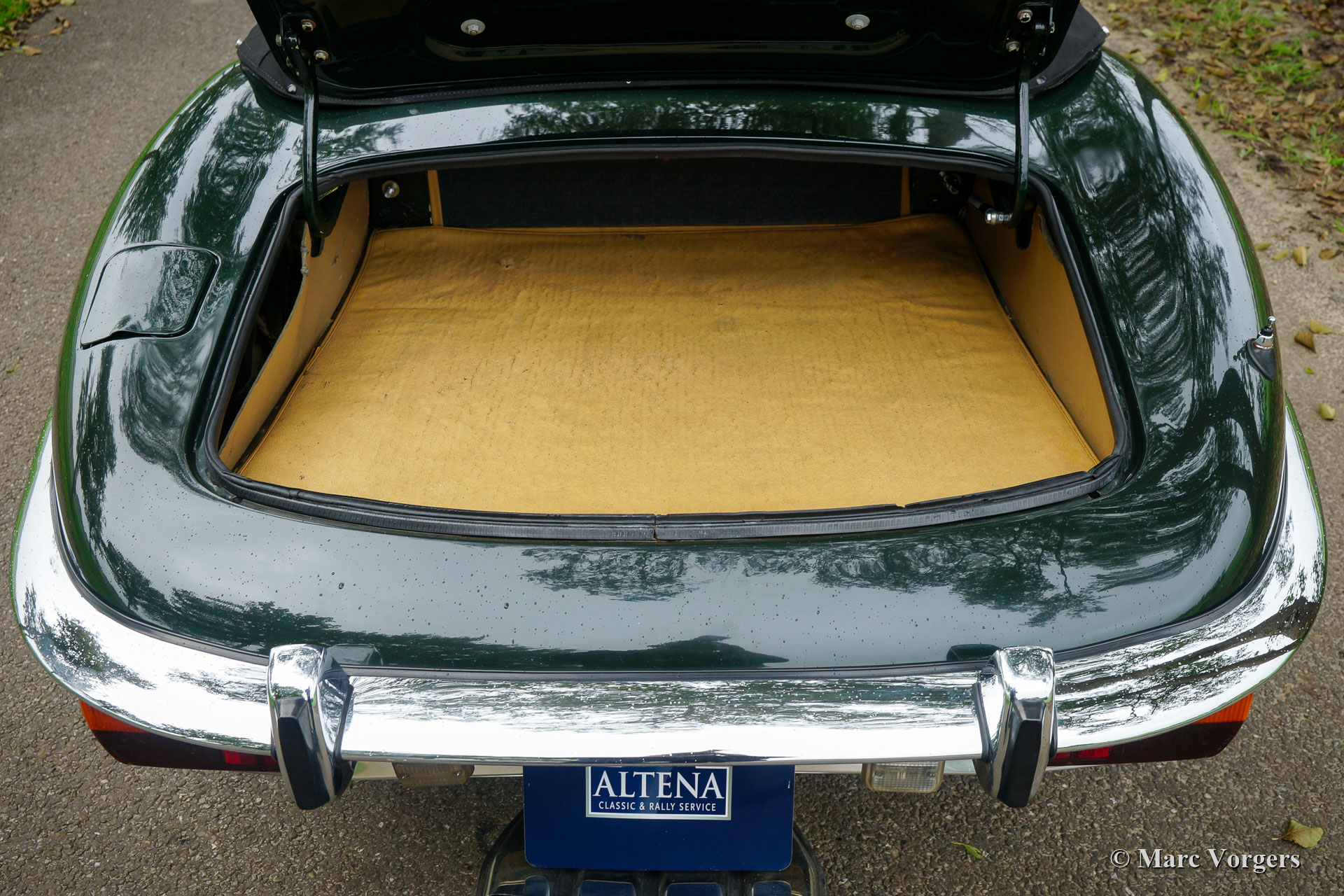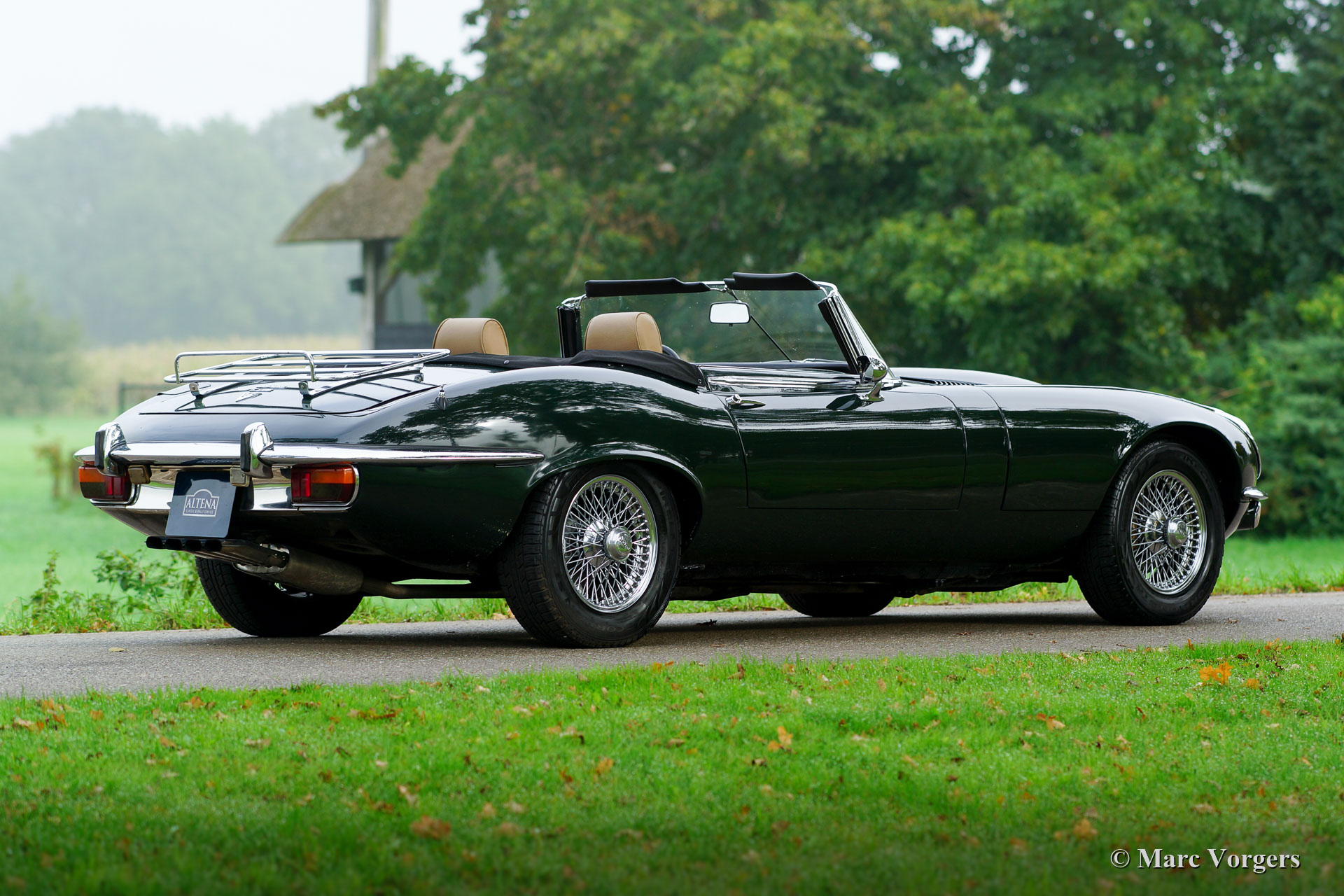 Jaguar E-Type V12 Serie 3 Cabrio, Jahr 1973. Farbe British Racing Green kombiniert mit einem beigen Lederinterieur und beigem Teppich. Schwarzes Mohair-Verdeck und Verdeck Abdeckung. Dieses großartige Jaguar E-Type V12 Cabrio wurde in den Vereinigten Staaten von Amerika neu verkauft. Im Jahr 1994 wurde das Auto in die Niederlande importiert, wo eine professionelle Totalrestaurierung begann. 1998 wurde die erstklassige Restaurierung abgeschlossen; Alle Rechnungen und eine Restaurierungsbeschreibung sind vorhanden. Das Automobil wurde in den letzten zwanzig Jahren von einem Eigentümer geschätzt. Der Jaguar wurde immer perfekt gewartet und gepflegt. Der Jaguar ist in einem sehr guten Zustand und das Auto fährt und klingt perfekt! Die meisten E-Type-V12-Fahrzeuge der Serie 3 sind mit einem automatischen 3-Gang-Getriebe ausgestattet. In diesem Beispiel ist das wünschenswerte 4-Gang-Schaltgetriebe enthalten! Darüber hinaus ist das Auto mit einer verchromten Gepäckablage und verchromten Speichenrädern ausgestattet, die mit 205/70/15 Pirelli-Reifen bestückt sind. Das Auto wird mit einer Verlaufs- / Wiederherstellungsdatei und dem Original-Betriebs-, Wartungs- und Servicehandbuch geliefert. Dies ist ein sehr beeindruckender Jaguar E-Type V12 in einem sehr guten und schönen Zustand!