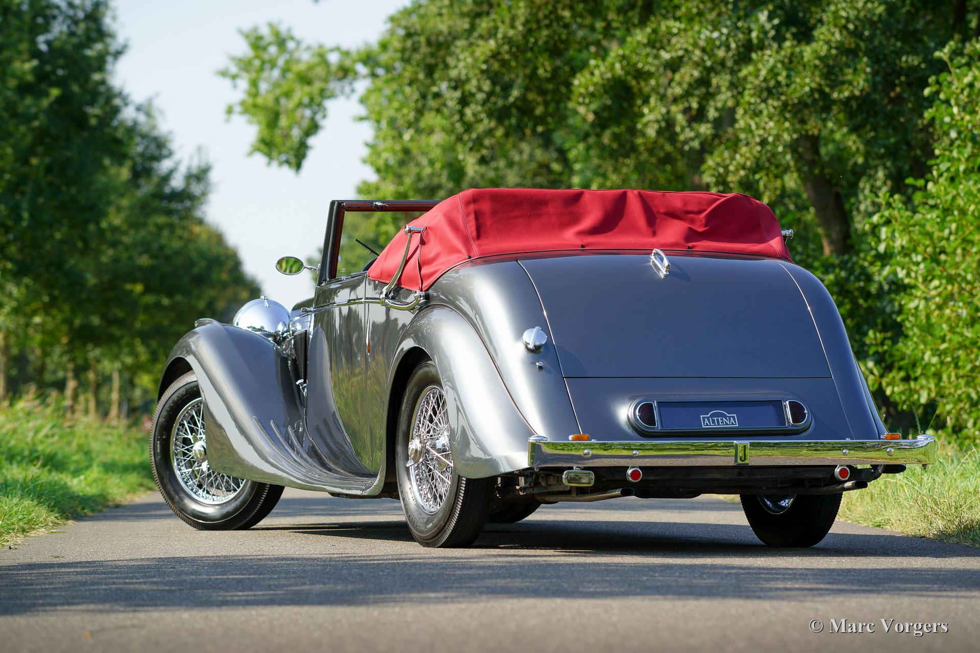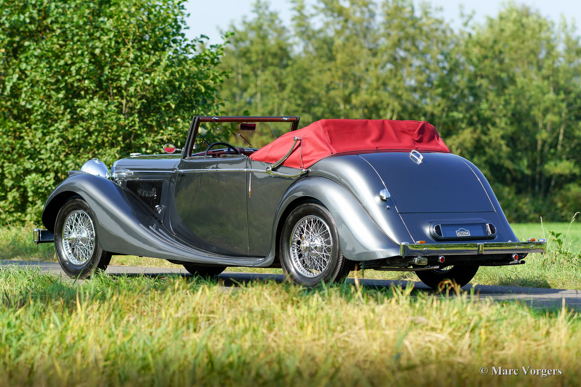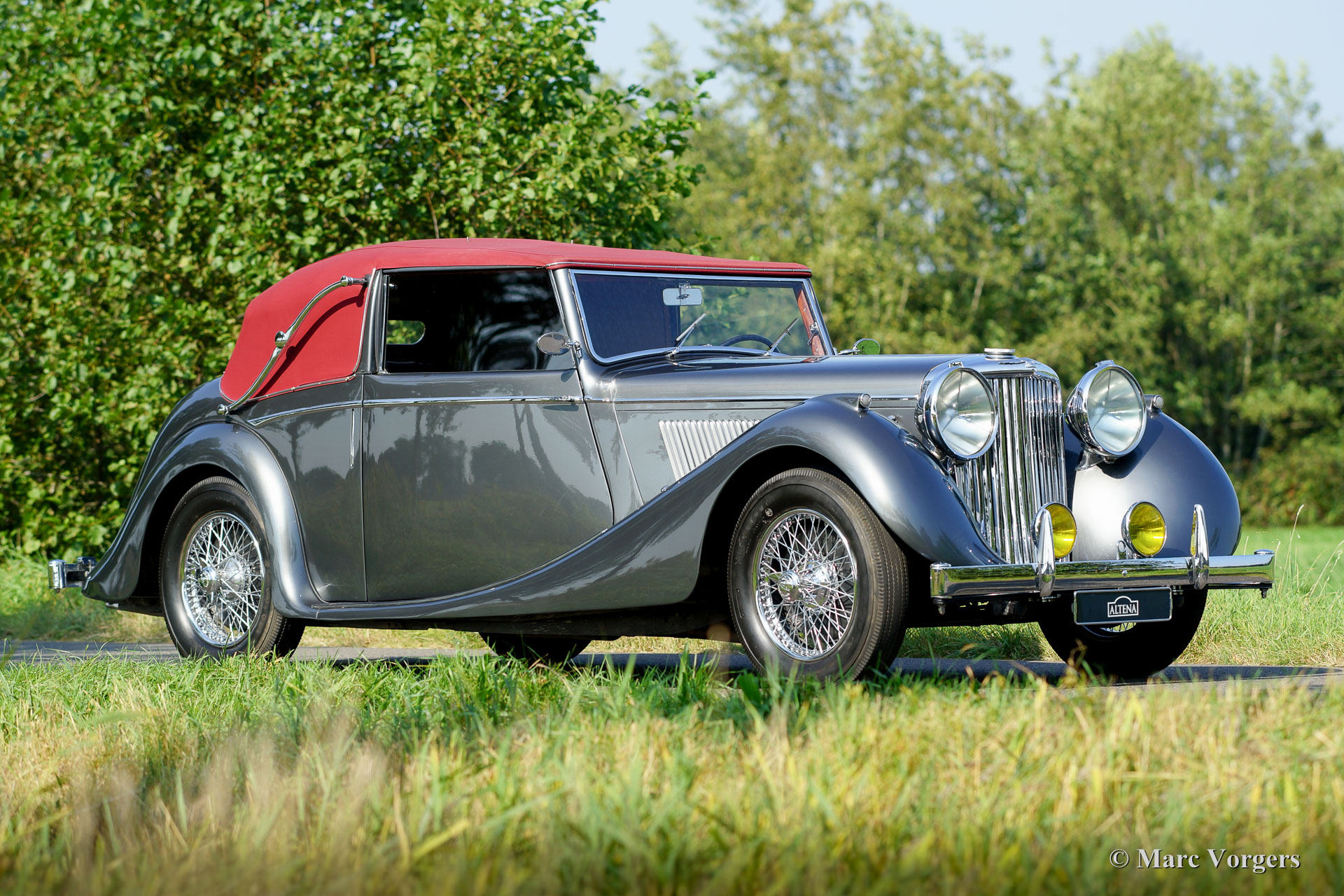 Jaguar Mk IV DHC, Jahr 1948. Fahrgestellnummer 6371XX, Körpernummer C116X, Motornummer SL311X. Farbe ‘gun-metal‘ grau metallic mit einem roten Leder-Interieur und roten Teppich. Rote Haube und Verdeck Abdeckung. Dieser wunderschöne Jaguar Mk IV ‘Drop Head Coupé‘ wurde einige Jahre her ausgiebig und sehr schön wiederhergestellt; das Auto ist in einem hervorragenden Top-Zustand! Seit der Vollendung der Restauration hat das Auto nur 8352 Meilen gefahren. Der Jaguar ist ausgestattet mit schönen Chrom-Speichen Rädern, die die herrlichen Farben der Karosserie und dem Innenraum ergänzen. Das Original-Werkzeug ist vorhanden, und ein Paar Nebelscheinwerfern wurden an der vorderen Stoßstange hinzugefügt. Die Haube ist eine so genannte ‘three position hood‘, der in drei Positionen verwendet werden kann: vollständig offen, halb offen und geschlossen. Dies ist ein ganz besonderer Jaguar Mk IV in einem Top-Zustand!