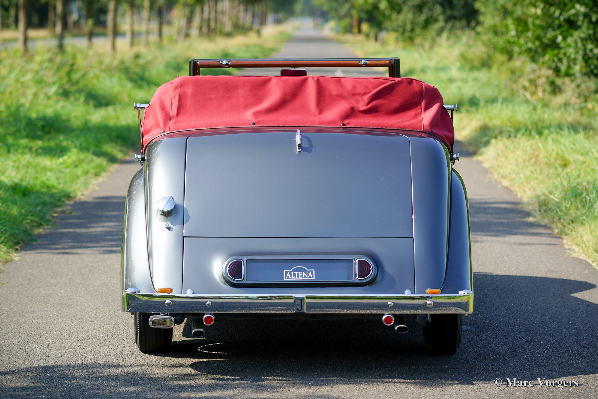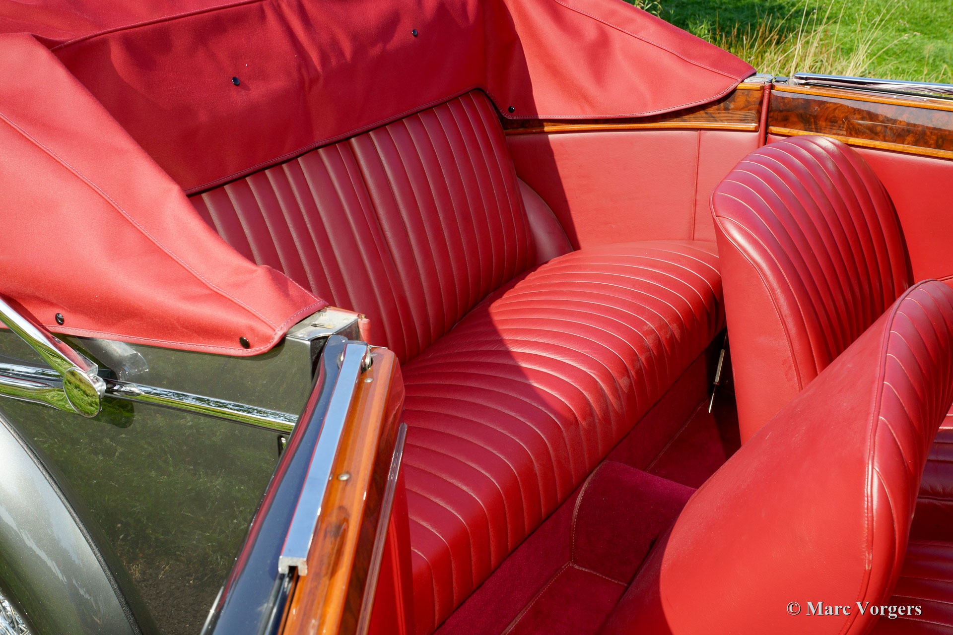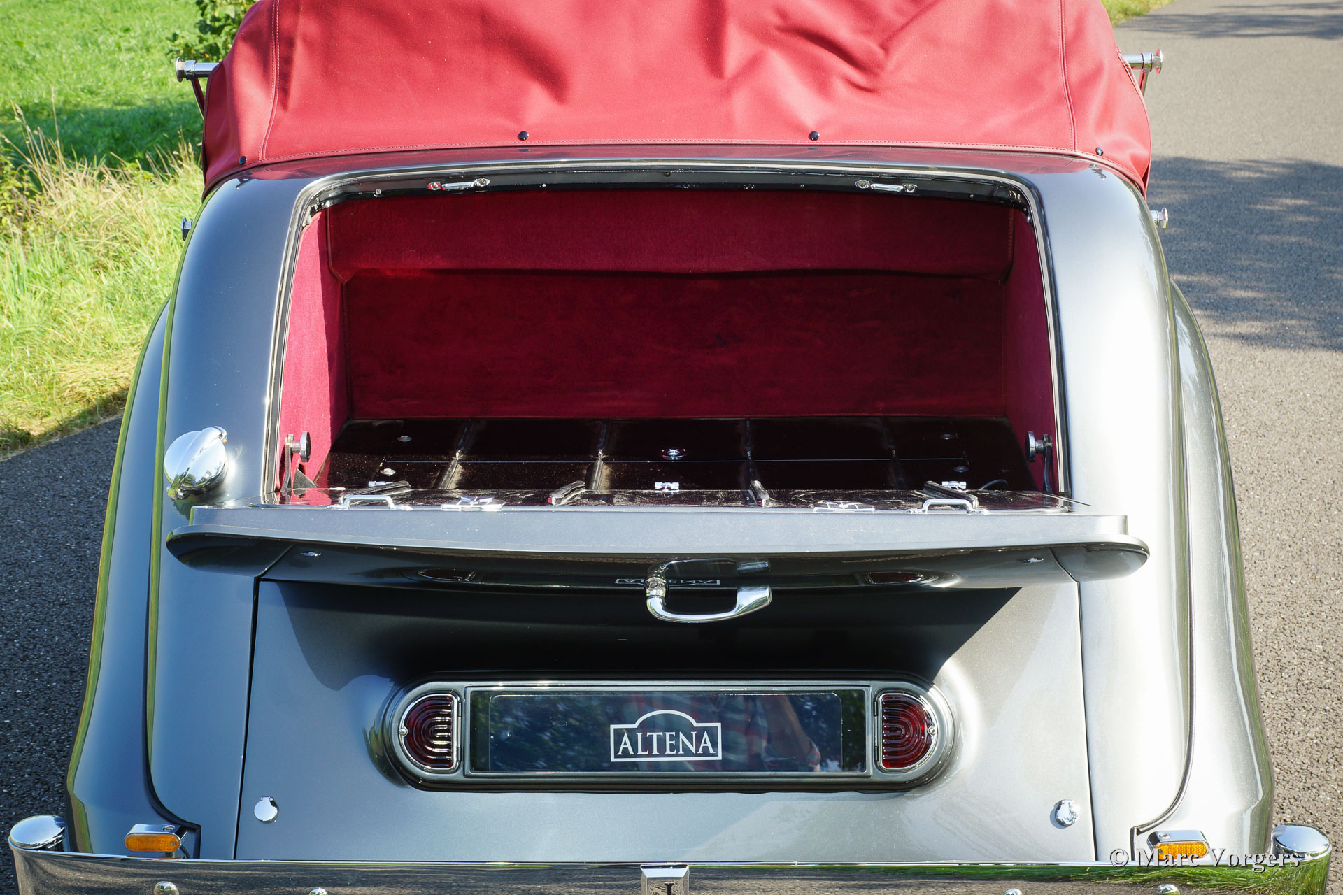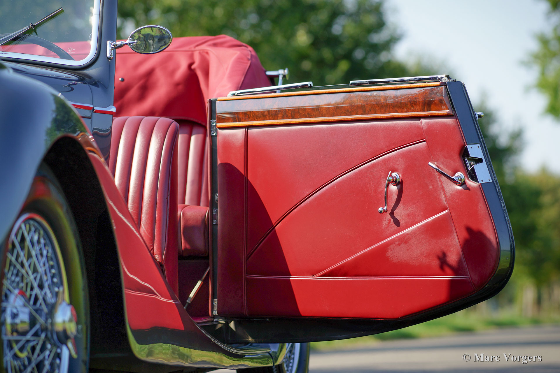 Jaguar Mk IV DHC, Jahr 1948. Fahrgestellnummer 6371XX, Körpernummer C116X, Motornummer SL311X. Farbe ‘gun-metal‘ grau metallic mit einem roten Leder-Interieur und roten Teppich. Rote Haube und Verdeck Abdeckung. Dieser wunderschöne Jaguar Mk IV ‘Drop Head Coupé‘ wurde einige Jahre her ausgiebig und sehr schön wiederhergestellt; das Auto ist in einem hervorragenden Top-Zustand! Seit der Vollendung der Restauration hat das Auto nur 8352 Meilen gefahren. Der Jaguar ist ausgestattet mit schönen Chrom-Speichen Rädern, die die herrlichen Farben der Karosserie und dem Innenraum ergänzen. Das Original-Werkzeug ist vorhanden, und ein Paar Nebelscheinwerfern wurden an der vorderen Stoßstange hinzugefügt. Die Haube ist eine so genannte ‘three position hood‘, der in drei Positionen verwendet werden kann: vollständig offen, halb offen und geschlossen. Dies ist ein ganz besonderer Jaguar Mk IV in einem Top-Zustand!