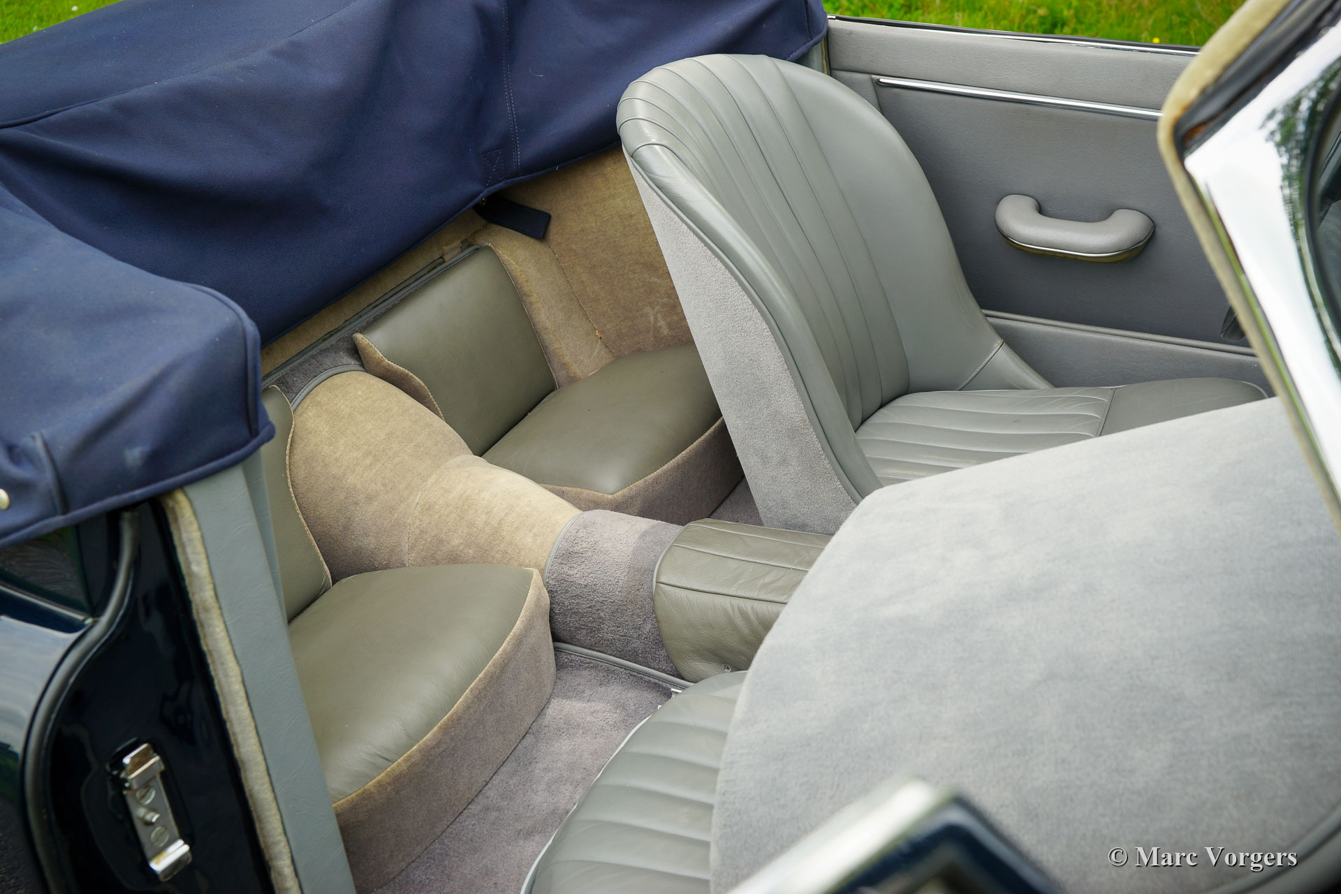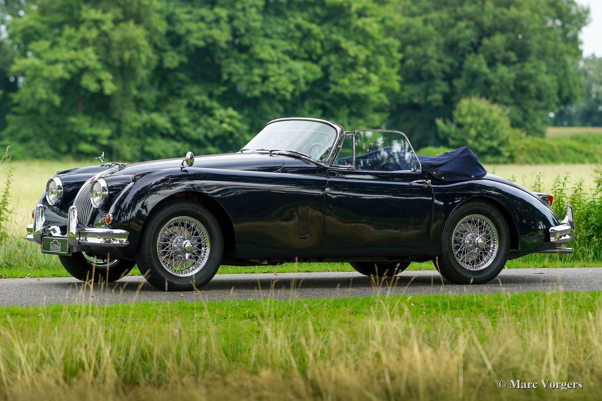 Jaguar XK 150 3,4 Liter DHC, Jahr 1958. Farbe Cotswold Blue kombiniert mit einer grauen Lederausstattung und grauem Teppich. Dunkelblaues Mohair Verdeck und ein dunkelblauer Verdeck Bezug. Dieses wunderschöne Jaguar XK 150 Drop Head Coupé wurde in den USA neu verkauft, das Auto wurde im Jahr 2002 in die Niederlande importiert. Nach seiner Ankunft wurde das Auto umfassend „body off“ bis zur Perfektion restauriert. Alles wurde restauriert, überholt und/oder erneuert. Der Jaguar ist immer noch in einem ausgezeichneten Zustand! Die Karosserie zeigt makellosen Lack und Chrom, die Lederausstattung, der Teppich und das Mohair Verdeck zeigen nur geringste Gebrauchsspuren. Dieser Jaguar XK 150 DHC verfügt über den fantastischen 210 PS starken Sechszylinder-XK-Motor, gepaart mit einem manuell bedienbaren Vierganggetriebe und Overdrive. Der Jaguar XK 150 ist eines der stilvollsten britischen Luxus-Sportcabrios der 1950er Jahre. Die kurvige Karosserie zeigt wundervolle Chromdetails, die durch die schöne dunkelblaue Lackierung hervorgehoben werden, und das Interieur ist mit einem luxuriösen Nussbaum-Armaturenbrett ausgestattet. Dieser exklusive Jaguar XK 150 3,4 Liter DHC fährt und handhabt sich perfekt, ein sehr begehrenswertes Exemplar in Top-Zustand.