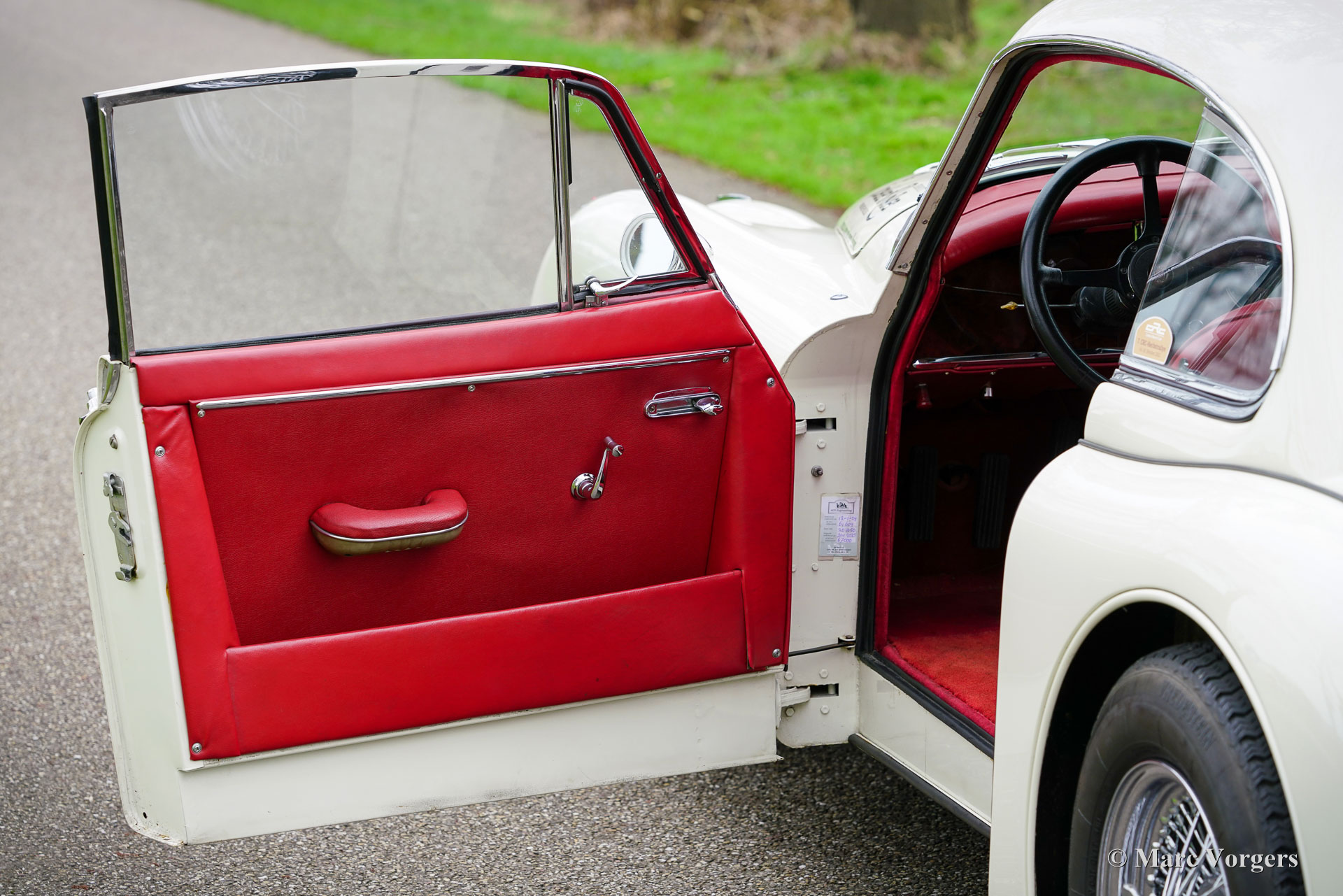 Jaguar XK 150 3,8 Liter FHC, Jahr 1960. Farbe Crème weiß (Old English White) kombiniert mit einem roten Innenraum, ausgestattet mit roten Rallye-Ledersitzen. Dieses Jaguar XK 150 FHC (Fixed Head Coupé) verfügt über den leistungsstarken 3,8-Liter-XK-Motor. Dieser gewaltige Jaguar wurde von Altena Classic und Rally Service im Auftrag des jetzigen Besitzers für die Rallye vorbereitet. Der Jaguar ist in einem sehr guten Zustand und das Auto lässt sich perfekt fahren!