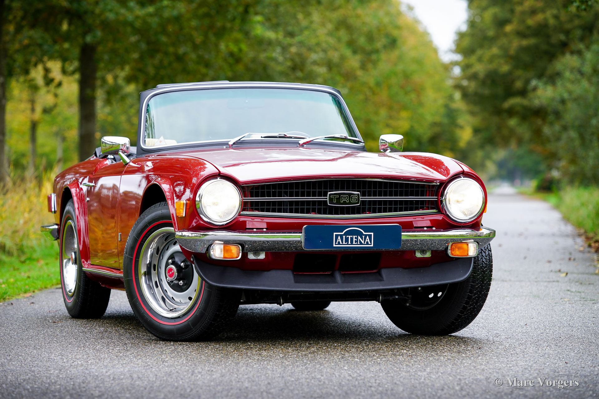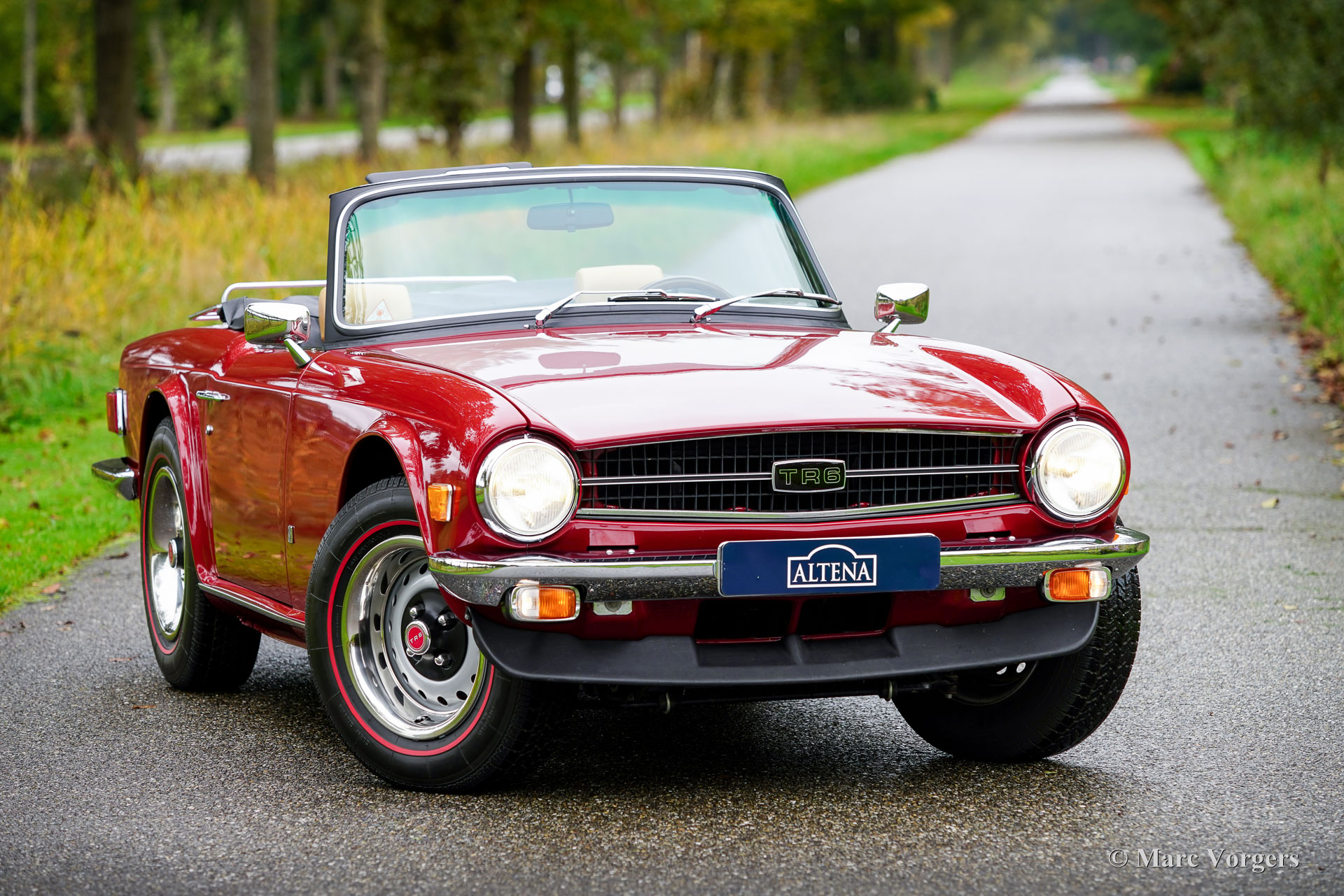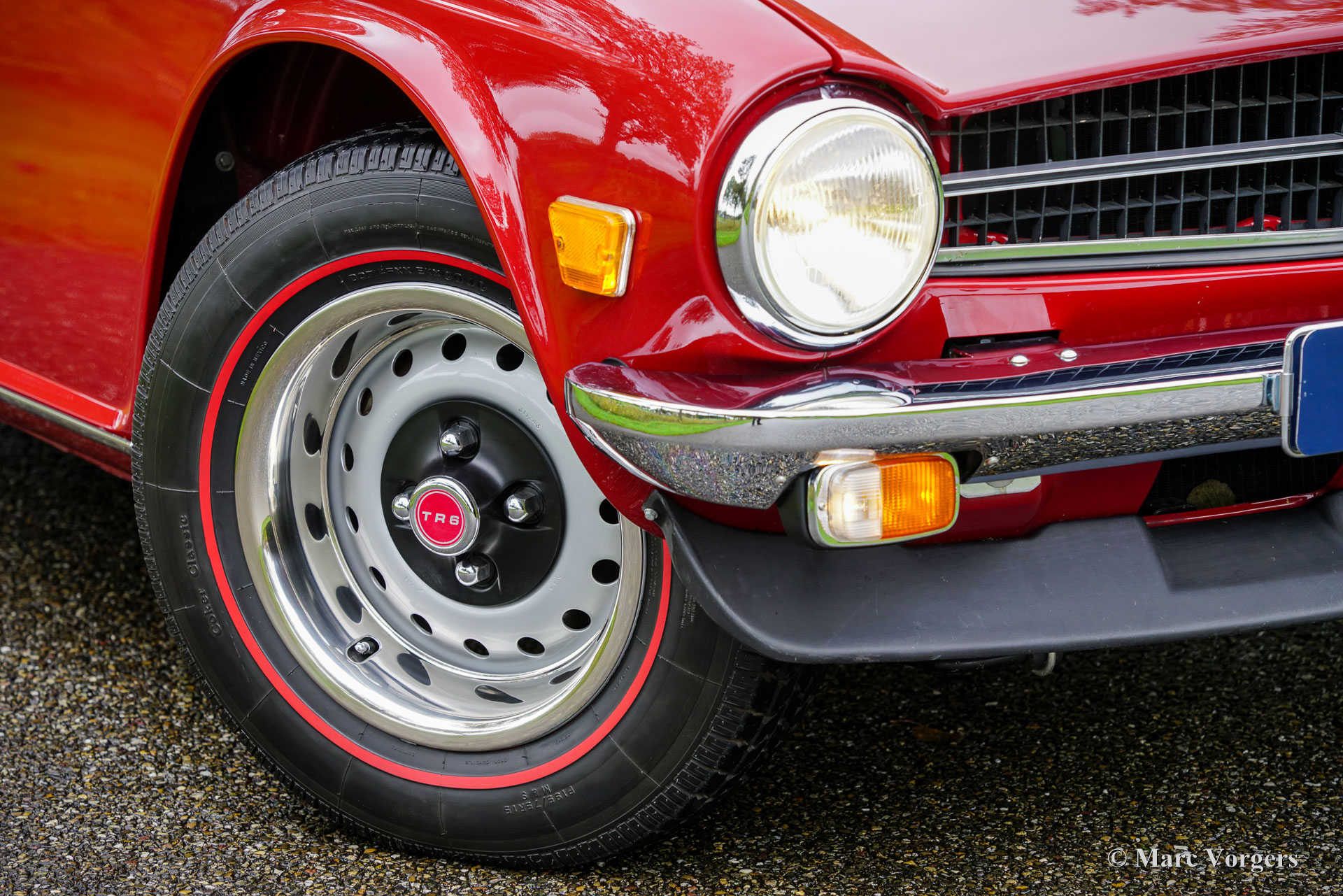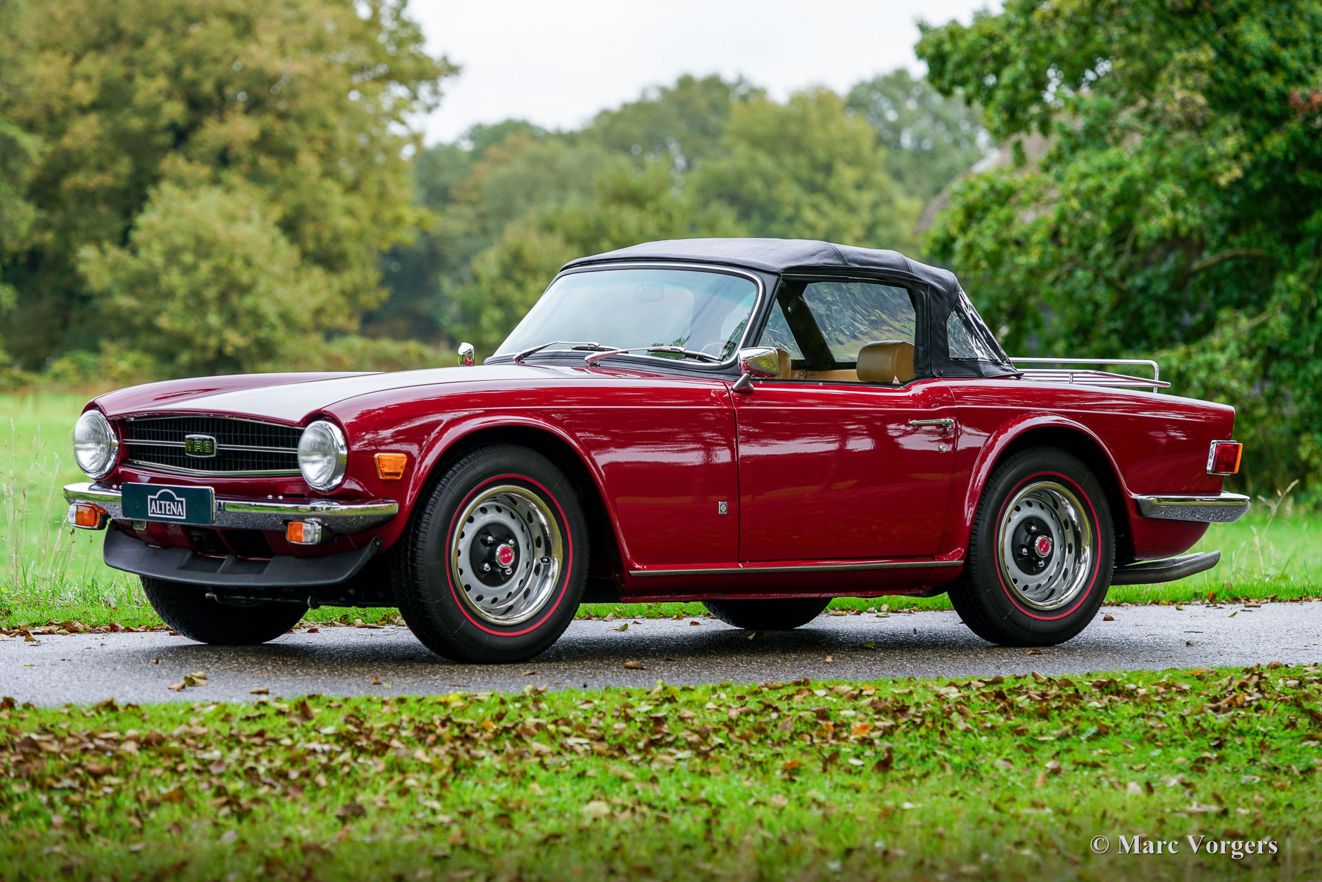 Triumph TR6, Baujahr (November) 1974 (Erstzulassung 1975). ‚Matching numbers‘, ein Heritage-Dokument liegt zur Bestätigung vor. Karosserie in der wunderschönen Farbe Karminrot, kombiniert mit beiger (tan) Kunstlederausstattung und hellbeigem (Magnolia) Teppich. Dieser feine TR6 ist an seiner höheren Frontstoßstange mit den darunter angebrachten Blinkern sofort als Auto des Modelljahres 1975 zu erkennen. Die zweifarbigen orange-weißen Blinker Gläser sind spezifisch für dieses Modelljahr. Dieser TR6 wurde neu in Halifax, Kanada, verkauft. Im Zeitraum 2008 – 2012 wurde das Auto in Kanada restauriert, Rechnungen in Höhe von bis zu 25.000 € sind in der Verlaufsdatei vorhanden. Im Jahr 2020 wurde das Auto in die Niederlande verschifft, wo es 2023 für den Straßenverkehr zugelassen wurde. Der niederländische Besitzer perfektionierte das Auto bis ins kleinste Detail, und in unserer Werkstatt wurden die Hinterachsen, die Vergaser und die Kupplung überholt bzw. erneuert. Dieser wundervolle Triumph TR6 ist in ausgezeichnetem Zustand (sieht aus wie neu!) und ist absolut auf dem neuesten Stand. Dieser TR6 präsentiert sich in einer wunderschönen Farbkombination. Die karminrote Karosseriefarbe, die hellbraunen Sitze und der Magnolia-Teppich harmonieren wunderbar mit dem fantastischen Armaturenbrett aus hochglänzendem Walnussholz! Der Reihensechszylindermotor atmet noch immer durch die originalen Stromberg-Vergaser, das originale Luftfiltergehäuse und die originale (natürlich erneuerte) Stahlauspuffanlage; der Auspuffsound dieses Autos ist absolut zeitgemäß! Dieser TR6 verfügt über eine Kipphebelabdeckung aus Aluminium, ein Sportlenkrad mit Holzkranz, einen Gepäckträger aus Edelstahl, Scheibenwischer aus Edelstahl und ein Paar türmontierte Chrom Rückspiegel. Dieser hochwertige Triumph TR6 ist bereit, in vollen Zügen genossen zu werden!