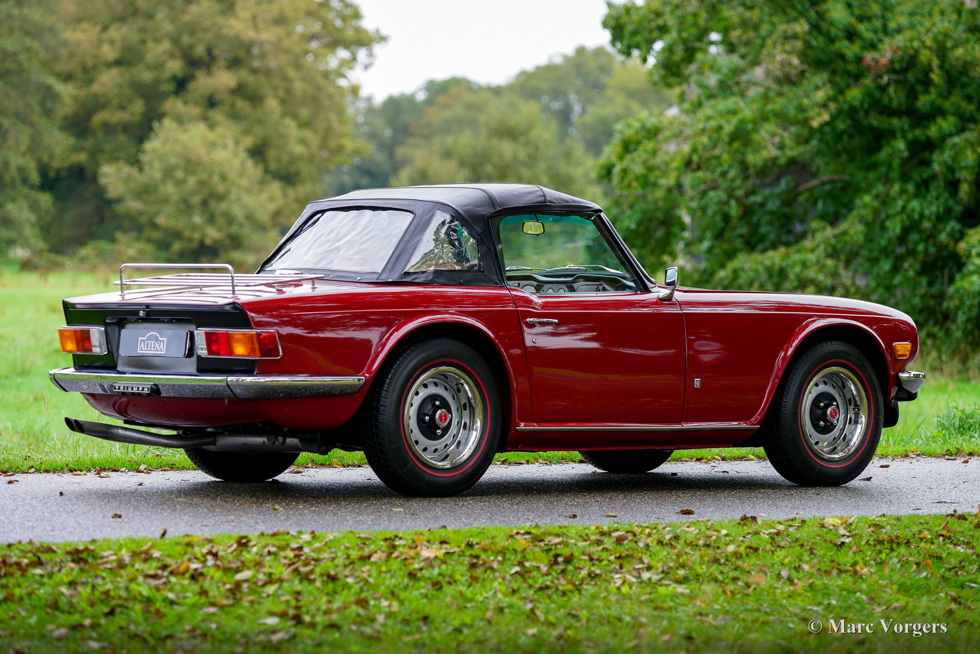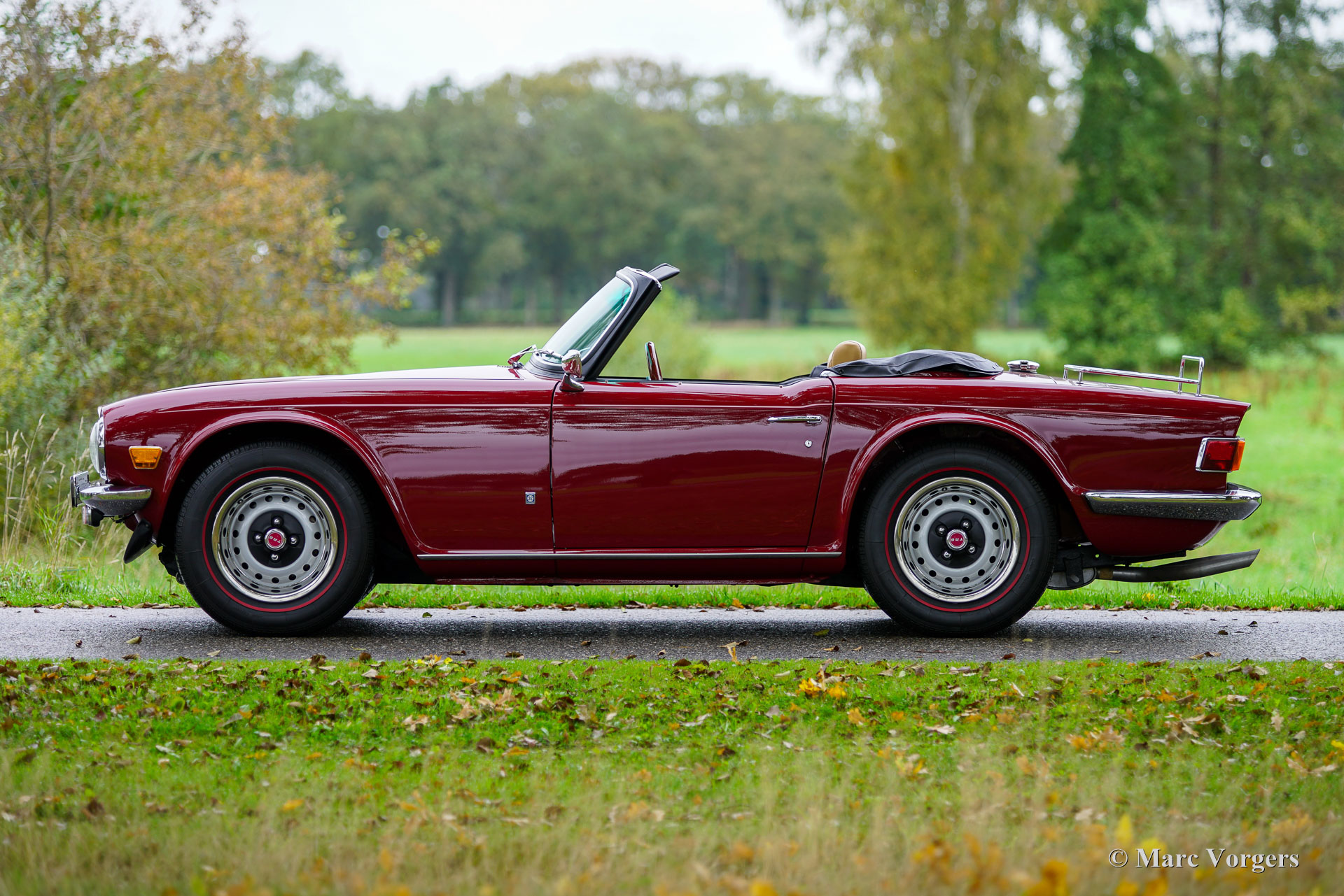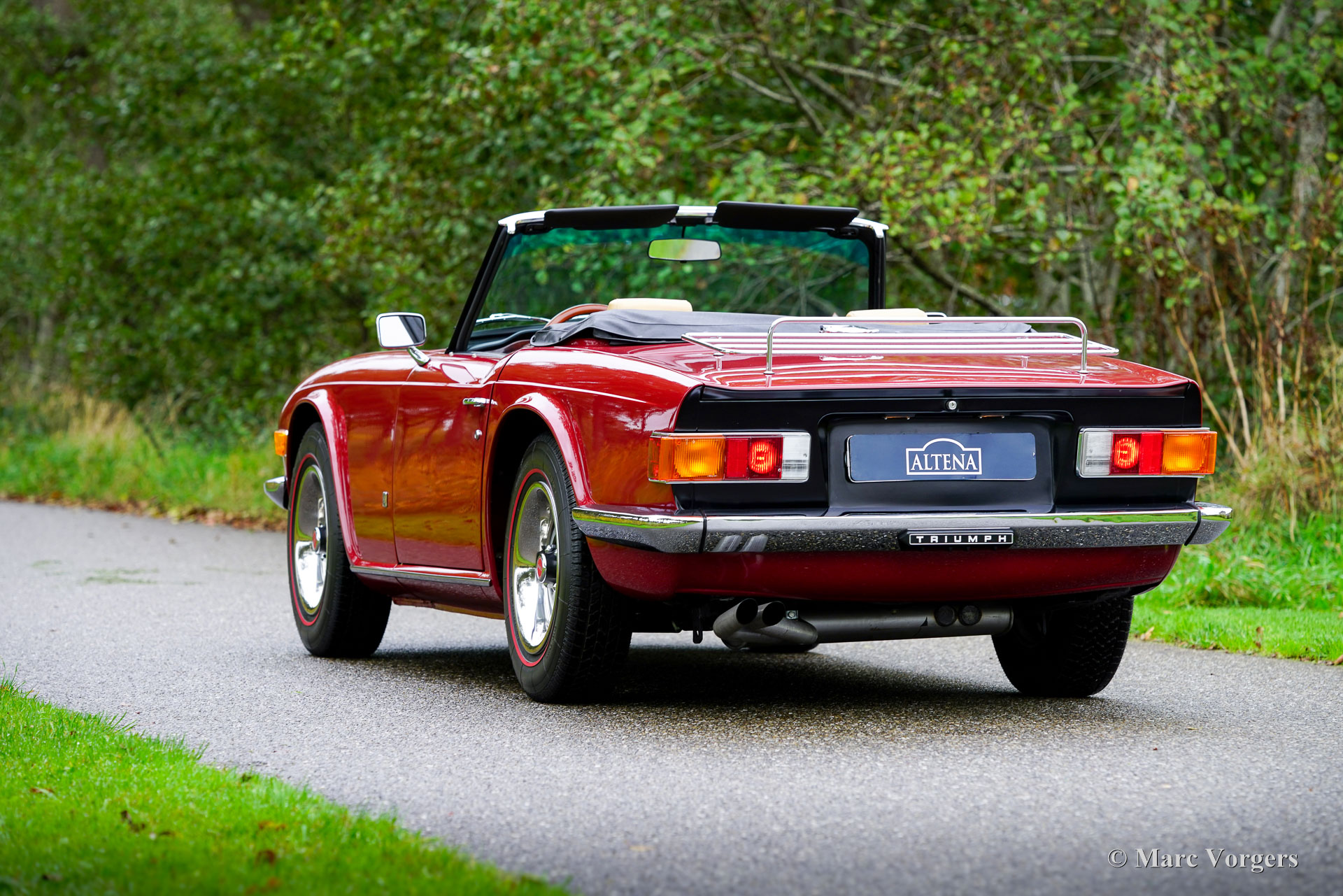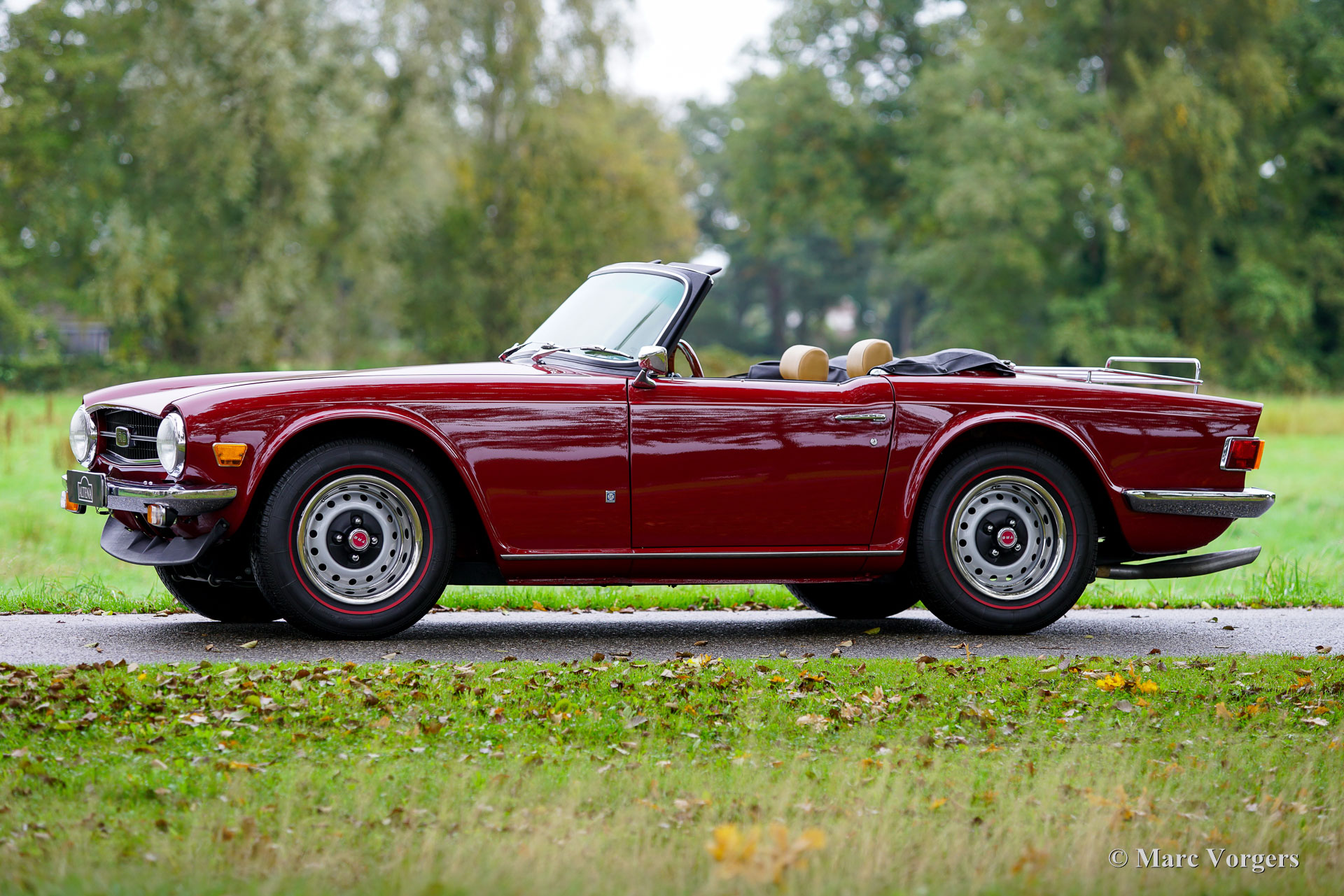 Triumph TR6, Baujahr (November) 1974 (Erstzulassung 1975). ‚Matching numbers‘, ein Heritage-Dokument liegt zur Bestätigung vor. Karosserie in der wunderschönen Farbe Karminrot, kombiniert mit beiger (tan) Kunstlederausstattung und hellbeigem (Magnolia) Teppich. Dieser feine TR6 ist an seiner höheren Frontstoßstange mit den darunter angebrachten Blinkern sofort als Auto des Modelljahres 1975 zu erkennen. Die zweifarbigen orange-weißen Blinker Gläser sind spezifisch für dieses Modelljahr. Dieser TR6 wurde neu in Halifax, Kanada, verkauft. Im Zeitraum 2008 – 2012 wurde das Auto in Kanada restauriert, Rechnungen in Höhe von bis zu 25.000 € sind in der Verlaufsdatei vorhanden. Im Jahr 2020 wurde das Auto in die Niederlande verschifft, wo es 2023 für den Straßenverkehr zugelassen wurde. Der niederländische Besitzer perfektionierte das Auto bis ins kleinste Detail, und in unserer Werkstatt wurden die Hinterachsen, die Vergaser und die Kupplung überholt bzw. erneuert. Dieser wundervolle Triumph TR6 ist in ausgezeichnetem Zustand (sieht aus wie neu!) und ist absolut auf dem neuesten Stand. Dieser TR6 präsentiert sich in einer wunderschönen Farbkombination. Die karminrote Karosseriefarbe, die hellbraunen Sitze und der Magnolia-Teppich harmonieren wunderbar mit dem fantastischen Armaturenbrett aus hochglänzendem Walnussholz! Der Reihensechszylindermotor atmet noch immer durch die originalen Stromberg-Vergaser, das originale Luftfiltergehäuse und die originale (natürlich erneuerte) Stahlauspuffanlage; der Auspuffsound dieses Autos ist absolut zeitgemäß! Dieser TR6 verfügt über eine Kipphebelabdeckung aus Aluminium, ein Sportlenkrad mit Holzkranz, einen Gepäckträger aus Edelstahl, Scheibenwischer aus Edelstahl und ein Paar türmontierte Chrom Rückspiegel. Dieser hochwertige Triumph TR6 ist bereit, in vollen Zügen genossen zu werden!