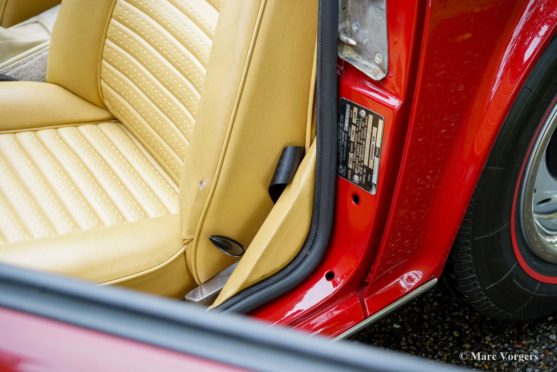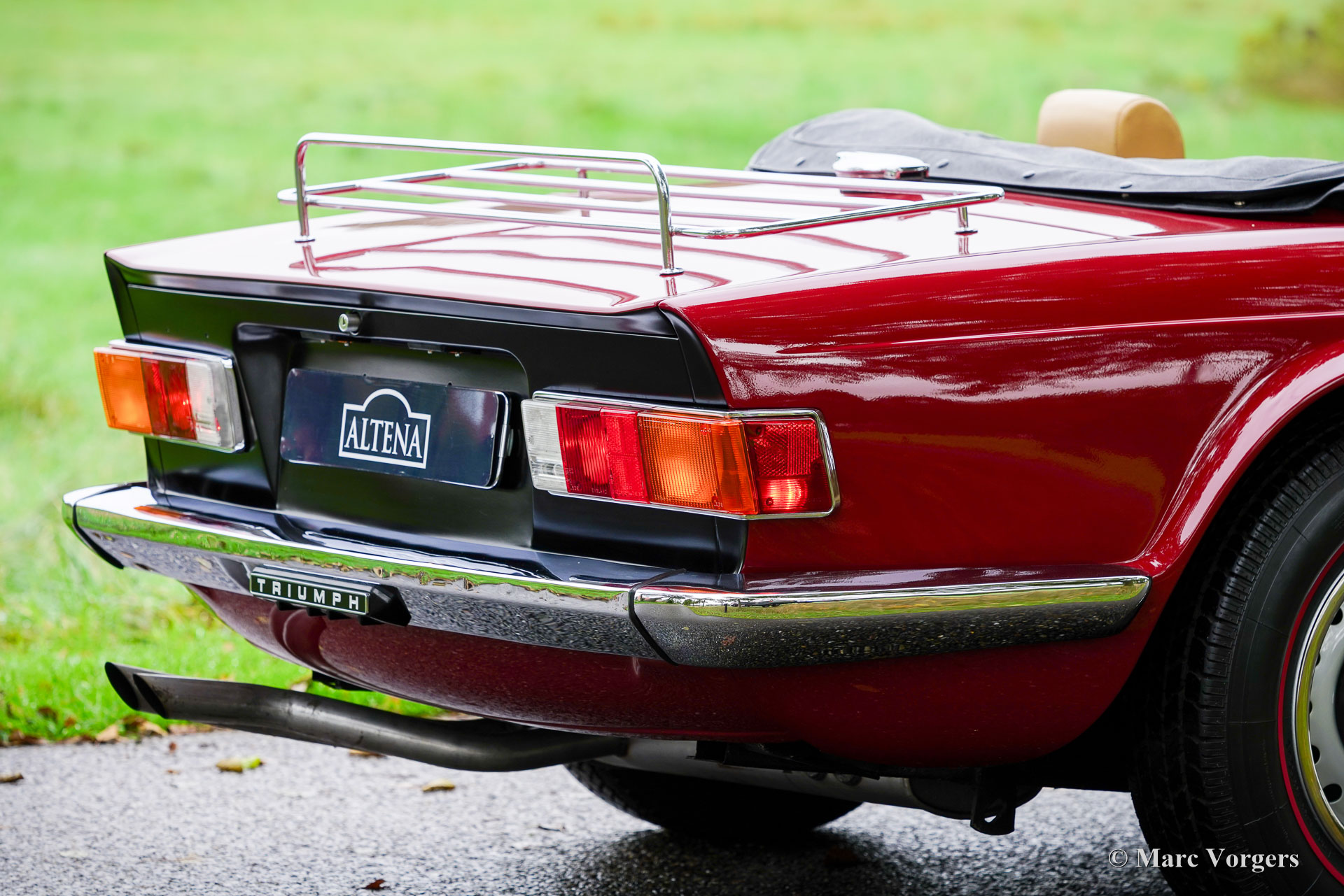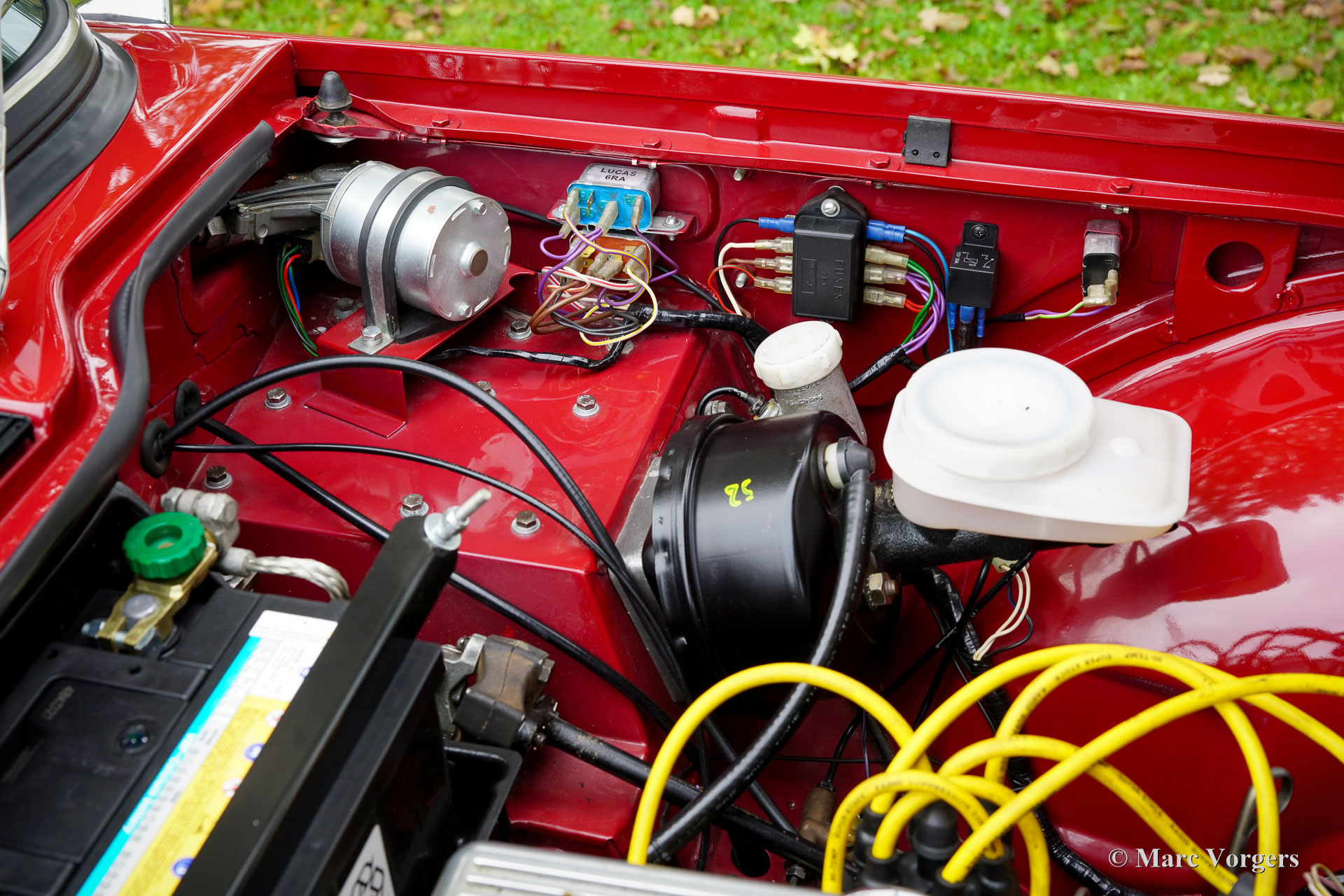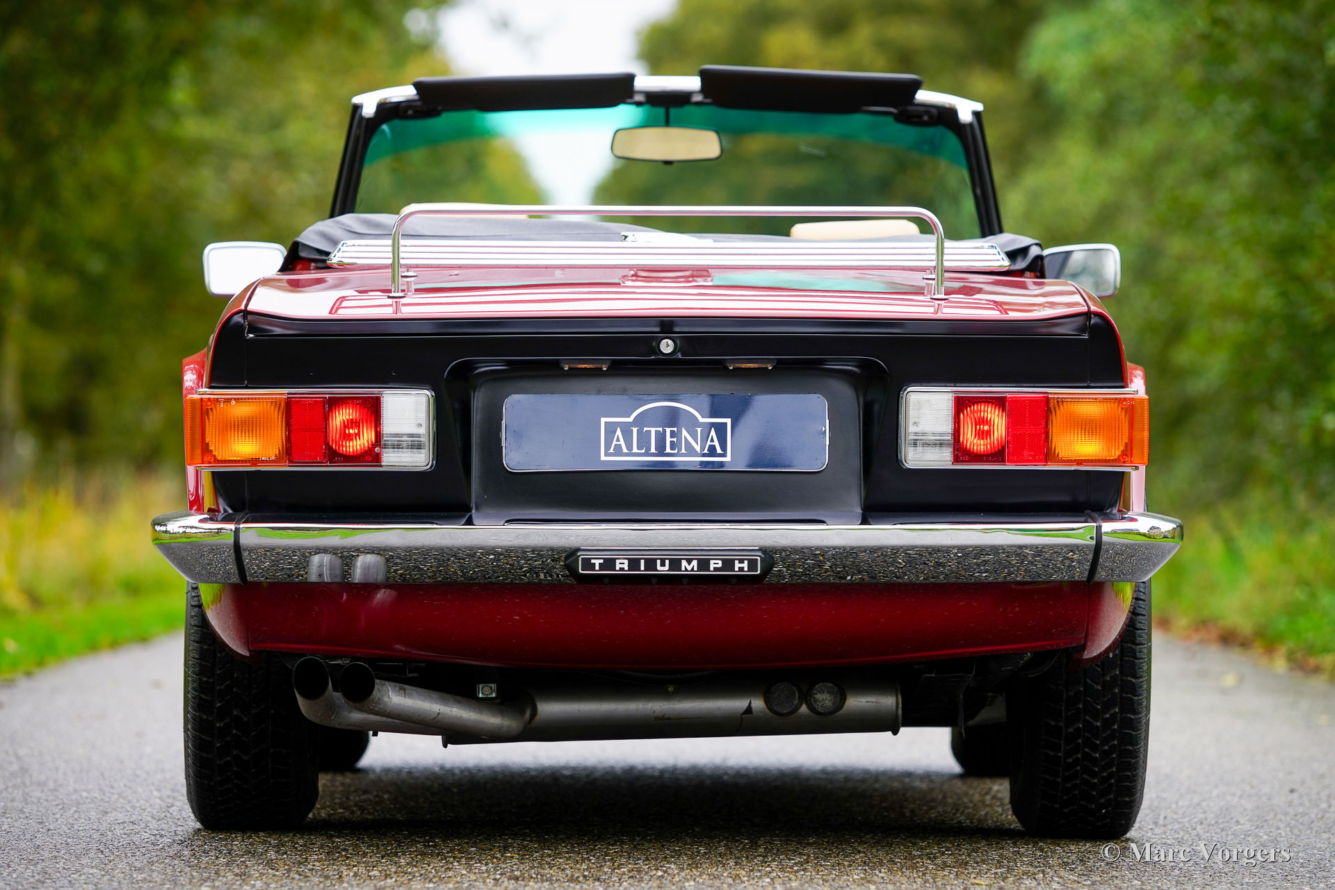Triumph TR6, Baujahr (November) 1974 (Erstzulassung 1975). ‚Matching numbers‘, ein Heritage-Dokument liegt zur Bestätigung vor. Karosserie in der wunderschönen Farbe Karminrot, kombiniert mit beiger (tan) Kunstlederausstattung und hellbeigem (Magnolia) Teppich. Dieser feine TR6 ist an seiner höheren Frontstoßstange mit den darunter angebrachten Blinkern sofort als Auto des Modelljahres 1975 zu erkennen. Die zweifarbigen orange-weißen Blinker Gläser sind spezifisch für dieses Modelljahr. Dieser TR6 wurde neu in Halifax, Kanada, verkauft. Im Zeitraum 2008 – 2012 wurde das Auto in Kanada restauriert, Rechnungen in Höhe von bis zu 25.000 € sind in der Verlaufsdatei vorhanden. Im Jahr 2020 wurde das Auto in die Niederlande verschifft, wo es 2023 für den Straßenverkehr zugelassen wurde. Der niederländische Besitzer perfektionierte das Auto bis ins kleinste Detail, und in unserer Werkstatt wurden die Hinterachsen, die Vergaser und die Kupplung überholt bzw. erneuert. Dieser wundervolle Triumph TR6 ist in ausgezeichnetem Zustand (sieht aus wie neu!) und ist absolut auf dem neuesten Stand. Dieser TR6 präsentiert sich in einer wunderschönen Farbkombination. Die karminrote Karosseriefarbe, die hellbraunen Sitze und der Magnolia-Teppich harmonieren wunderbar mit dem fantastischen Armaturenbrett aus hochglänzendem Walnussholz! Der Reihensechszylindermotor atmet noch immer durch die originalen Stromberg-Vergaser, das originale Luftfiltergehäuse und die originale (natürlich erneuerte) Stahlauspuffanlage; der Auspuffsound dieses Autos ist absolut zeitgemäß! Dieser TR6 verfügt über eine Kipphebelabdeckung aus Aluminium, ein Sportlenkrad mit Holzkranz, einen Gepäckträger aus Edelstahl, Scheibenwischer aus Edelstahl und ein Paar türmontierte Chrom Rückspiegel. Dieser hochwertige Triumph TR6 ist bereit, in vollen Zügen genossen zu werden!