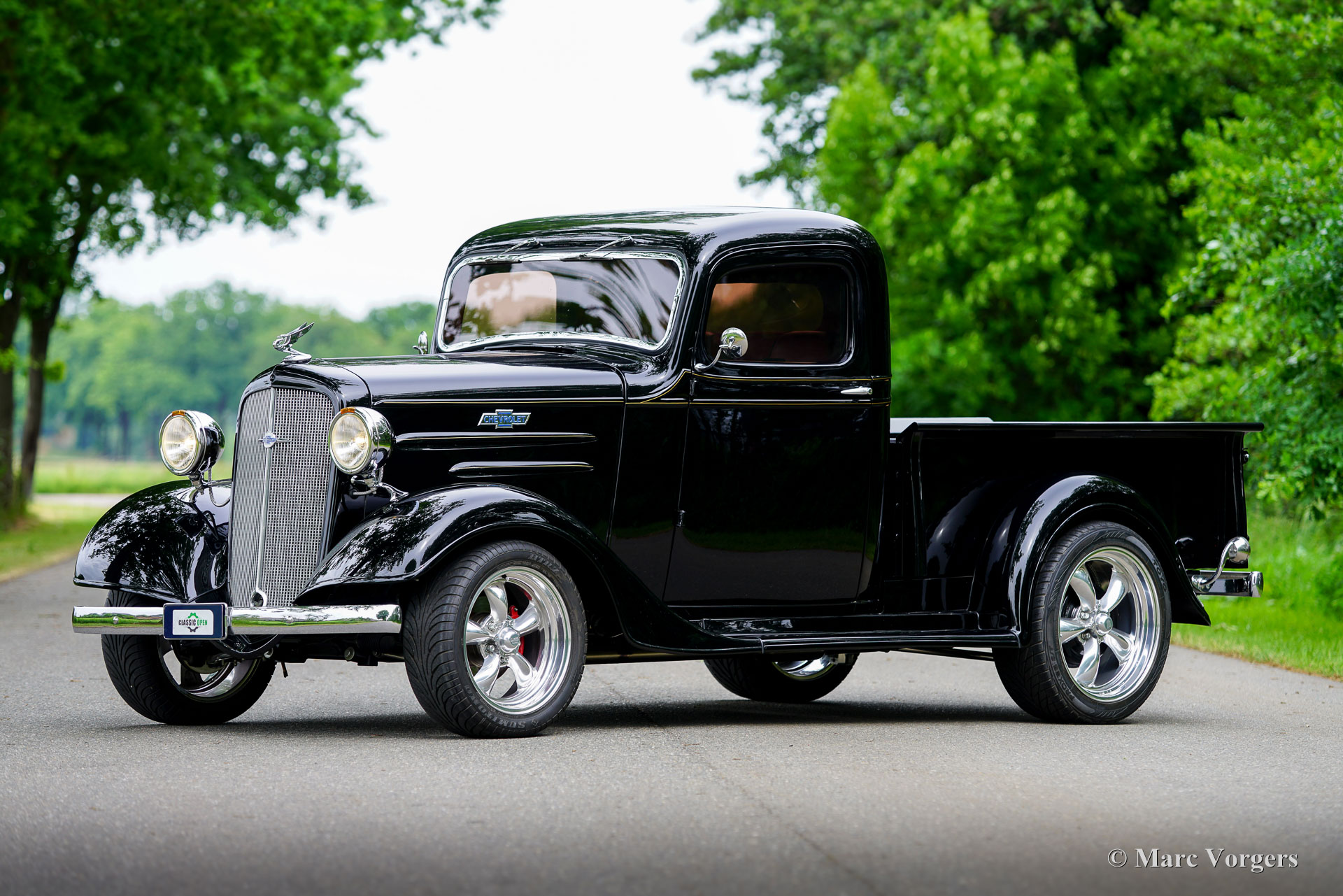 Chevrolet Pick-Up Restomod, Jahr 1936. Dieser Chevrolet ist schwarz lackiert und ausgestattet mit einem rot/schwarzem Leder Interieur. Das Auto wurde in den Niederlanden umfassend restauriert und modernisiert. Er bewahrt die originale Vorkriegslinie und verfügt gleichzeitig über moderne mechanische und optische Verbesserungen – ein einzigartiges Angebot für alle, die klassisches Design gepaart mit verbesserter Leistung und atemberaubender Optik schätzen! Dieser Chevrolet Pick-Up wurde in einem Übergangsjahr gebaut. Das Modell vereint Designmerkmale der 1935er Serie mit neuen Merkmalen des kommenden 1937er Stils und ist somit selten und unverwechselbar. Nur wenige tausend Exemplare wurden gebaut, was das 1936er Modell zu einem seltenen Sammlerstück macht. Dieses Restomod ist wunderschön gebaut und verarbeitet und fährt perfekt. Dieser einzigartige Chevrolet Restomod wird mit niederländischen Papieren und Zulassung geliefert. Ein einzigartiger Fund und ein echter Hingucker!