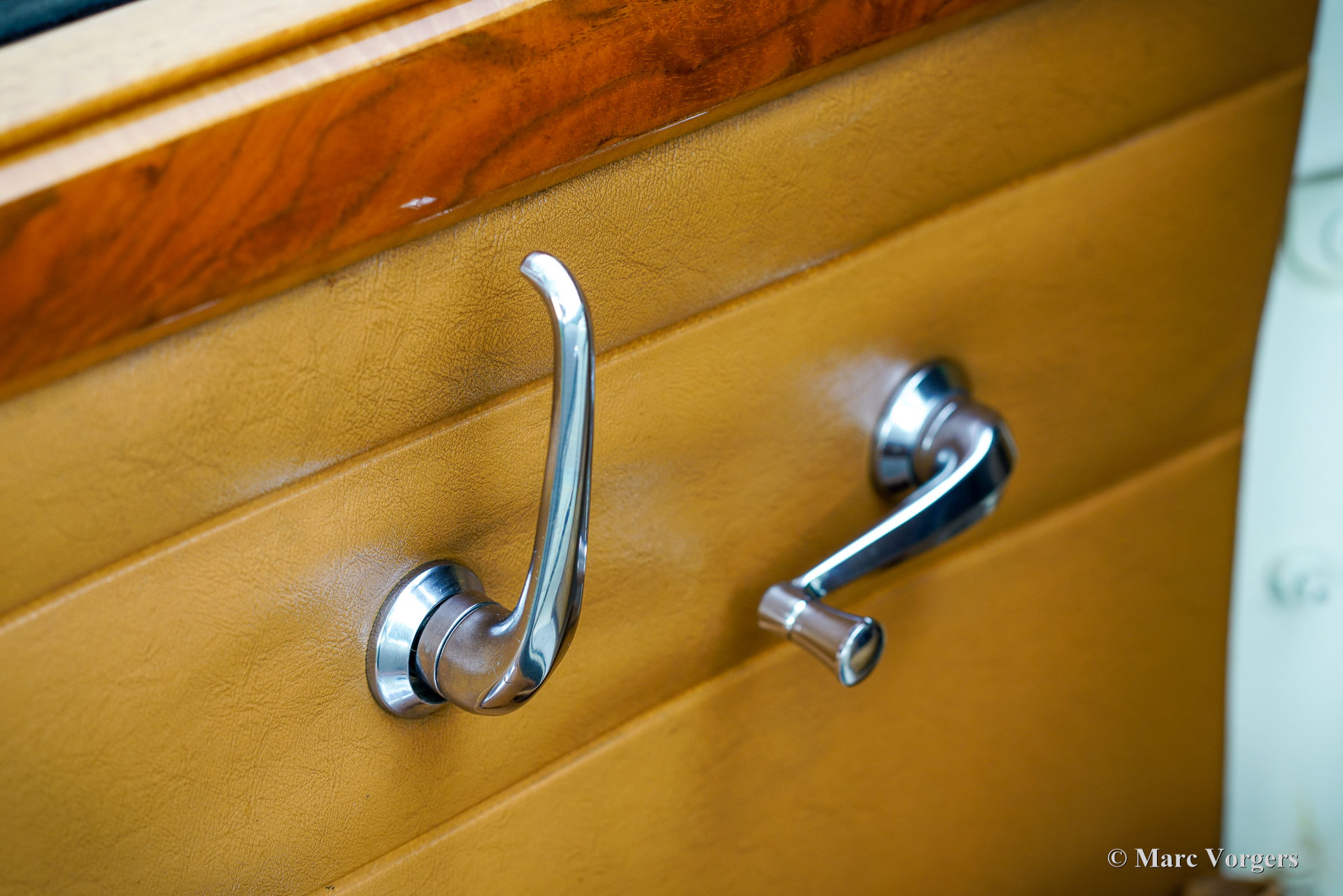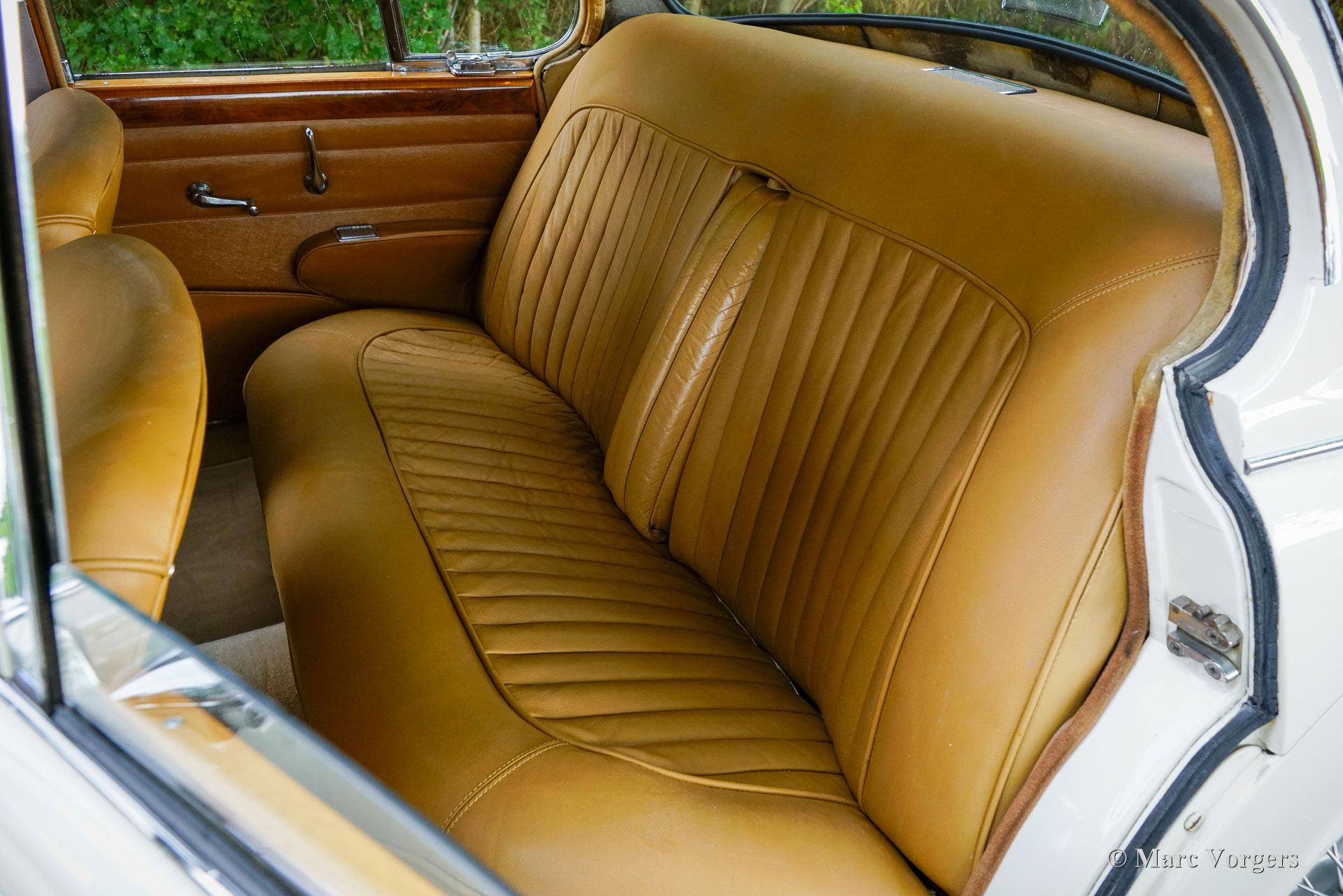 Jaguar 340, Jahr 1968. Farbe Old English White kombiniert mit beigem Lederinterieur und beigem Teppich. Der Jaguar 340 ist die letzte Inkarnation des berühmten Jaguar Mk II mit einem überarbeiteten Motorkopf, schlankeren Chromstoßstangen, entfernten Nebelscheinwerfern vorne und entfernten herunterklappbaren „Tischen“ an den Rückseiten der Vordersitze. Der Jaguar 340 ist ein seltenes Jaguar-Modell. In den Jahren 1967 und 1968 wurden nur 2.630 Exemplare gebaut. Der Reihensechszylinder-Motor in Kombination mit dem manuell betätigten Vierganggetriebe macht den Jaguar 340 zu einer sportlichen Limousine! Dieser Jaguar 340 ist ausgestattet mit Servobremsen, Overdrive, Speichenrädern und einem MotoLita-Lenkrad mit Holzkranz. Das Lenkrad ist im Vergleich zur originalen Lenkradgröße etwas kleiner.