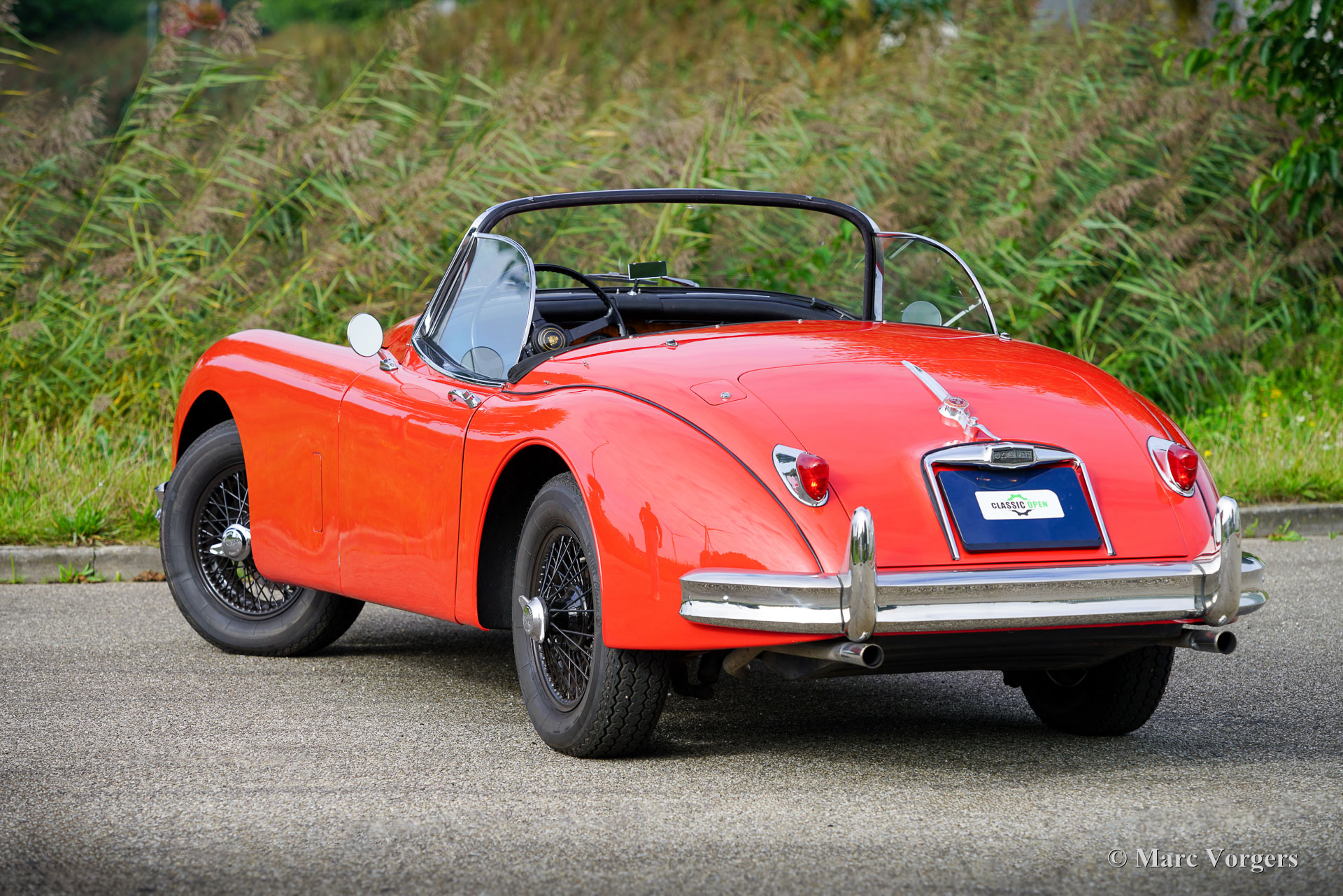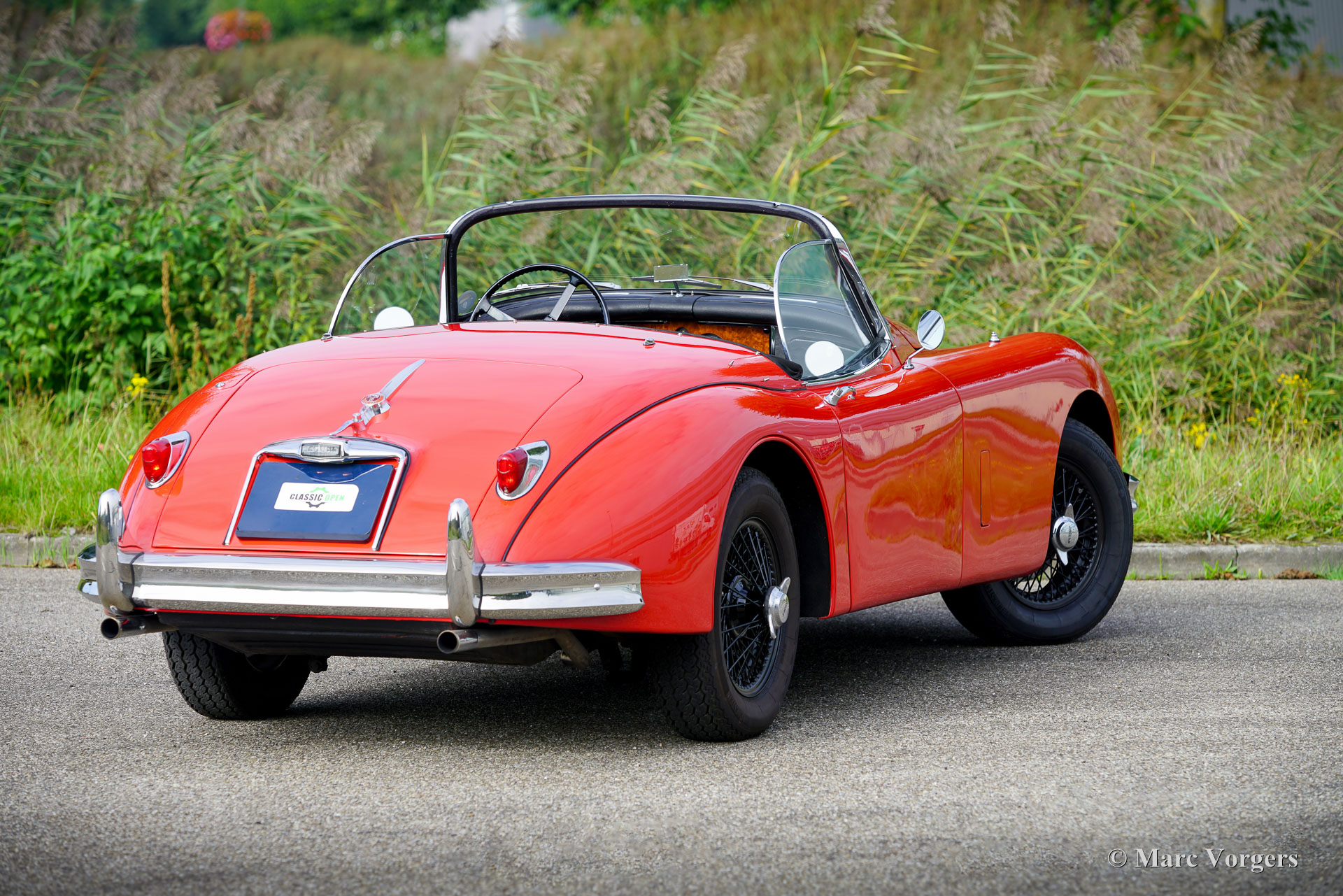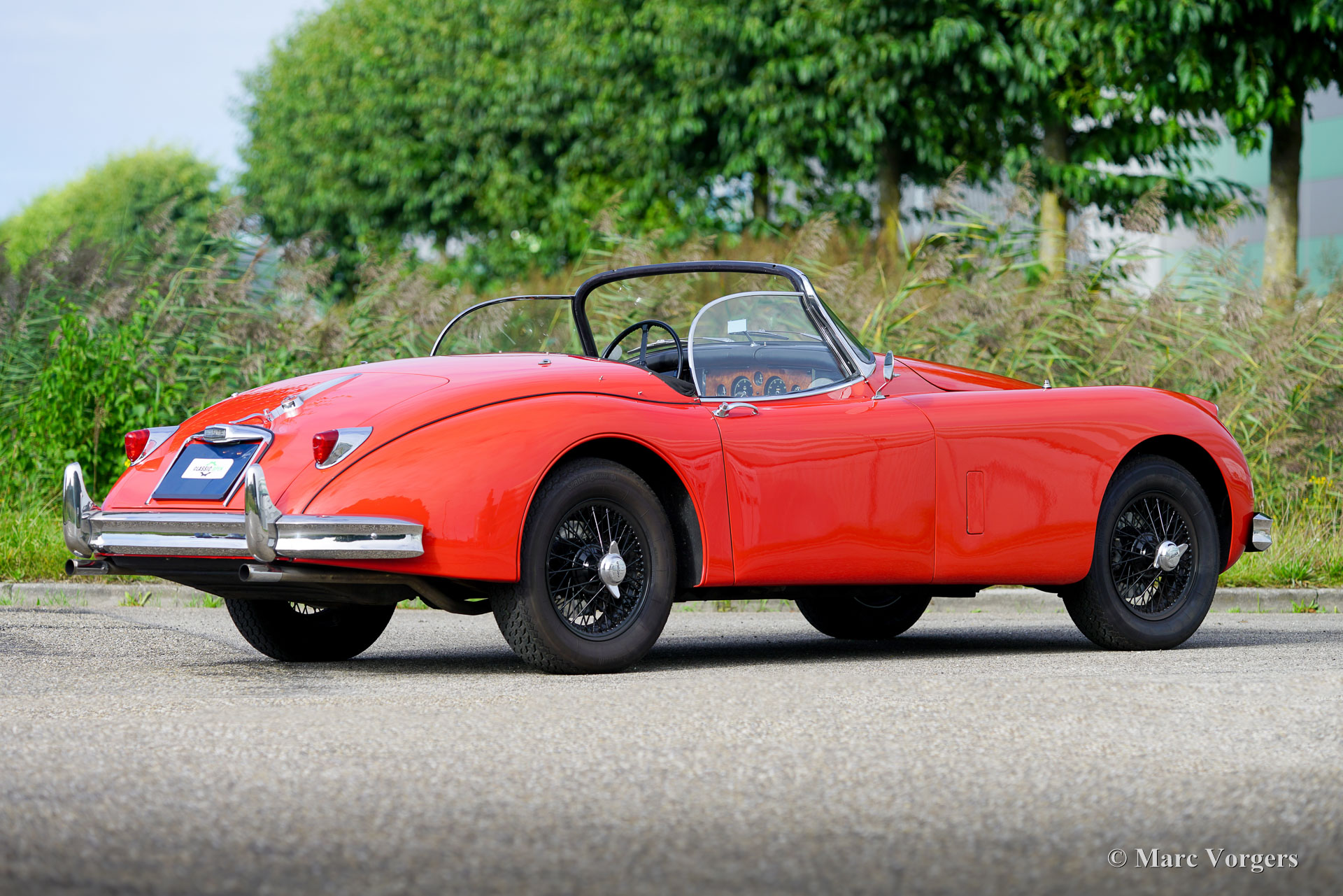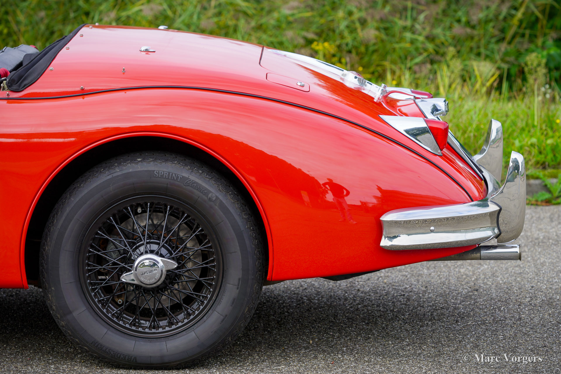 Jaguar XK 150 3,4 Liter OTS (Roadster), Jahr 1959. Farbe rot (Carmen red) kombiniert mit einer schwarzen Lederausstattung mit schwarzem Teppich. Schwarzes Verdeck und Persenning. Dieser prächtige Jaguar XK 150 OTS (Open Two Seater, in den USA auch Roadster genannt) wurde in den Vereinigten Staaten neu verkauft. Das Auto wurde 1986 in die Niederlande importiert und 2001 vom letzten Besitzer gekauft. Die (Wartungs-)Historie ist ab 2009 vollständig dokumentiert. Ein Heritage-Zertifikat ist vorhanden und die Informationen besagen, dass dies ein Jaguar mit „Matching Numbers“ ist! Das Auto ist in einem sehr guten Zustand und alles ist auf dem neuesten Stand. Die Karosserie zeigt eine perfekte Passung der Paneele, eine schöne Lackierung und wunderbare Chromteile. Der Sechszylinder-XK-Motor wurde 2014 von einem Spezialisten in den Niederlanden Komplett überholt. 2016 wurde eine elektrische Servolenkung von EZ eingebaut. Die 215 PS werden über ein Viergang-Schaltgetriebe mit Overdrive auf die Hinterräder übertragen. Dieser XK 150 Roadster fährt perfekt, dies ist eines der allerbesten Exemplare, die wir je gefahren sind! Das Auto zeigt alle Originaldetails und verfügt über wünschenswerte Extras wie das mittlere Armaturenbrett in Nuss Holz, 16-Zoll-Speichenräder mit Vredestein Sprint Classic-Reifen, ein Paar Lucas SFT576-Nebel-/Kurvenscheinwerfer an der Vorderseite, Servobremsen, elektronische Zündung, einen elektrischen Kühlerlüfter, rote Sicherheitsgurte und ein „Retro“-Radio mit Navigationssystem. Dies ist ein sehr begehrter Jaguar XK 150 OTS (Roadster) in einem wunderbaren Zustand, ein fantastisches klassisches Fahrerauto, das einem stolzen neuen Besitzer jede Menge Fahrspaß bringen wird. Der Jaguar XK 150 3,4 Liter OTS ist ein seltenes Auto, es wurden nur 1339 Exemplare gebaut.