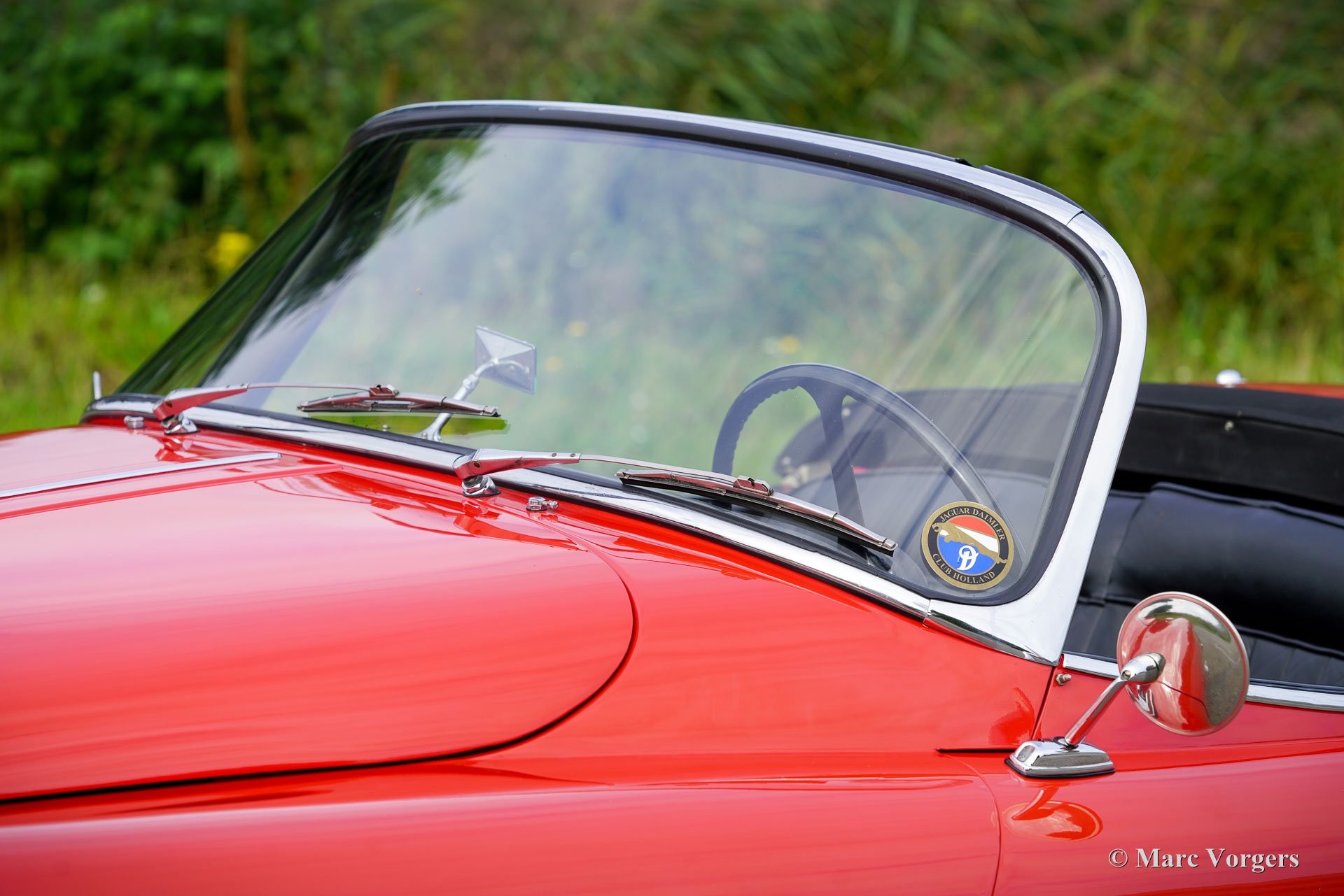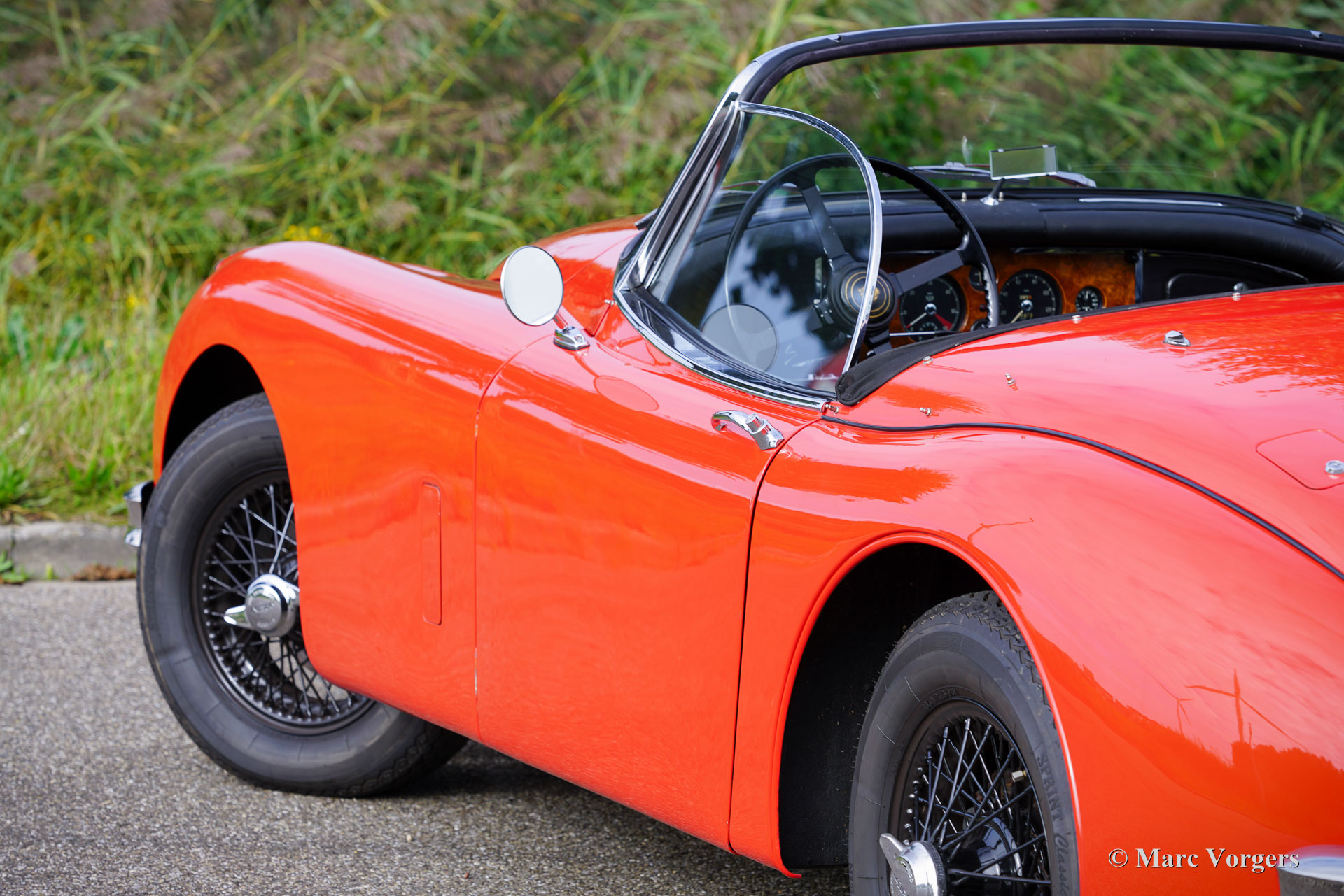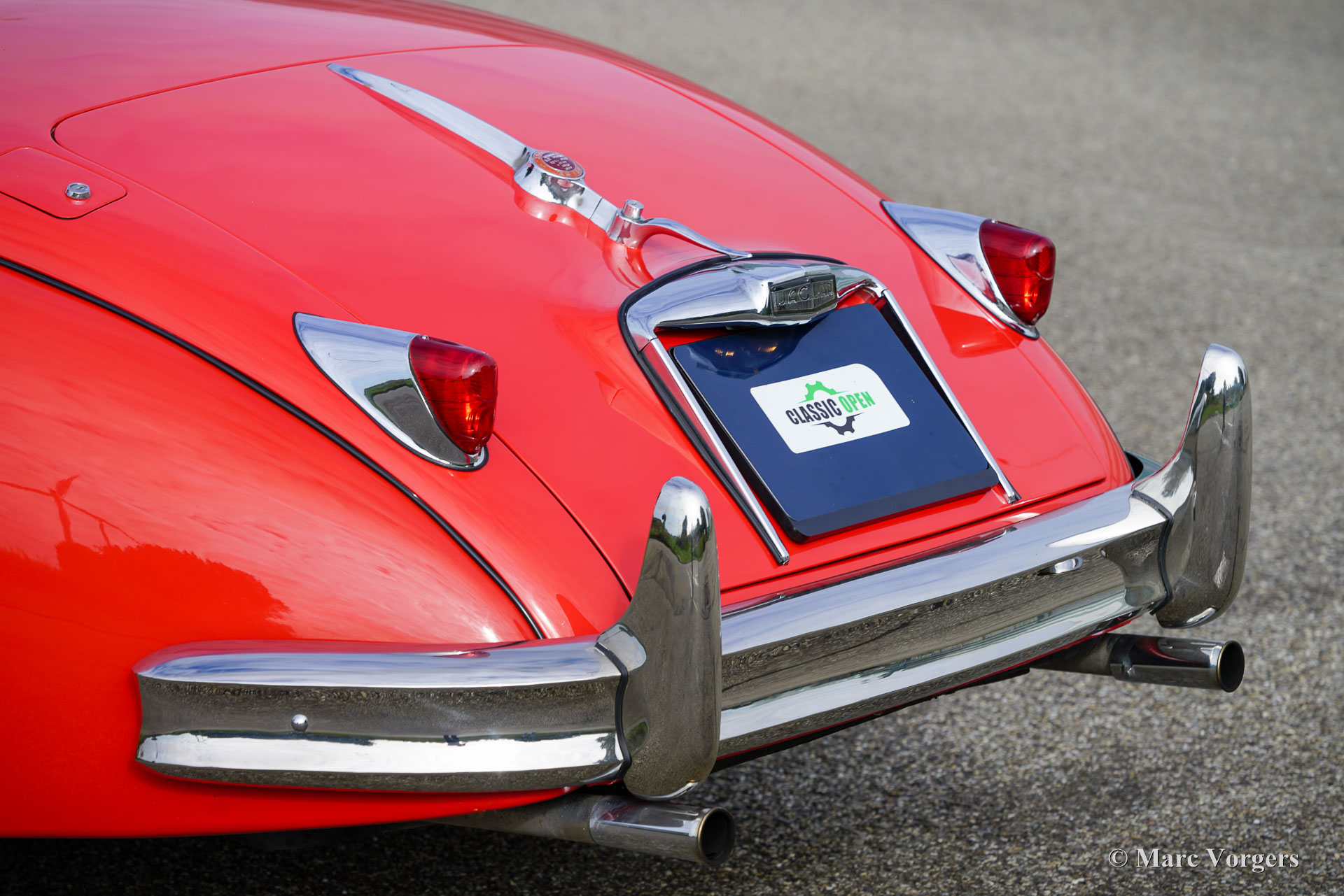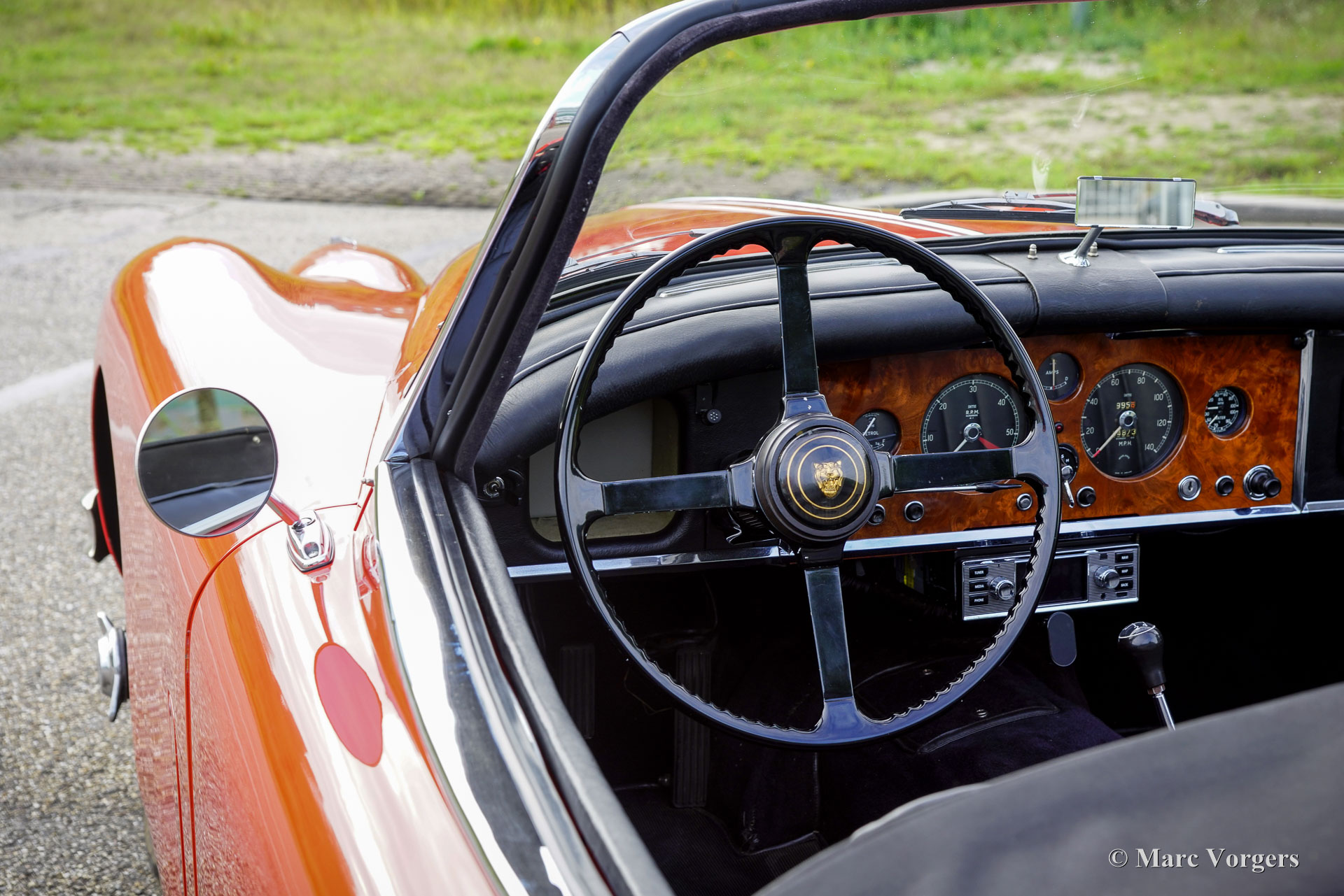 Jaguar XK 150 3,4 Liter OTS (Roadster), Jahr 1959. Farbe rot (Carmen red) kombiniert mit einer schwarzen Lederausstattung mit schwarzem Teppich. Schwarzes Verdeck und Persenning. Dieser prächtige Jaguar XK 150 OTS (Open Two Seater, in den USA auch Roadster genannt) wurde in den Vereinigten Staaten neu verkauft. Das Auto wurde 1986 in die Niederlande importiert und 2001 vom letzten Besitzer gekauft. Die (Wartungs-)Historie ist ab 2009 vollständig dokumentiert. Ein Heritage-Zertifikat ist vorhanden und die Informationen besagen, dass dies ein Jaguar mit „Matching Numbers“ ist! Das Auto ist in einem sehr guten Zustand und alles ist auf dem neuesten Stand. Die Karosserie zeigt eine perfekte Passung der Paneele, eine schöne Lackierung und wunderbare Chromteile. Der Sechszylinder-XK-Motor wurde 2014 von einem Spezialisten in den Niederlanden Komplett überholt. 2016 wurde eine elektrische Servolenkung von EZ eingebaut. Die 215 PS werden über ein Viergang-Schaltgetriebe mit Overdrive auf die Hinterräder übertragen. Dieser XK 150 Roadster fährt perfekt, dies ist eines der allerbesten Exemplare, die wir je gefahren sind! Das Auto zeigt alle Originaldetails und verfügt über wünschenswerte Extras wie das mittlere Armaturenbrett in Nuss Holz, 16-Zoll-Speichenräder mit Vredestein Sprint Classic-Reifen, ein Paar Lucas SFT576-Nebel-/Kurvenscheinwerfer an der Vorderseite, Servobremsen, elektronische Zündung, einen elektrischen Kühlerlüfter, rote Sicherheitsgurte und ein „Retro“-Radio mit Navigationssystem. Dies ist ein sehr begehrter Jaguar XK 150 OTS (Roadster) in einem wunderbaren Zustand, ein fantastisches klassisches Fahrerauto, das einem stolzen neuen Besitzer jede Menge Fahrspaß bringen wird. Der Jaguar XK 150 3,4 Liter OTS ist ein seltenes Auto, es wurden nur 1339 Exemplare gebaut.